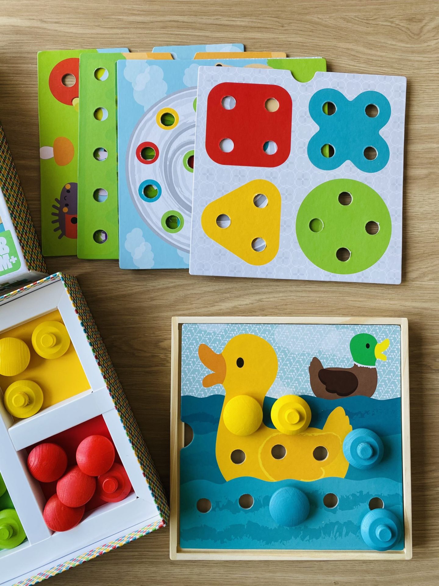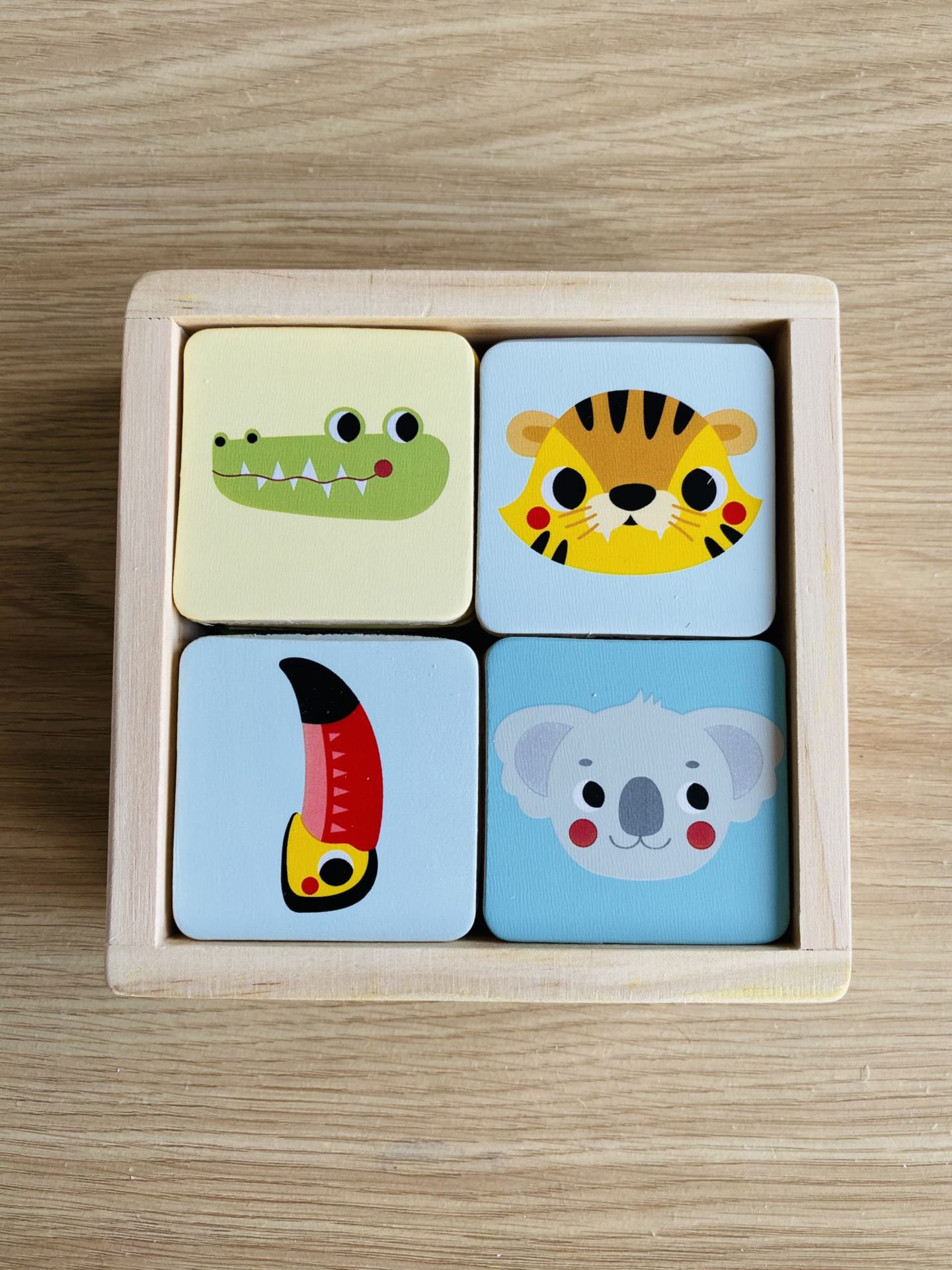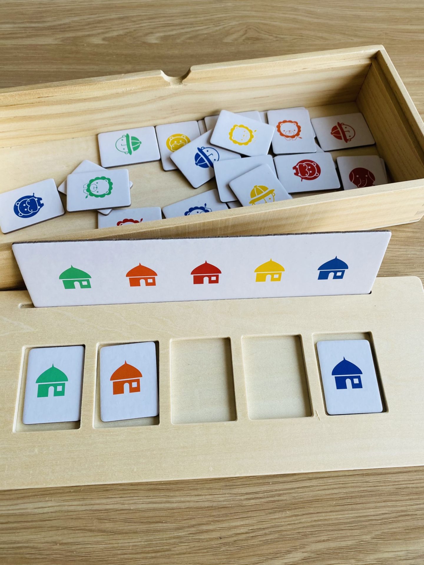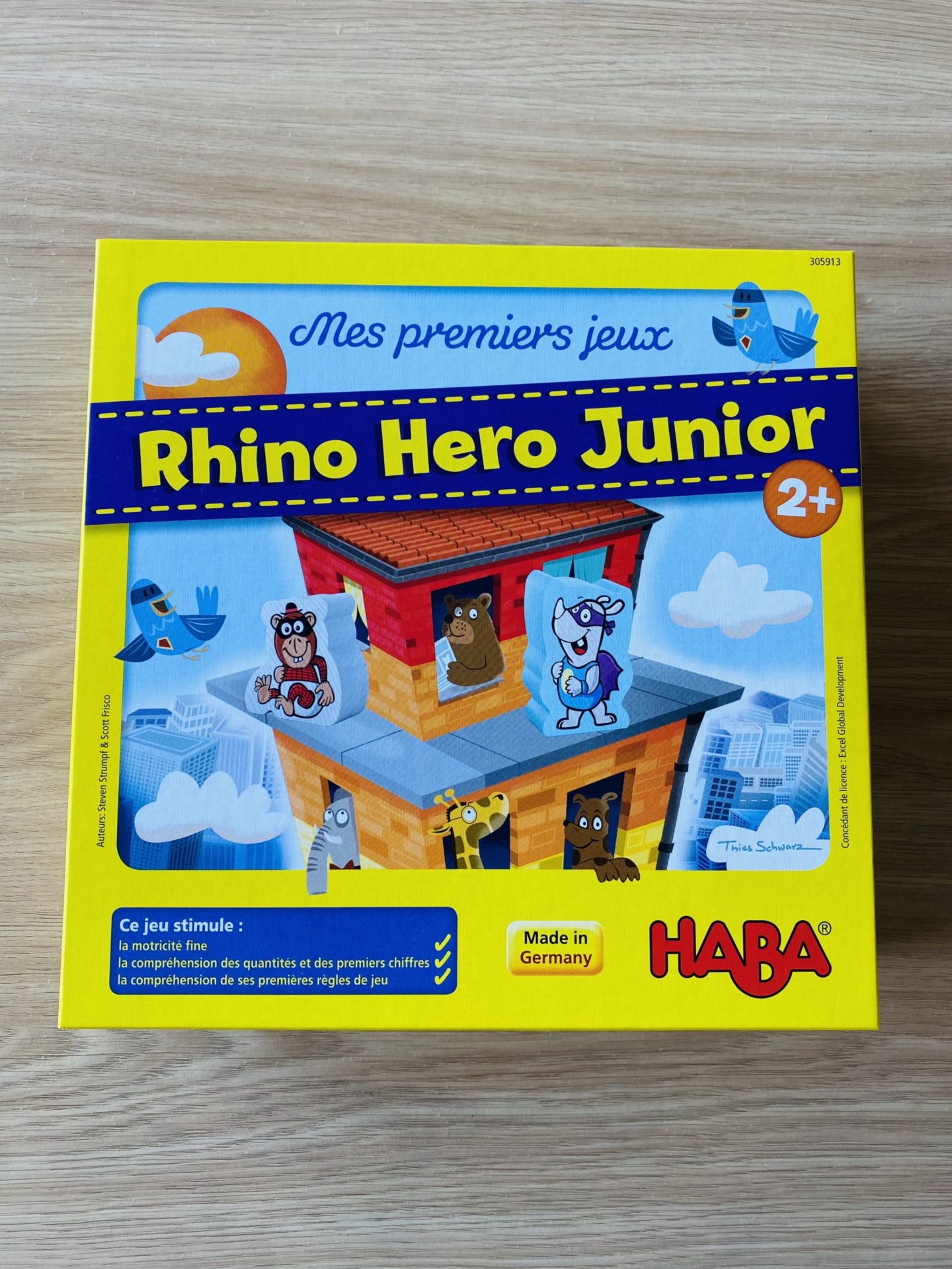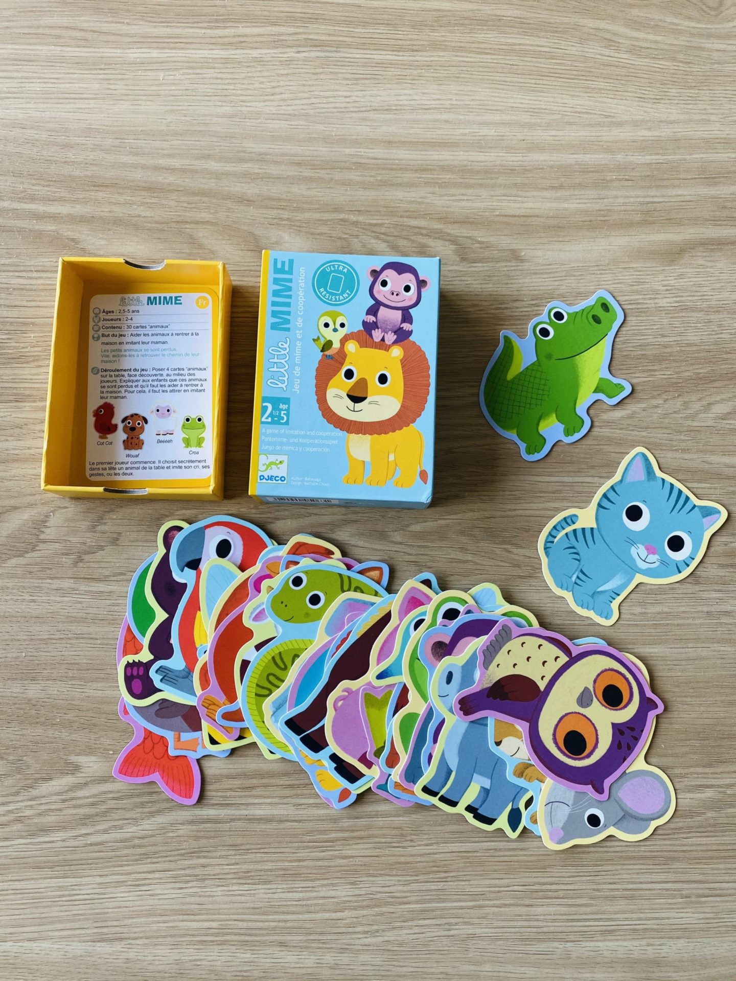 Côté jeux, il a pas mal récupéré ceux de Louise, comme par exemple les bébés animaux de Nathan, le Saute-nuages d’Haba, le loto et les puzzle duo de Djeco. Néanmoins, j’avais repéré des petits jeux éducatifs en boix pour découvrir les couleurs et les formes. Il a eu un jeu dédié aux couleurs, l’Educolor de Nature & Découvertes, ainsi qu’un autre jeu plus complexe qui mixe formes et couleurs de chez Oxybul. Ce n’est pas pour tout de suite, mais il a eu le jeu de cartes Little Mime. C’est un petit jeu pour travailler le vocabulaire et les sons des animaux. D’ici quelques semaines, ce sera un super jeu. Il a aussi eu les jeux de société Rhino Hero et Les petites souris mais de la même façon, ce n’est pas pour tout de suite.