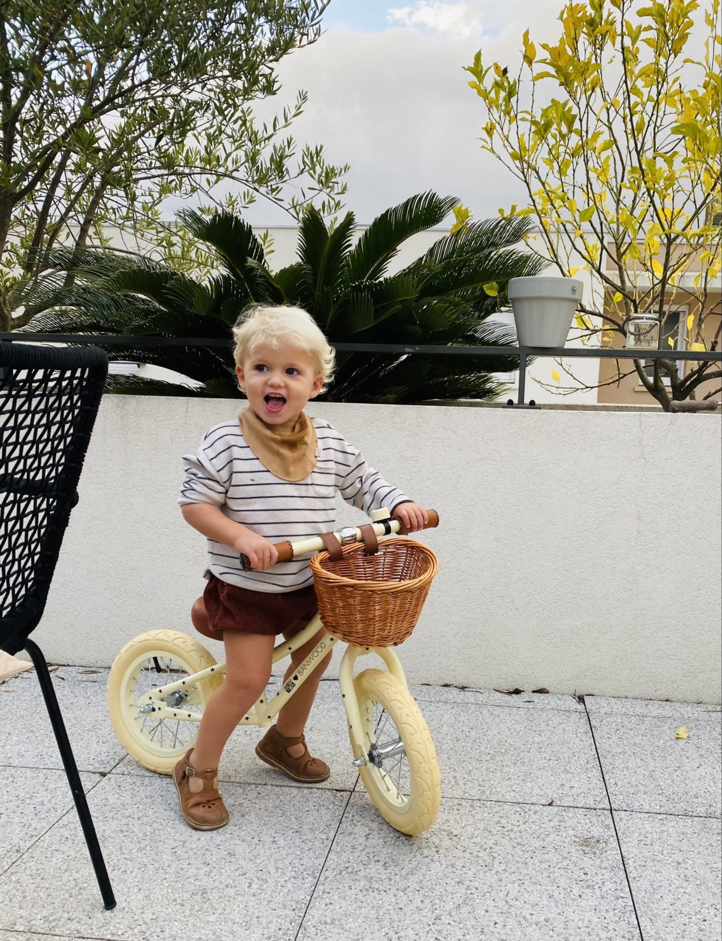 Pour commencer, Jules a eu une draisienne, quasiment la même que sa soeur, et il en est fan ! Il est très orienté motricité, il avait déjà un petit vélo à 4 roues depuis l’âge d’un an, il fait de la trottinette depuis ses 15 mois et il avait hâte d’avoir les pieds qui touchent par terre sur une draisienne. C’est donc l’édition Bonton de la Banwood, beige avec des petites étoiles noires, et évidemment le petit panier à l’avant pour ranger le doudou !