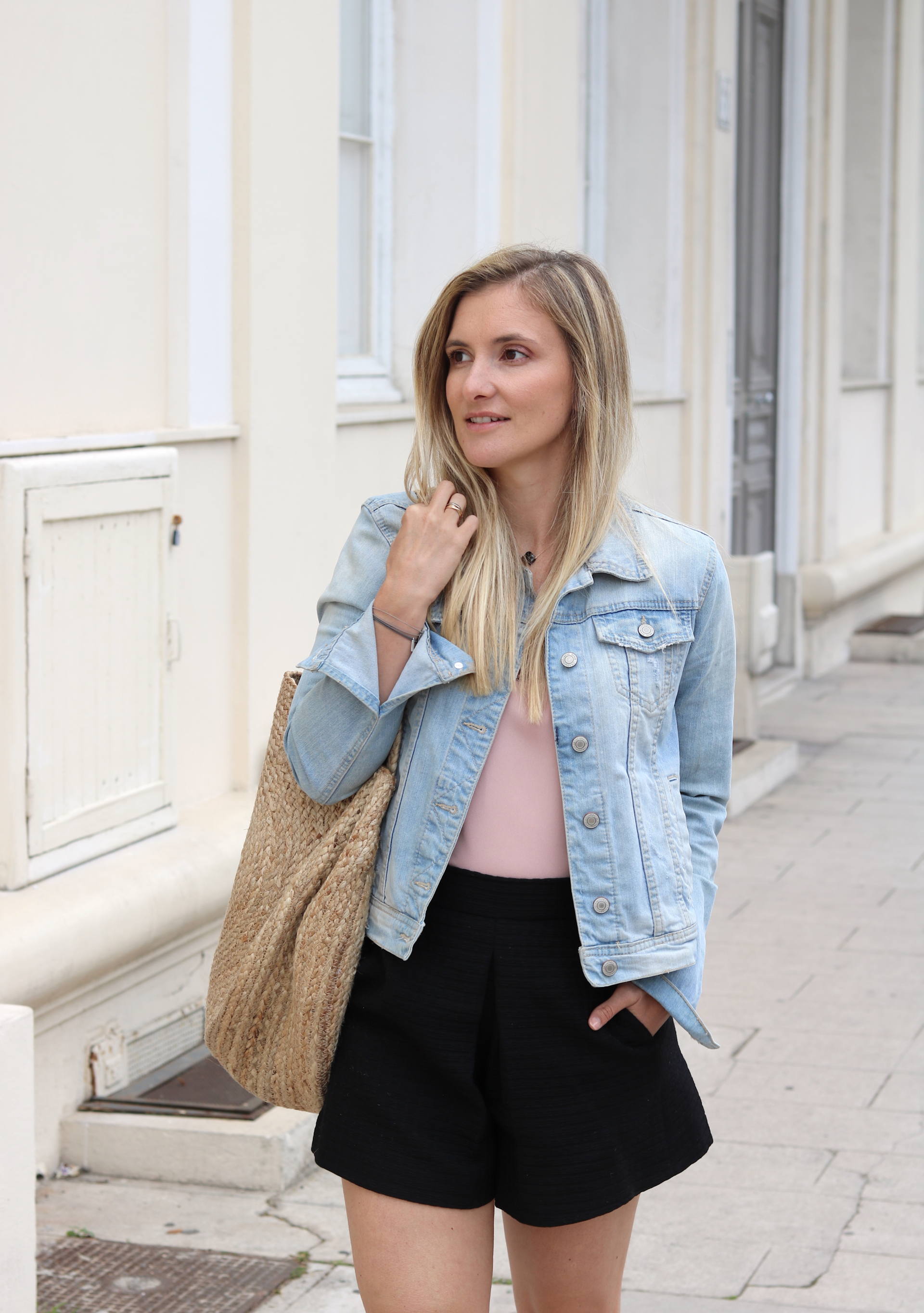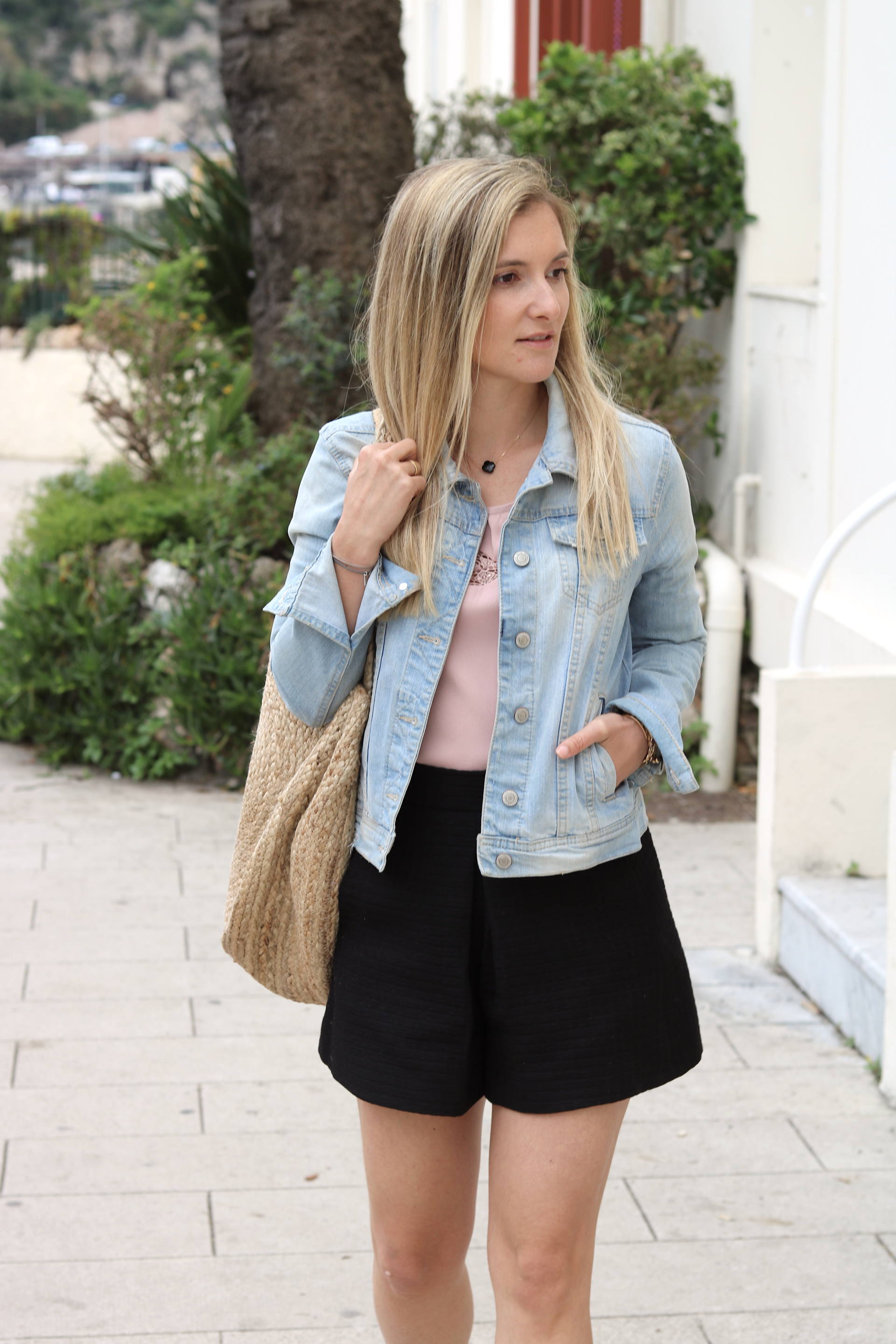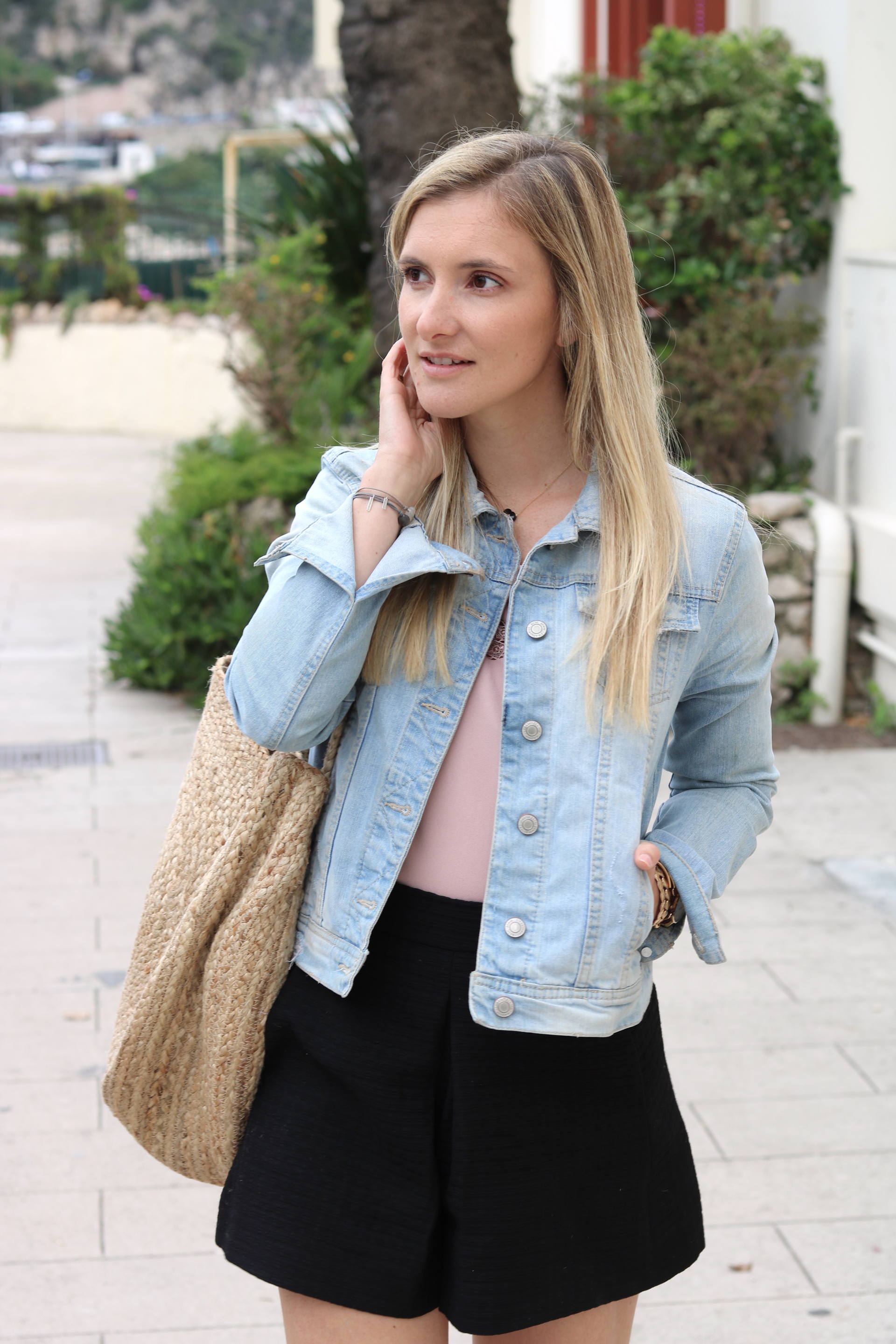 LOOK : Top Collection IRL (sold out) / Short Maje (old) / Veste Stradivarius (old) / Babies Jonak (en soldes !) / Panier Mango / Bracelets L’Atelier d’Amaya et Atelier de Solène / Montre Cluse