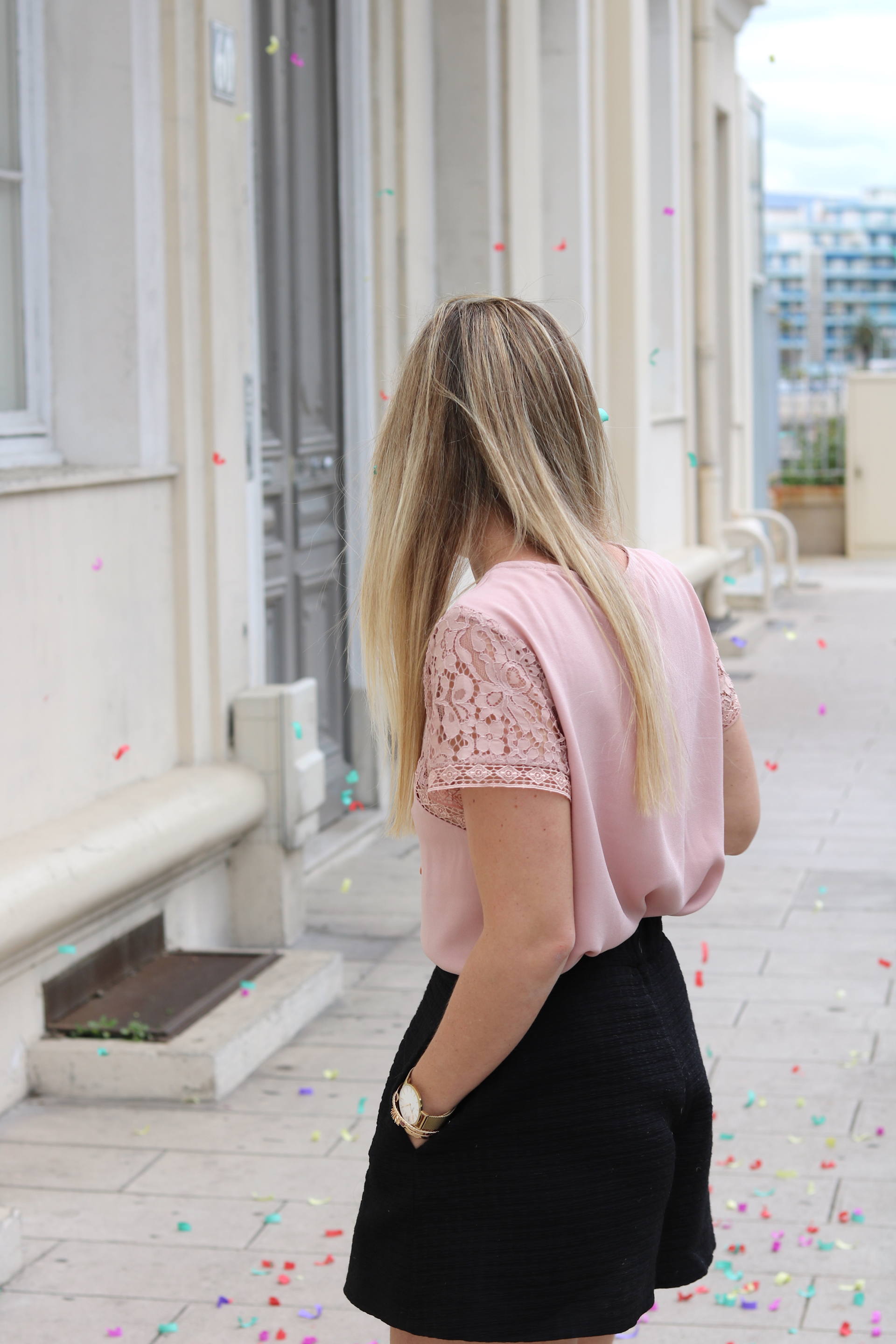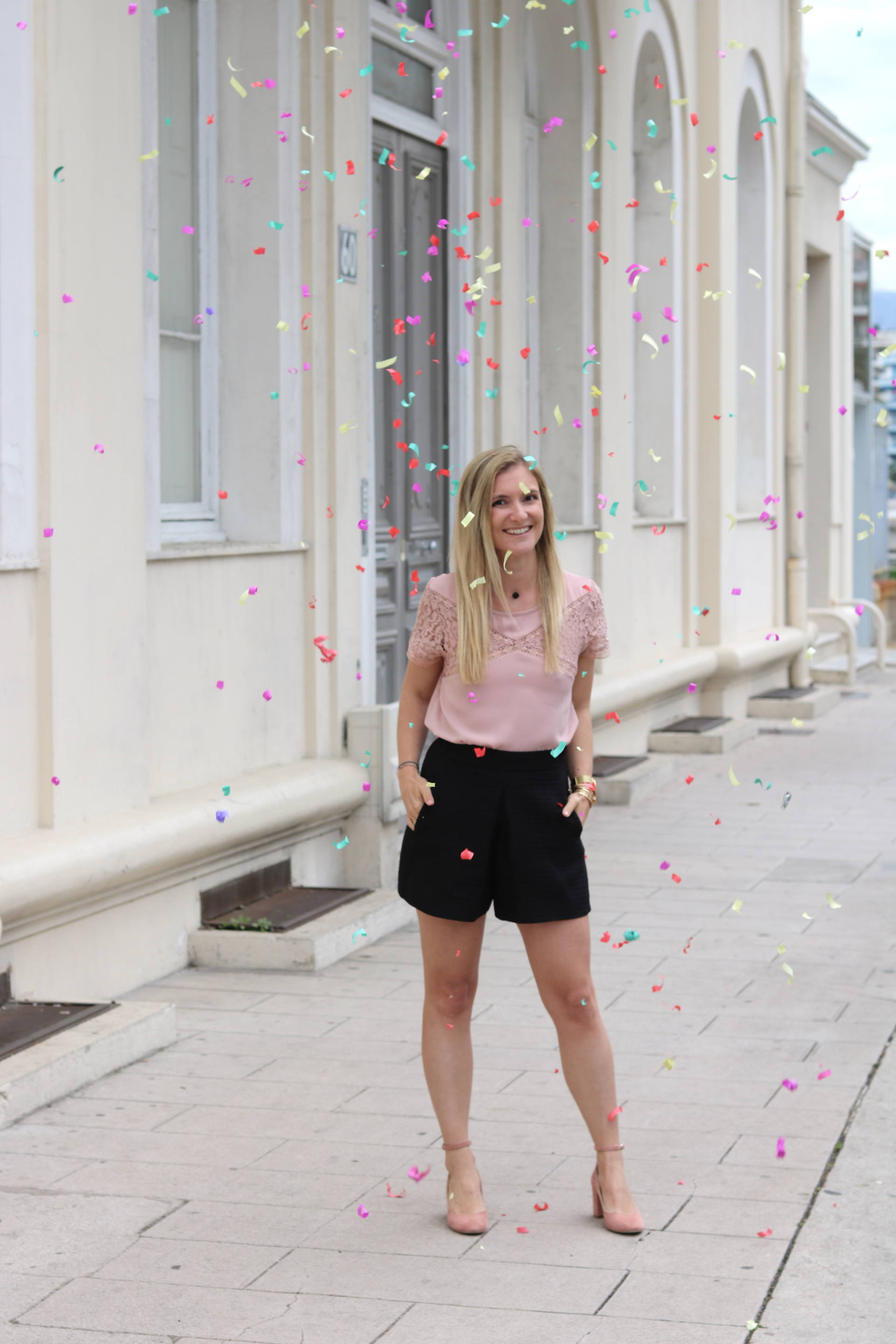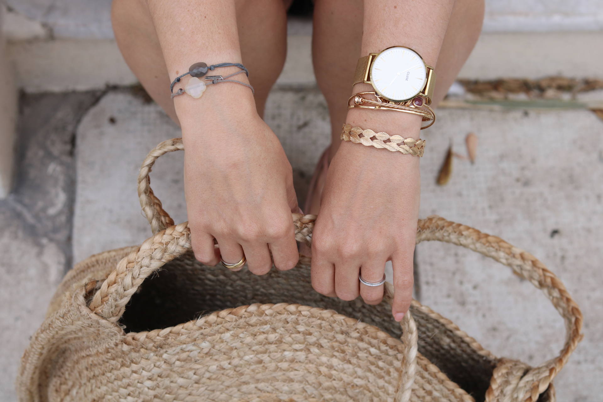 LOOK : Top Collection IRL (sold out) / Short Maje (old) / Veste Stradivarius (old) / Babies Jonak (en soldes !) / Panier Mango / Bracelets L’Atelier d’Amaya et Atelier de Solène / Montre Cluse