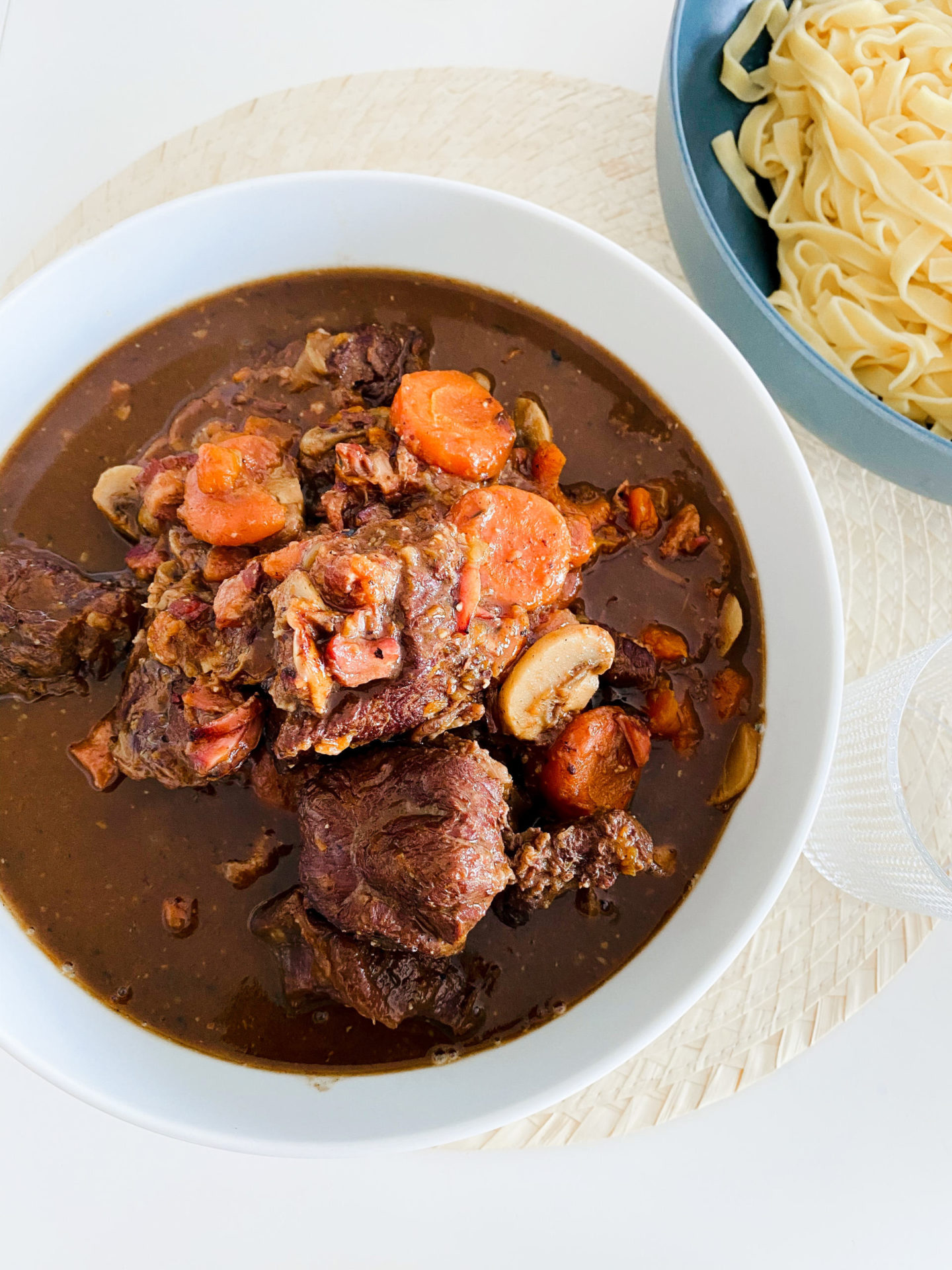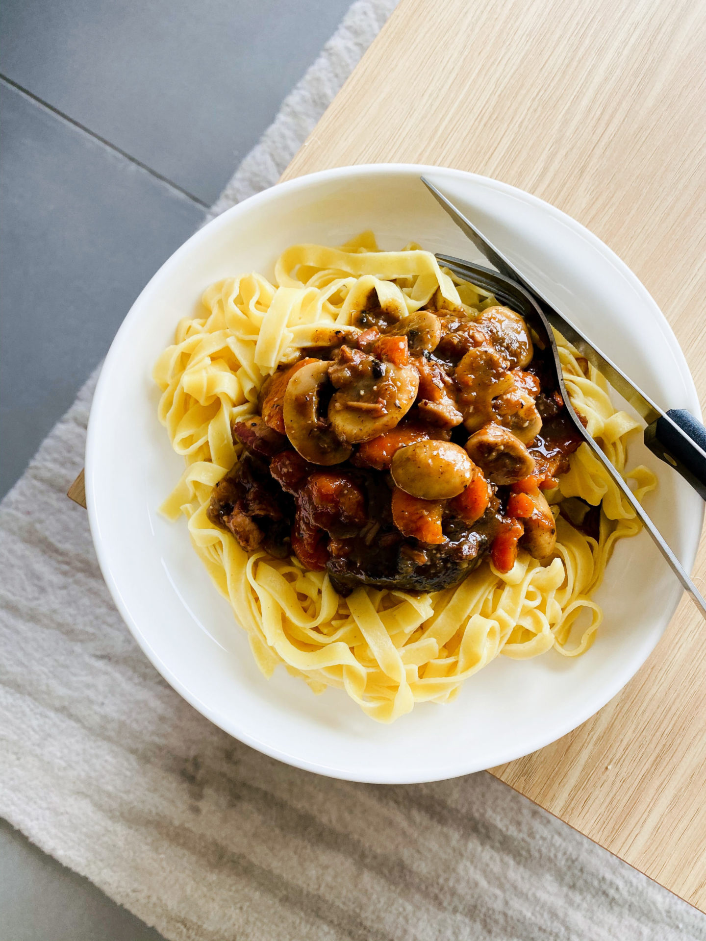 C’est une première fois ! Des lustres que je veux tenter de faire un boeuf bourguignon. J’adore ça mais je n’en avais jamais fait et j’en mange vraiment très rarement ! Ça me rappelle un bon plat en sauce de ma grand-mère, bien servi et bien goûteux. Ça me rappelle aussi quand j’en prends dans un restaurant traditionnel et qu’on sent l’odeur du plat quand il arrive, encore mieux si c’est en montagne en plein hiver. Bref, pour moi, c’est un vrai plat convivial et j’avais envie de tester une première fois avant d’envisager d’en cuisiner un pour des amis en pour un déjeuner en famille.