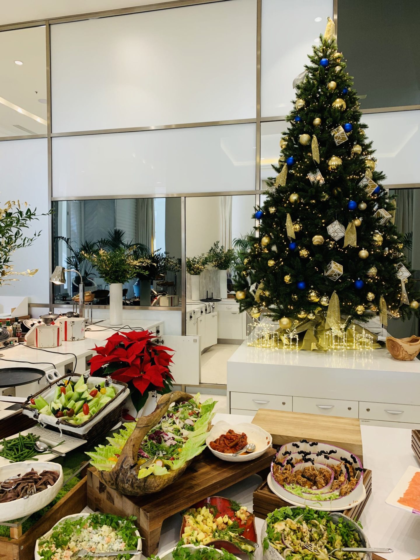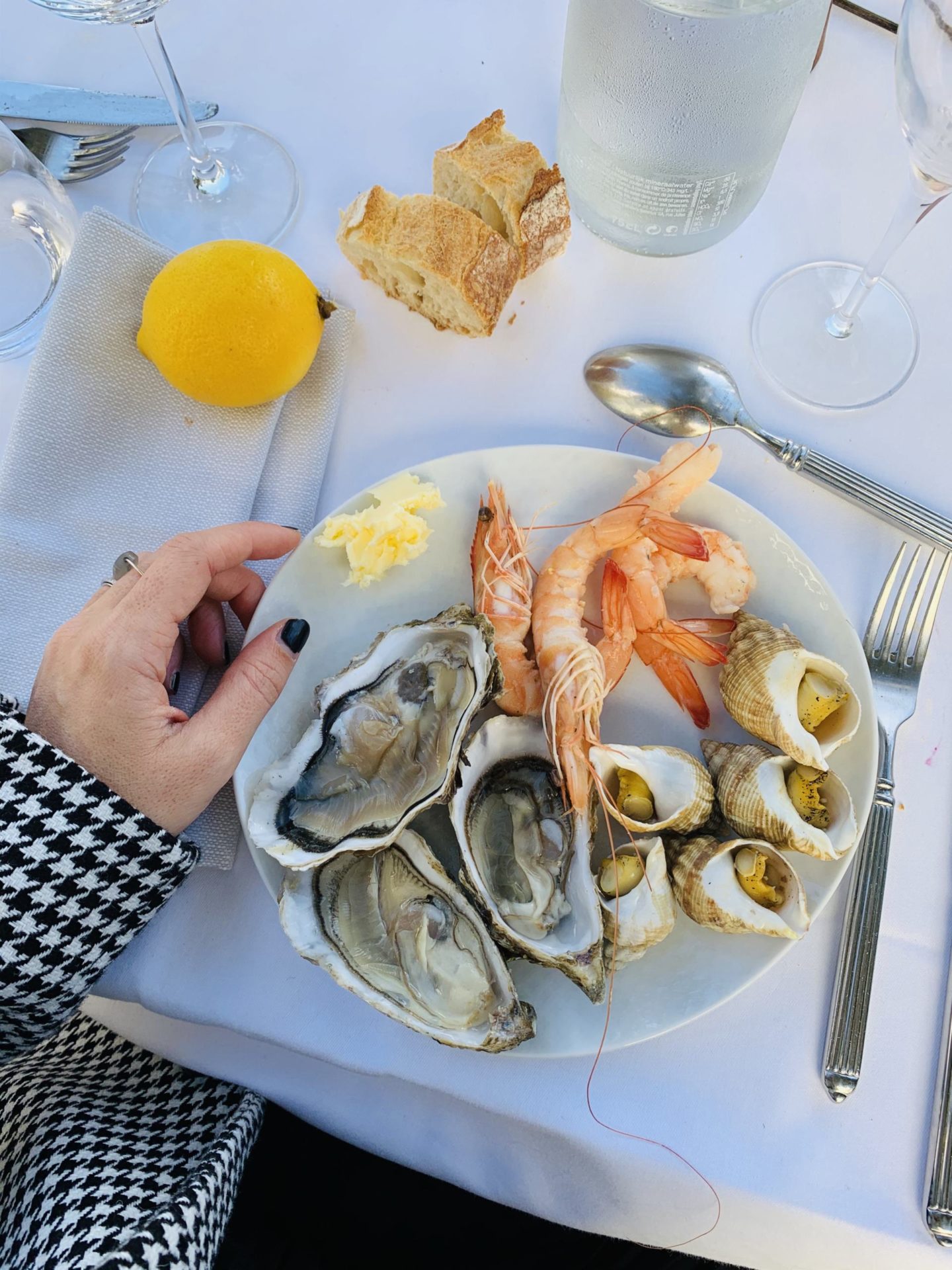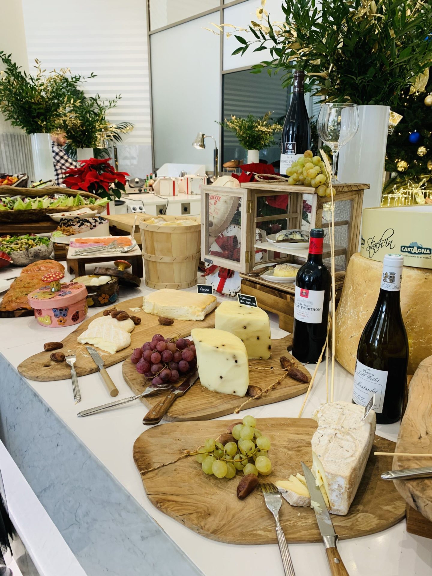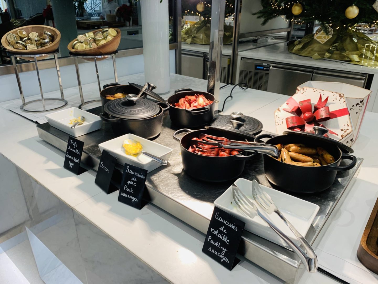 C’est un brunch buffet. Habituellement, je préfère les brunchs servis à l’assiette mais là, on a été réellement conquis. Plusieurs immenses tables et un large choix de charcuteries, de fromages, de crudités et salades, de pain, un magnifique saumon fumé … mais également une partie breakfast avec des viennoiseries, des pancakes, des gaufres, un velouté, du bacon, des saucisses et des légumes/pommes de terre. Tous les grands classiques d’un breakfast continental sont là. Notre coup de coeur de ce brunch, ça a été de retrouver plusieurs corners avec des produits frais et des cuissons minutes : un corner burger cuit et monté devant nous, un corner raclette avec des pommes de terre et condiments, un corner rôtisserie, un corner plancha et un immense corner fruits de mer avec des langoustes, des huîtres, des bulots et des crevettes. Je vous le dis, Louise a adoré les crevettes ! D’ailleurs, pour les enfants, il y a une table plus basse pour qu’ils puissent se servir eux-mêmes où l’on retrouve des mini-burgers, des crudités en bâtonnets, et plein d’autres mets proposés de façon ludique. Pour finir, il y a un buffet de desserts et un autre spécifique pour les enfants, même si ils peuvent se servir de partout évidemment. Le prix du brunch au Martinez est de 69€ pour les adultes, -50% pour les 6-12 ans et gratuit pour les moins de 6 ans. Tout est à volonté, et cela inclut également une grande bouteille d’eau, une coupe de champagne (délicieuse !), une boisson chaude et une boisson pour les enfants. Il y a des jus à disposition aussi. Inutile de vous dire que tout était excellent. A nous 3, on a goûté à peu près de tout, et on s’est régalé. L’ambiance est hyper agréable avec un groupe de musique, des chanteuses. C’est cool-chic, pas guindé ni bling-bling, le juste milieu qui fait qu’on se sent à l’aise et à sa place, ce qui n’est pas toujours le cas dans un palace comme celui-ci. Clairement, on y retournera au Printemps, c’est certain !