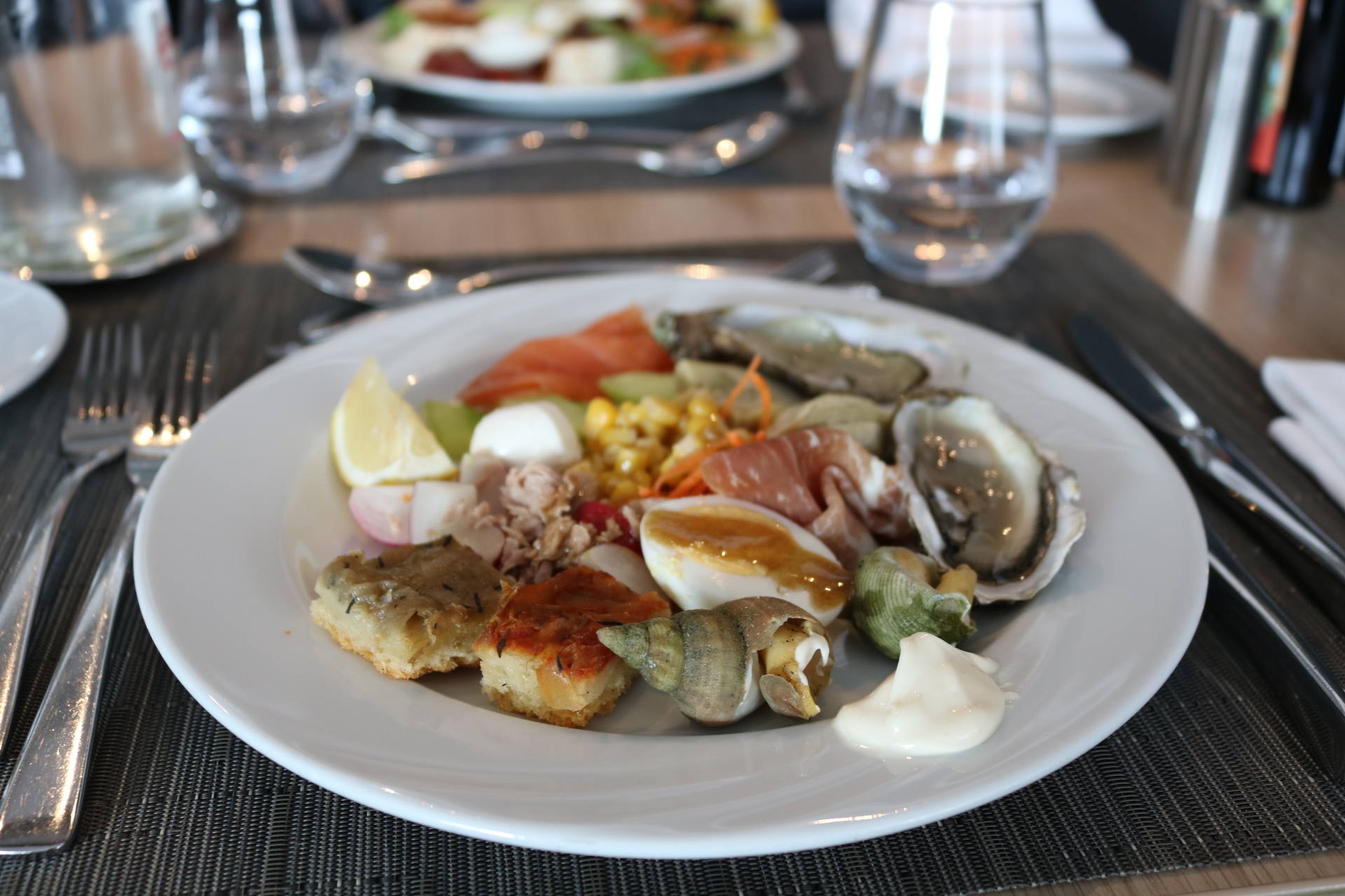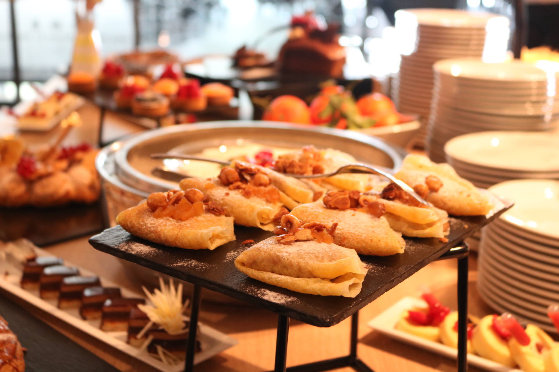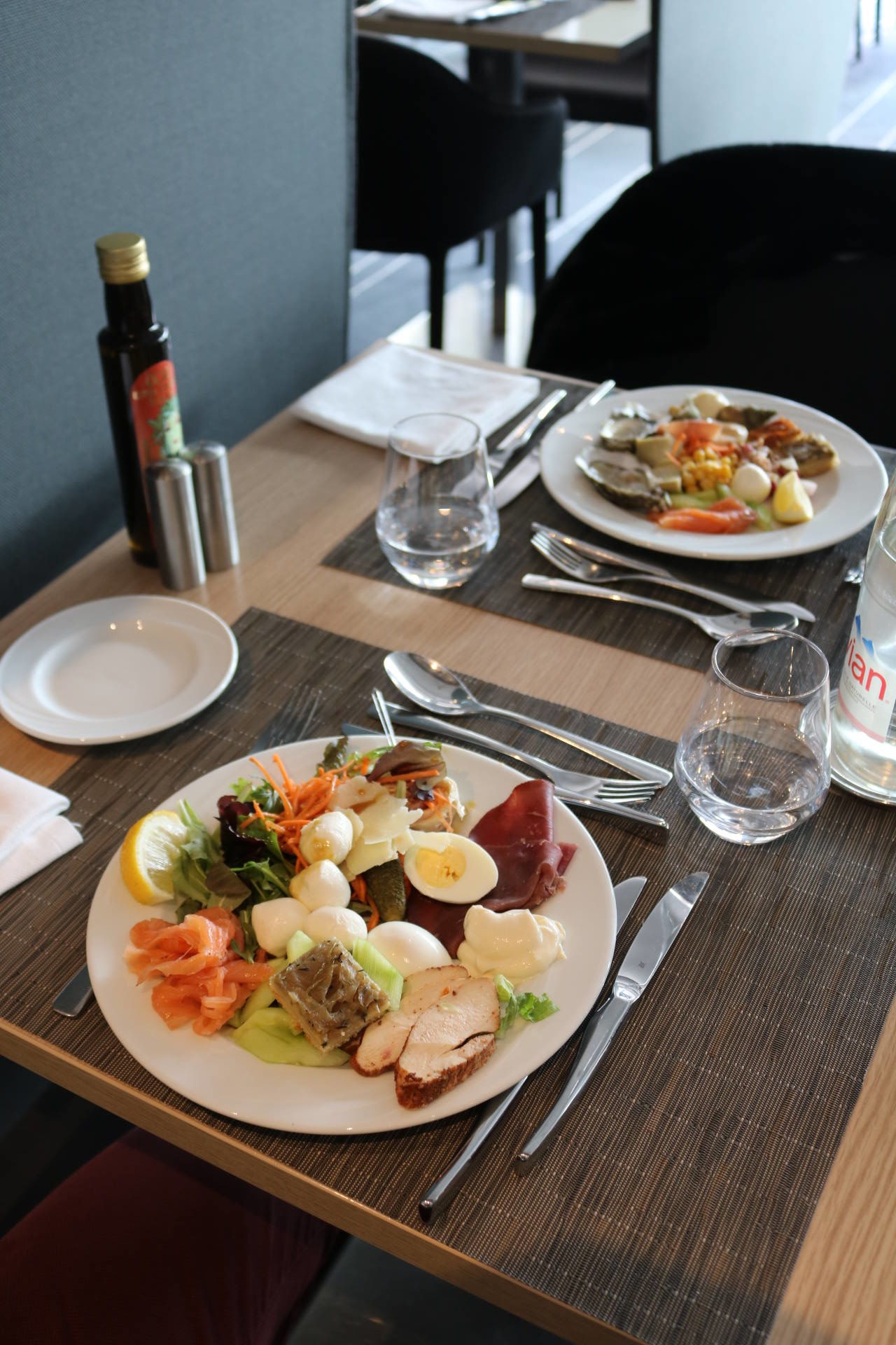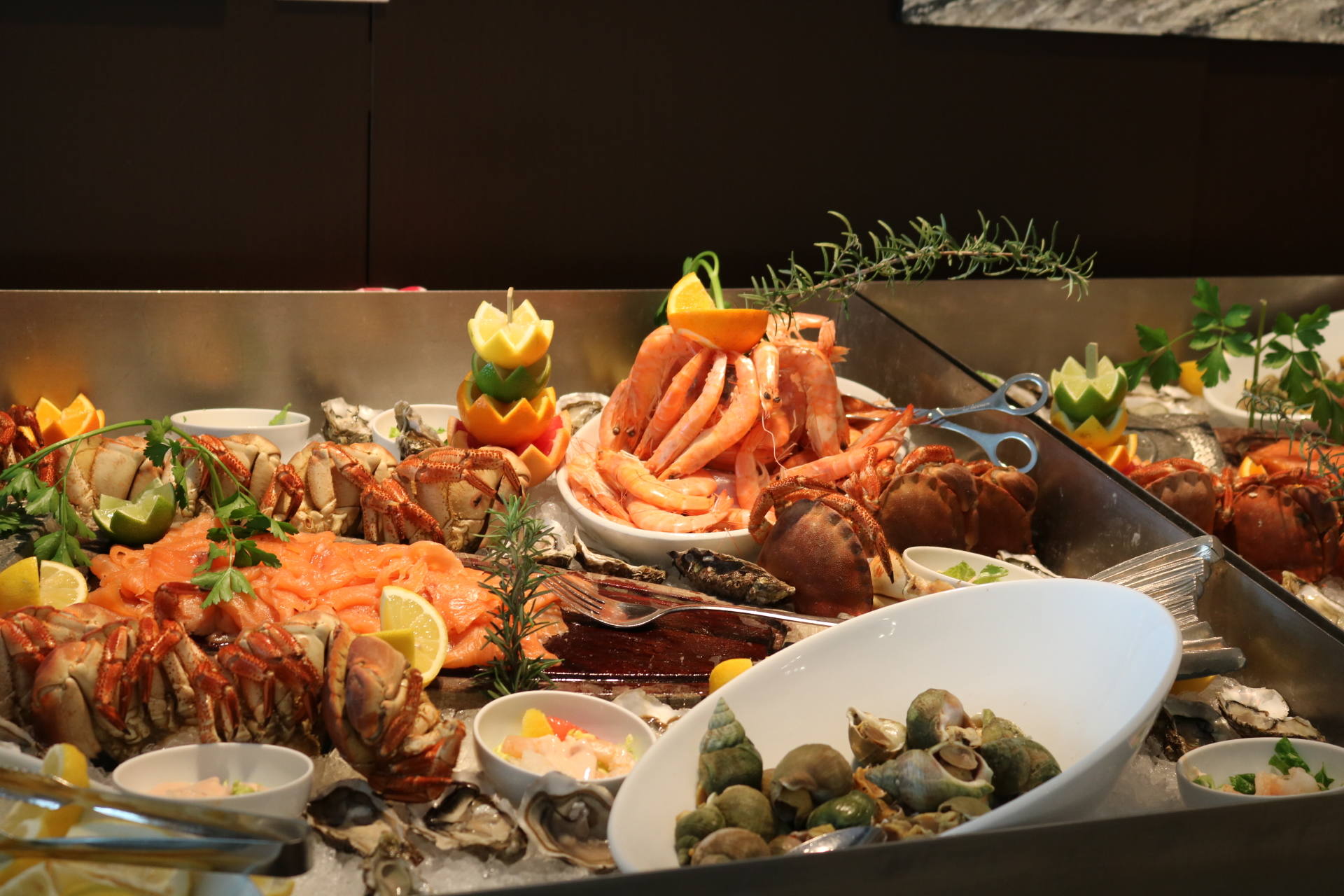 Côté food, les buffets sont superbes et tout ce qu’on a goûté a tout simplement été excellent. On retrouve un buffet de crudités, salades froides et accompagnements froids, un buffet de fruits de mer, un buffet de tartes, une viande braisée, plusieurs plats et accompagnements chauds, un beau plateau de fromages, un buffet de pains et viennoiseries ainsi qu’une immense et majestueuse table des desserts ! Et le mot est faible ! J’ai pour ma part pris une première assiette d’entrée et je me suis régalée, notamment avec des petits artichauts comme j’adore ! J’ai aussi pris plusieurs huîtres, bulots et du saumon fumé. Stéphane n’aime pas les fruits de mer alors j’en profite quand je peux en manger car on en achète rarement chez nous. J’ai d’ailleurs apprécié la quantité de condiments/sauces/accompagnements ! Moi qui adore manger les huîtres avec des échalottes au vinaigre, j’étais très contente d’en trouver ! Ensuite, j’ai pris de la soupe de légumes de saison à laquelle j’ai ajouté un peu des plats proposés pour goûter : du cabillaux, des pommes de terre, des courgettes. Très bon également ! Je suis fan de fromages donc j’y suis allée avec grand plaisir. J’ai pris de tous petits bouts pour en goûter 6 ! J’étais contente qu’il y ait du raisin, des noisettes, plein de petits accompagnements, en plus d’un pain aux céréales très bon. Venons-en aux desserts ! C’est simple, on ne savait pas quoi choisir tellement qu’on aurait voulu tout goûter ! Puis j’ai finalement choisi de la salade de fruits, un peu de crème brûlée, une tartelette passion framboise, un mini-gâteau à la framboise, et j’ai aussi piqué quelques bonbons ! Mais il y avait tellement de choix, et même une fondue au chocolat ! Stéphane a aussi adoré tout ce qu’il a mangé !