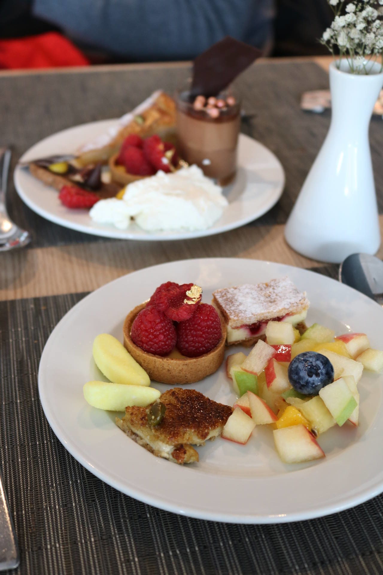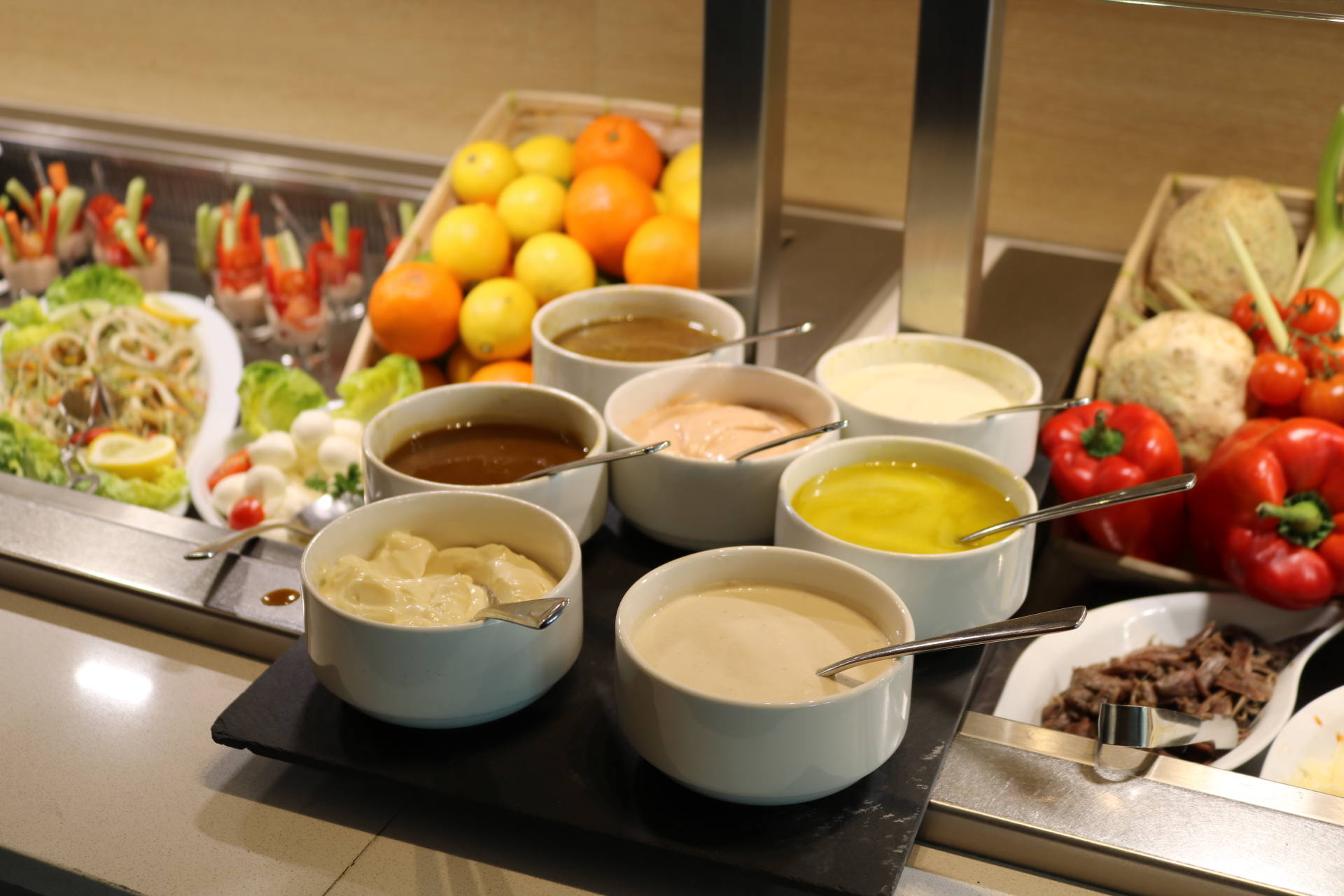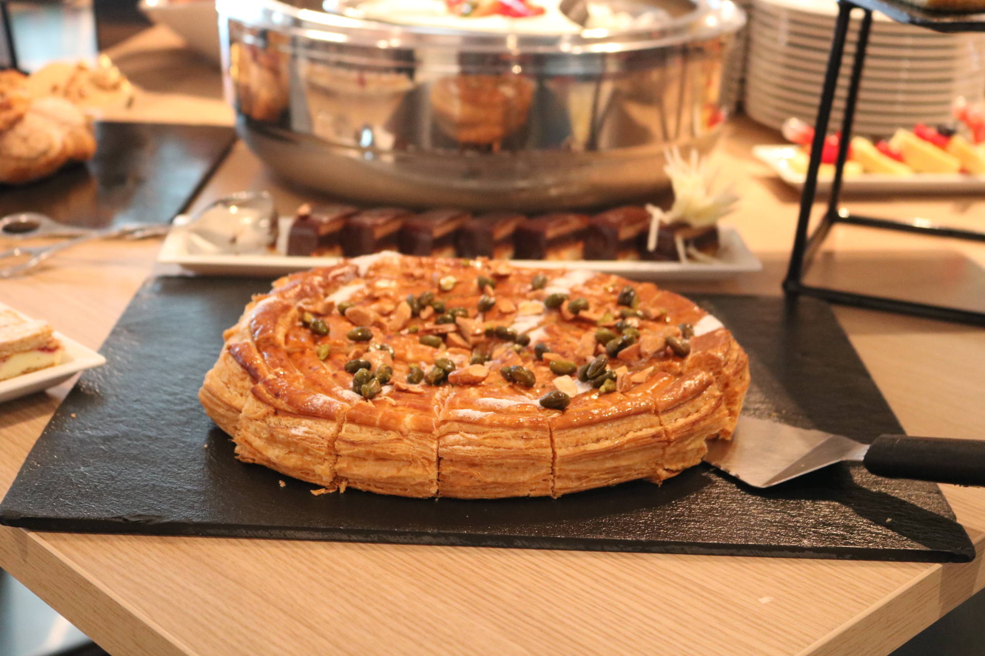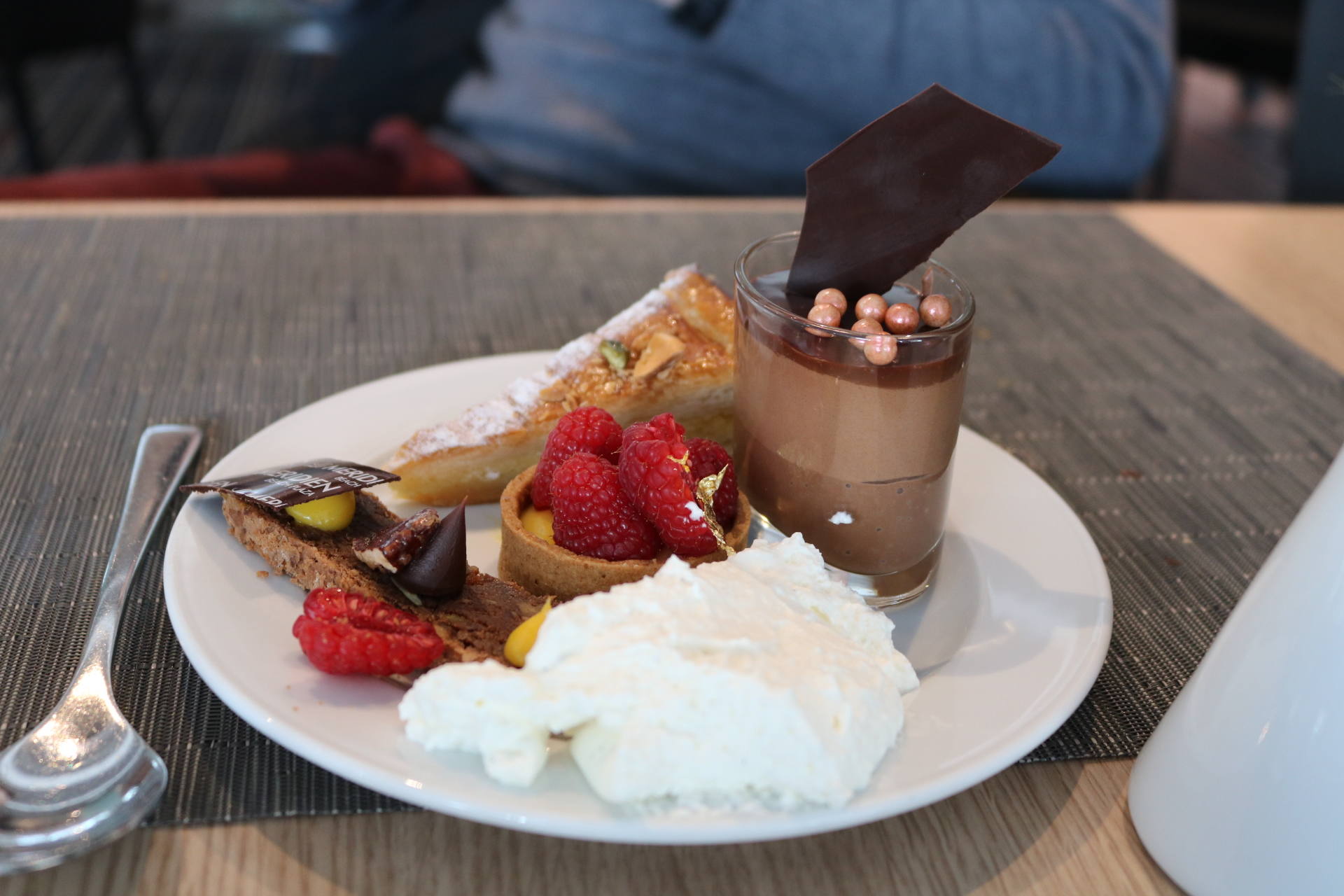 Côté food, les buffets sont superbes et tout ce qu’on a goûté a tout simplement été excellent. On retrouve un buffet de crudités, salades froides et accompagnements froids, un buffet de fruits de mer, un buffet de tartes, une viande braisée, plusieurs plats et accompagnements chauds, un beau plateau de fromages, un buffet de pains et viennoiseries ainsi qu’une immense et majestueuse table des desserts ! Et le mot est faible ! J’ai pour ma part pris une première assiette d’entrée et je me suis régalée, notamment avec des petits artichauts comme j’adore ! J’ai aussi pris plusieurs huîtres, bulots et du saumon fumé. Stéphane n’aime pas les fruits de mer alors j’en profite quand je peux en manger car on en achète rarement chez nous. J’ai d’ailleurs apprécié la quantité de condiments/sauces/accompagnements ! Moi qui adore manger les huîtres avec des échalottes au vinaigre, j’étais très contente d’en trouver ! Ensuite, j’ai pris de la soupe de légumes de saison à laquelle j’ai ajouté un peu des plats proposés pour goûter : du cabillaux, des pommes de terre, des courgettes. Très bon également ! Je suis fan de fromages donc j’y suis allée avec grand plaisir. J’ai pris de tous petits bouts pour en goûter 6 ! J’étais contente qu’il y ait du raisin, des noisettes, plein de petits accompagnements, en plus d’un pain aux céréales très bon. Venons-en aux desserts ! C’est simple, on ne savait pas quoi choisir tellement qu’on aurait voulu tout goûter ! Puis j’ai finalement choisi de la salade de fruits, un peu de crème brûlée, une tartelette passion framboise, un mini-gâteau à la framboise, et j’ai aussi piqué quelques bonbons ! Mais il y avait tellement de choix, et même une fondue au chocolat ! Stéphane a aussi adoré tout ce qu’il a mangé !
