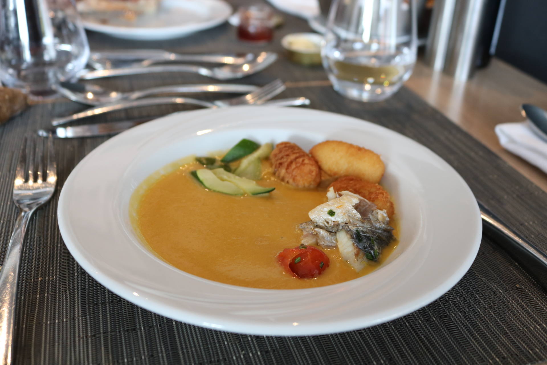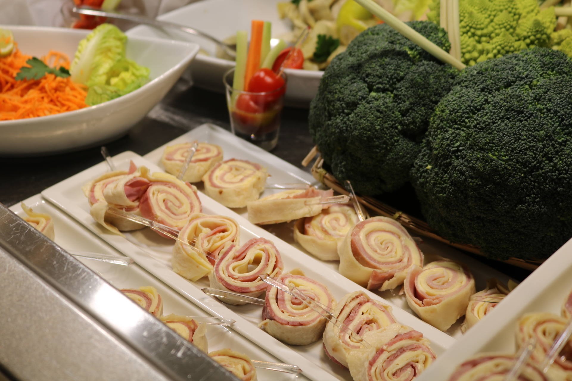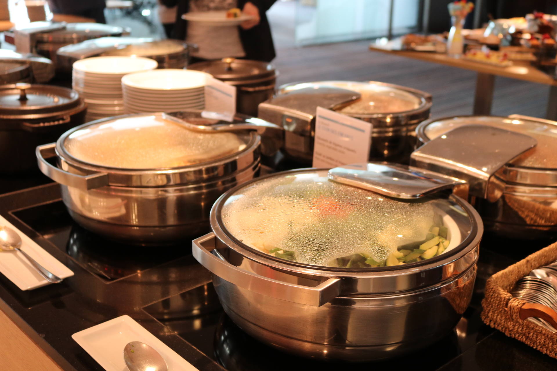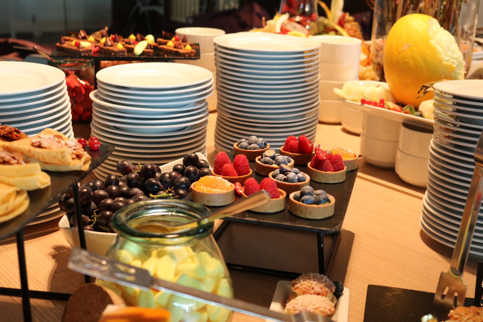Côté food, les buffets sont superbes et tout ce qu’on a goûté a tout simplement été excellent. On retrouve un buffet de crudités, salades froides et accompagnements froids, un buffet de fruits de mer, un buffet de tartes, une viande braisée, plusieurs plats et accompagnements chauds, un beau plateau de fromages, un buffet de pains et viennoiseries ainsi qu’une immense et majestueuse table des desserts ! Et le mot est faible ! J’ai pour ma part pris une première assiette d’entrée et je me suis régalée, notamment avec des petits artichauts comme j’adore ! J’ai aussi pris plusieurs huîtres, bulots et du saumon fumé. Stéphane n’aime pas les fruits de mer alors j’en profite quand je peux en manger car on en achète rarement chez nous. J’ai d’ailleurs apprécié la quantité de condiments/sauces/accompagnements ! Moi qui adore manger les huîtres avec des échalottes au vinaigre, j’étais très contente d’en trouver ! Ensuite, j’ai pris de la soupe de légumes de saison à laquelle j’ai ajouté un peu des plats proposés pour goûter : du cabillaux, des pommes de terre, des courgettes. Très bon également ! Je suis fan de fromages donc j’y suis allée avec grand plaisir. J’ai pris de tous petits bouts pour en goûter 6 ! J’étais contente qu’il y ait du raisin, des noisettes, plein de petits accompagnements, en plus d’un pain aux céréales très bon. Venons-en aux desserts ! C’est simple, on ne savait pas quoi choisir tellement qu’on aurait voulu tout goûter ! Puis j’ai finalement choisi de la salade de fruits, un peu de crème brûlée, une tartelette passion framboise, un mini-gâteau à la framboise, et j’ai aussi piqué quelques bonbons ! Mais il y avait tellement de choix, et même une fondue au chocolat ! Stéphane a aussi adoré tout ce qu’il a mangé !