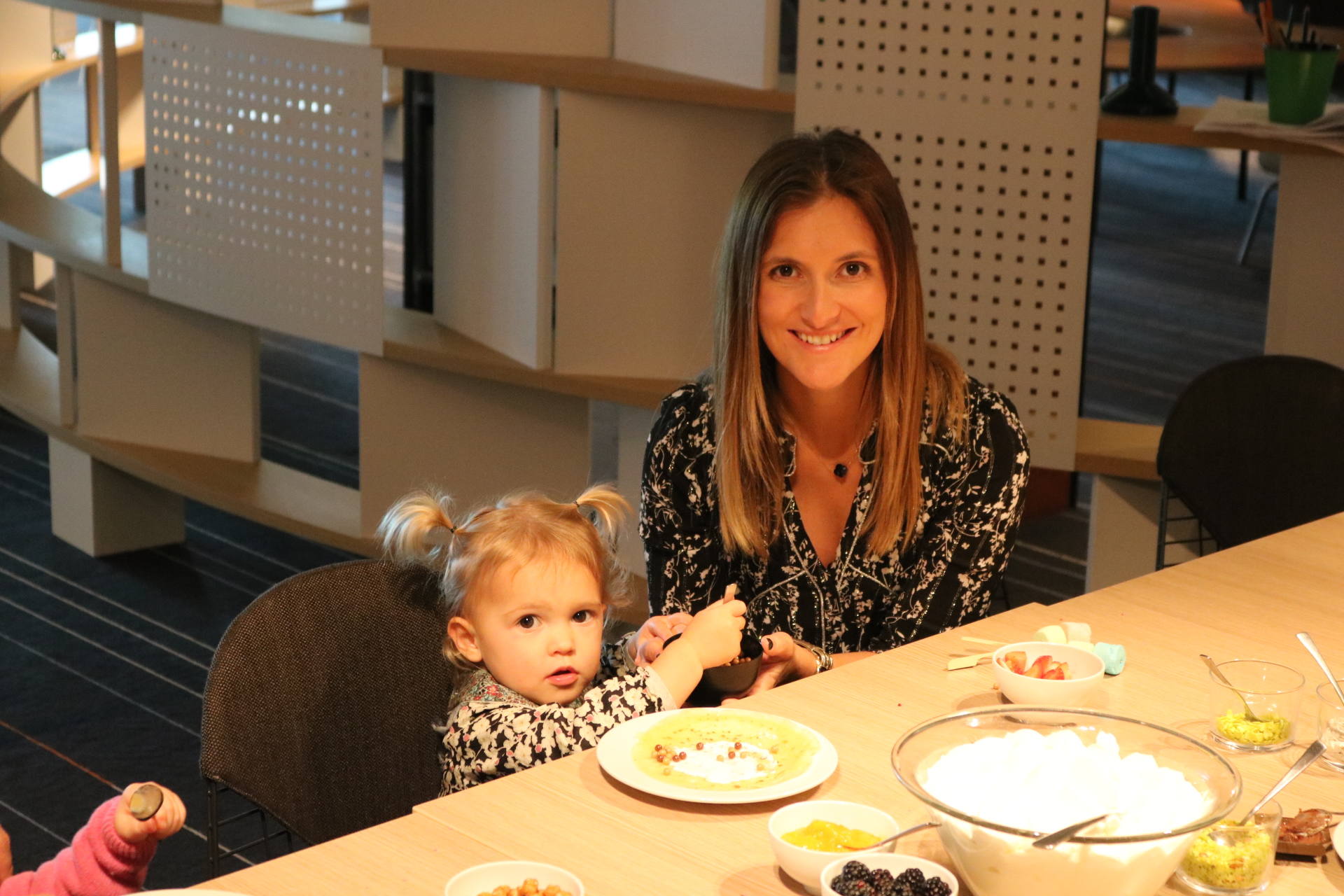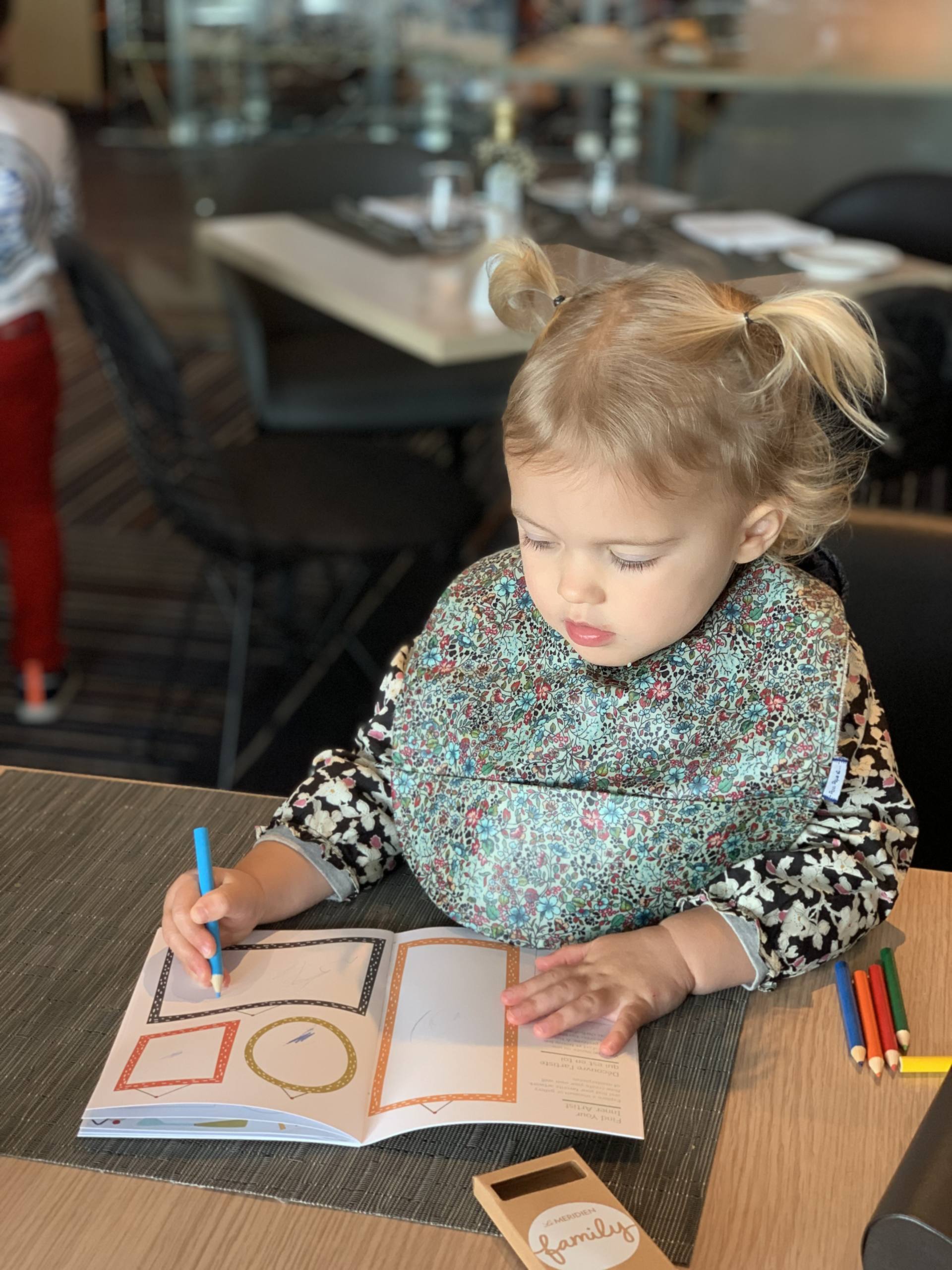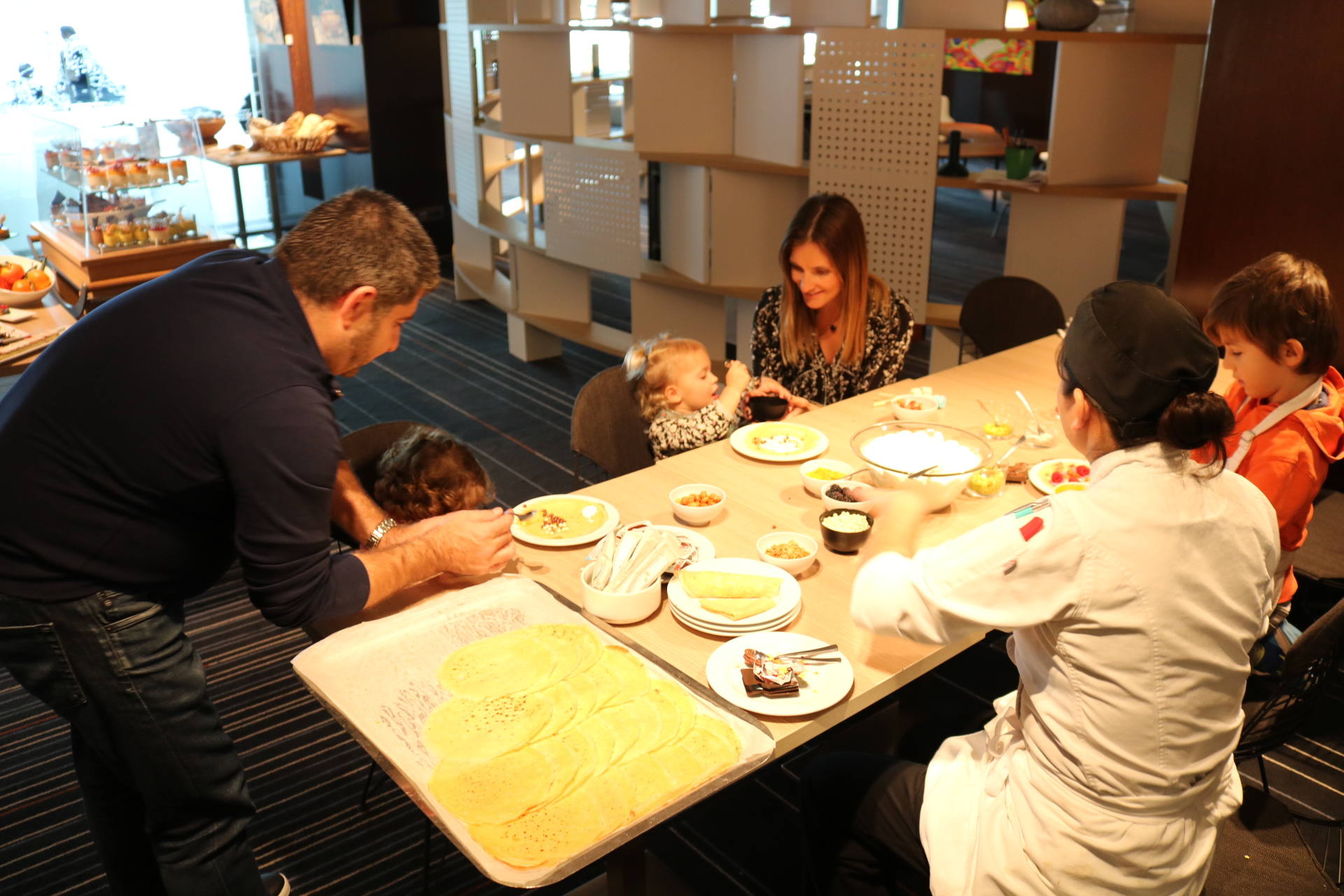 Je disais que c’est kids friendly. Dans ce genre d’établissements haut-de-gamme, ce n’est pas toujours le cas ! Souvent, on nous dit que ce n’est pas adapté ou que c’est un endroit discret ou autres. Mais là, ce n’est clairement pas le cas ! Les enfants sont accueillis avec une chaise haute si besoin, un carnet de coloriage et des crayons de couleur ! Il y a tout un coin avec plein de légo et de gros coussins. Et pas mal de choix pour les kids sur les buffets du brunch ! À 14h, tous les dimanches, il y a un cours de pâtisserie pour les enfants, pendant 1h. Le jour où on y était, c’était des crêpes ! Louise a bien joué le jeu, c’était trop mignon !