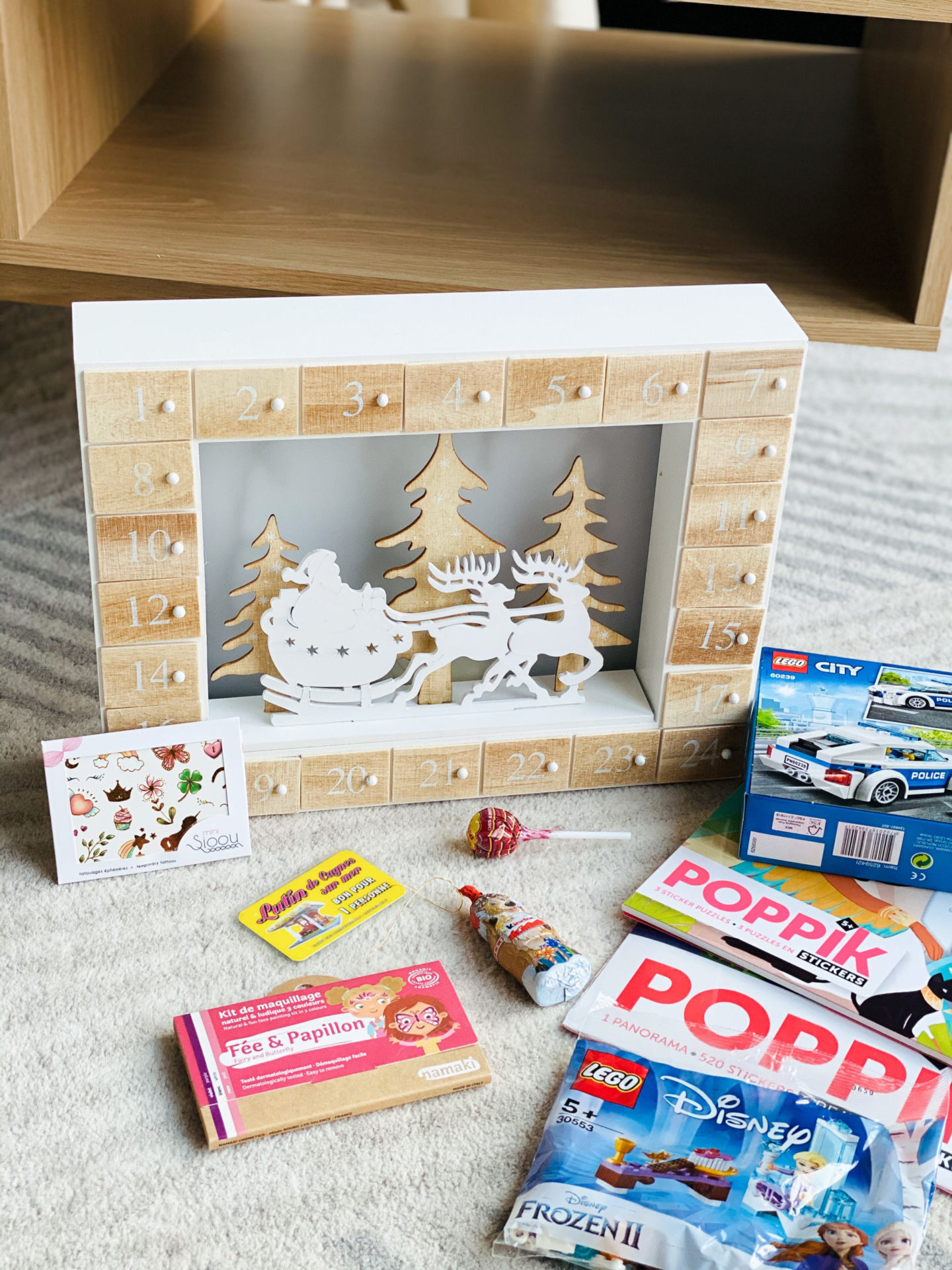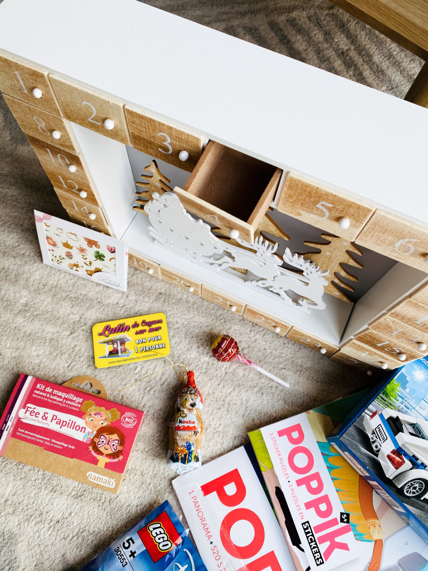 Il y a plein d’idées sympas. Je garde en tête pour l’année prochaine surtout pour les idées immatérielles! Mon garçon aura des petits legos en sachet aussi, achetés sur vinted (le trône d’Elsa, un astronaute et spiderman) des animaux en plastique, des kinder surprise, tour de manège, un marque page maison, des cotons lavable pat patrouille, un grattage, un petit tee shirt de Noël. J’ai finalement acheté trop de trucs, il me reste une paire de chaussons, des chaussettes de noël qu’il n’avait pas ouvert l’an dernier et une boîte à compartiments pour ranger les legos, ça sera pour noël.