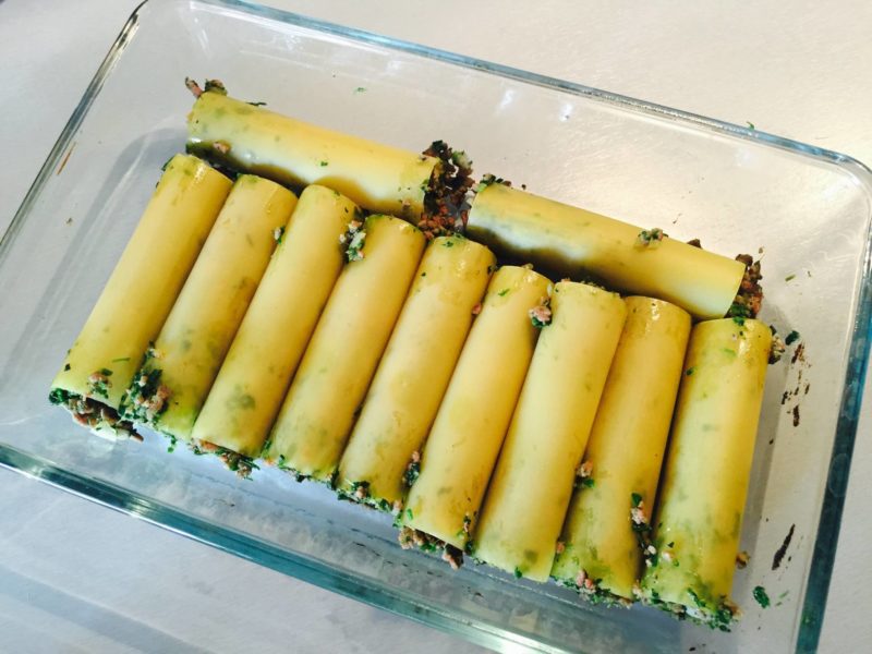 – 10-12 rouleaux de cannelloni (je prends les Panzani car il n’y a pas de pré-cuisson et c’est pratique car je ne prévois jamais à l’avance de faire ce type de plat donc ils se stockent dans le placard sans problème !)