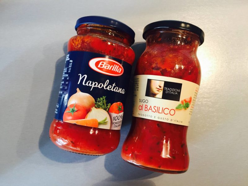 – 2 gros pots de sauces tomate type Napolitaine ou Basilic (je ne prends que les marques Barilla et Tradizioni d’Italia (chez Leclerc) car elles n’ont pas d’additifs ou juste un arôme naturel de basilic. J’ai une préférence pour la deuxième qui a un goût et une couleur plus naturelle)