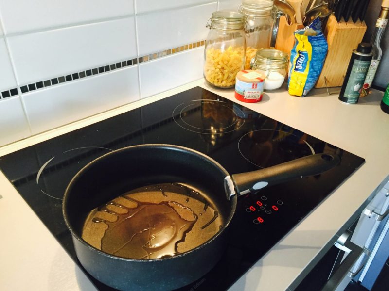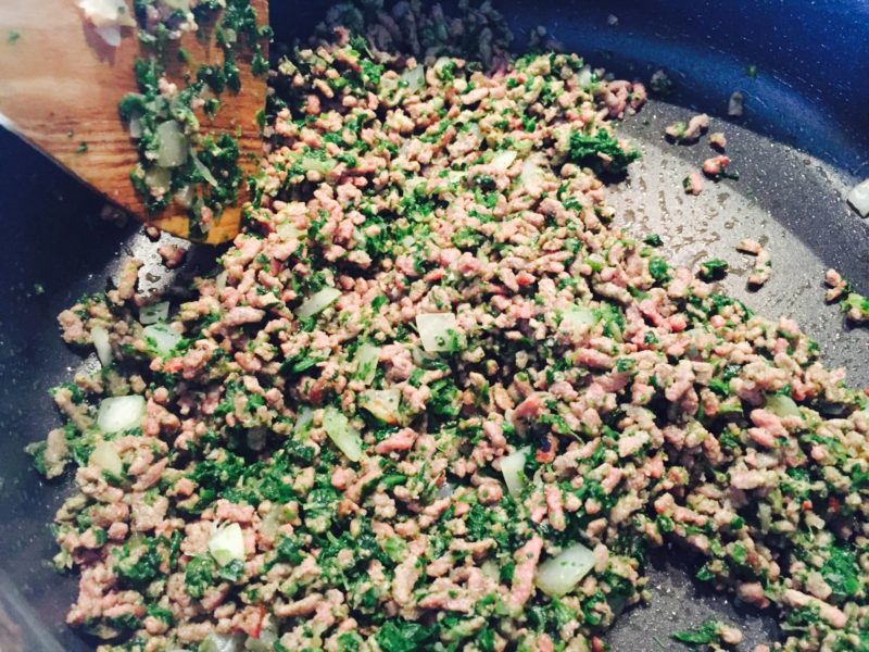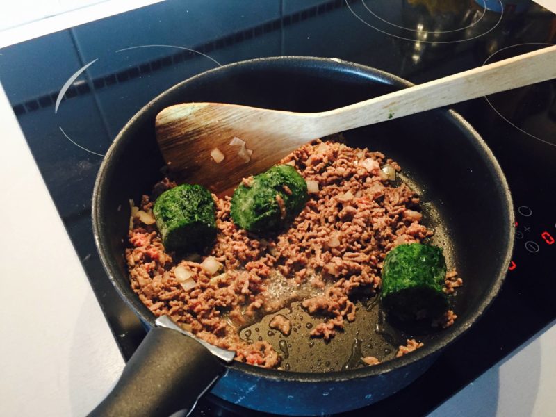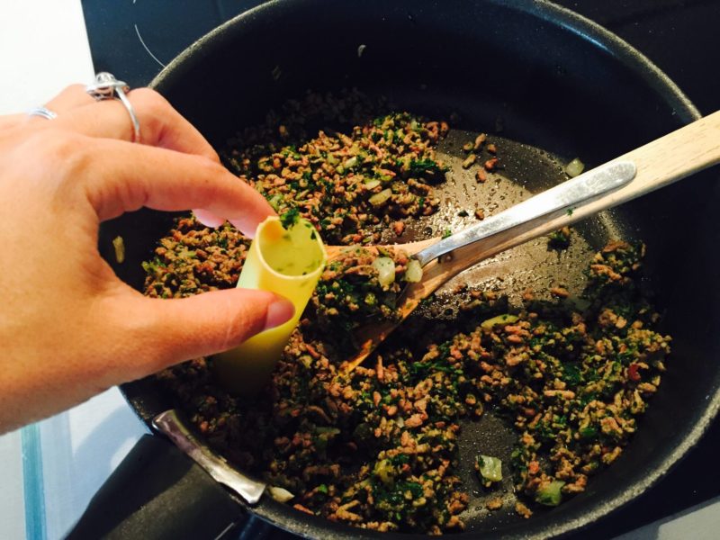 – Farcir les rouleaux de cannelloni en bloquant bien de l’autre côté. Je le fais directement dans la poêle avec une cuillère.