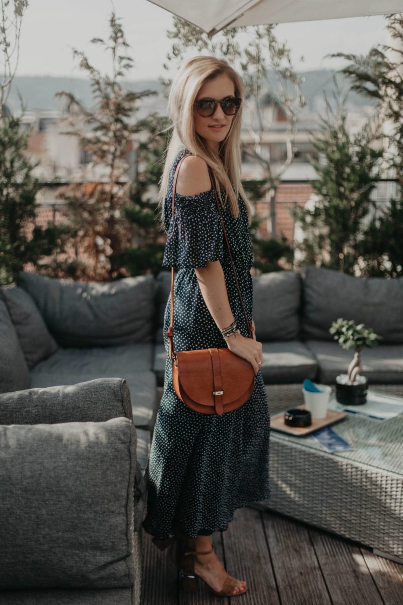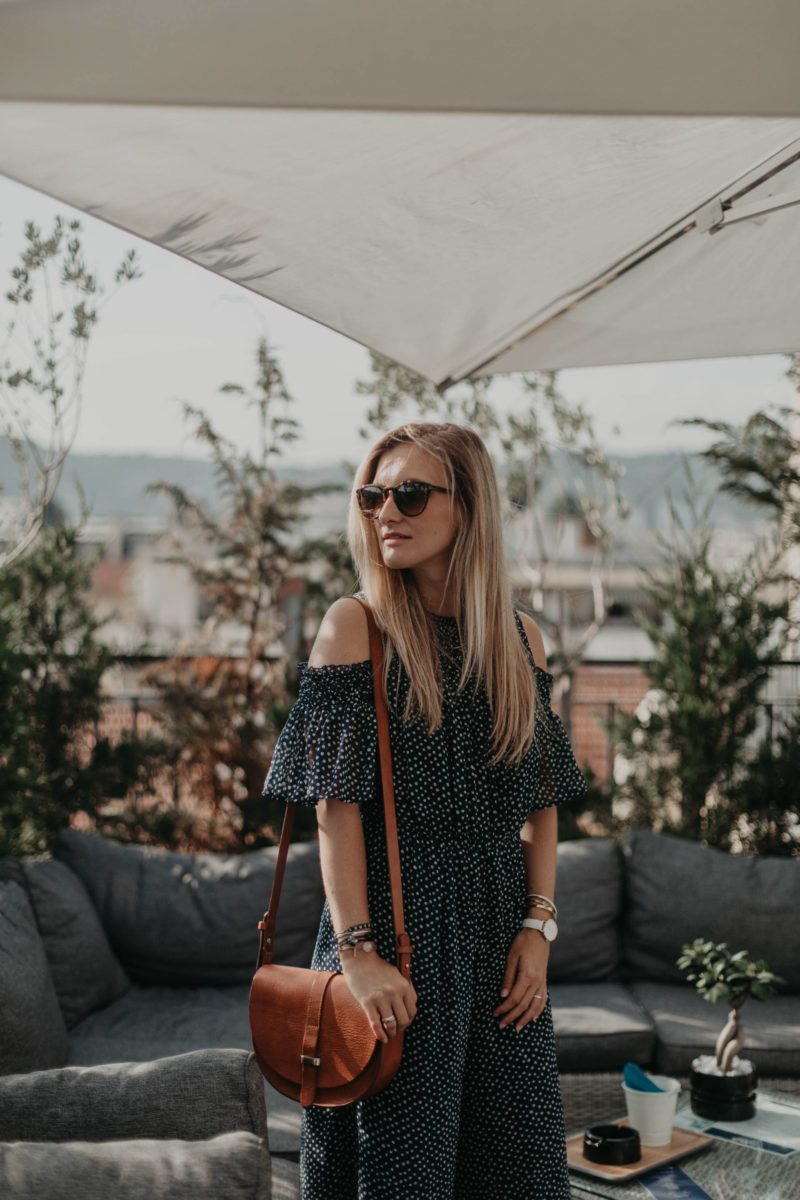 Ce jour-là, je la portais pour aller à la soirée Movenpick dont je vous ai parlée ici. La soirée se déroulait sur un rooftop donc j’ai opté pour une combinaison pantalon en espérant éviter les moustiques ! Verdict, il n’y en avait pas ! Oui, oui, j’ai déniché LA meilleure des adresses pour celles qui comme moi, sont l’anti-moustiques des autres ! C’est vraiment une combinaison idéale pour l’été, elle ne tient pas trop chaud, elle a une jolie coupe, un motif sympa. C’est une petite tenue pour le soir. Ce jour-là, je la portais avec mes chaussures camel fétiches, mon sac que je porte si souvent, mes nouvelles lunettes solaires à ma vue et des petits bijoux blanc et doré, tout ce que j’aime porter l’été. On a passé une belle soirée, avec un joli coucher du soleil !