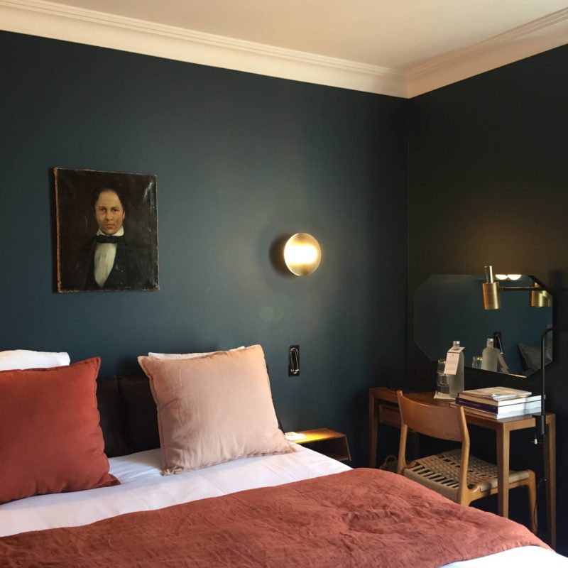 Pour commencer, c’est un boutique hôtel dont la décoration est canon. Dès l’extérieur, on a hâte d’entrer pour en voir plus. L’ambiance est tamisée, le mobilier est magnifique et l’atmosphère est zen. J’ai eu la chance de pouvoir dormir dans une chambre des derniers étages donc c’était très calme et j’avais une jolie vue dégagée. De toutes façons, l’hôtel est très calme car c’est une petite rue, et pas un grand boulevard. C’est important à Paris, j’ai parfois été dans des hôtels où je ne dormais pas de la nuit ! La chambre a une décoration rétro-chic que j’adore, c’était vraiment parfait.