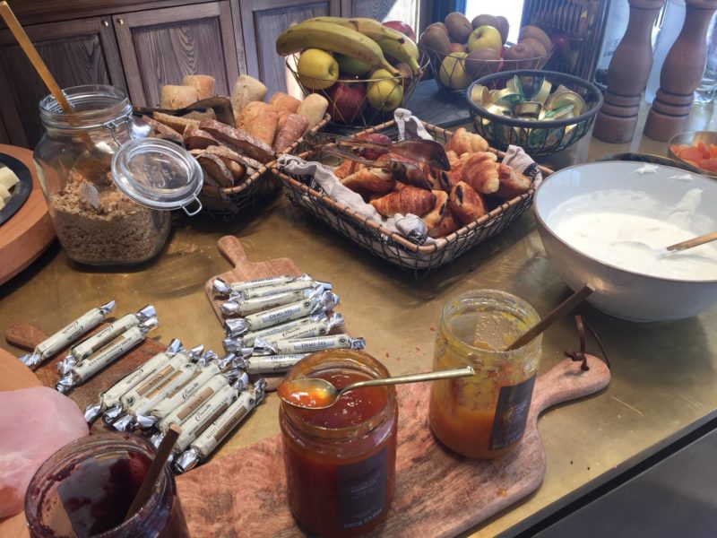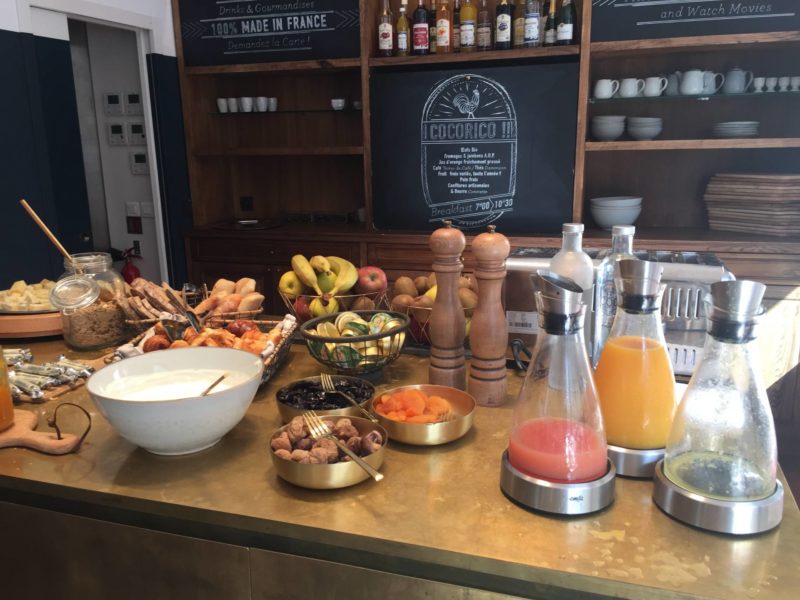 Mais quand même, à l’hôtel, il y a quelque chose qu’on adore tous : le petit-déjeuner !!!! Et celui du COQ Hôtel ! Il se prend dans la salle à manger de l’hôtel, au milieu de cette décoration rétro-luxuriante dirons-nous ! Il y a une immense table qui donne un côté comme à la maison avec de délicieuses confitures, du beurre, de bons pains, du fromage blanc, des jus frais, des boissons chaudes, du salé à la demande. Bref, il y a tout ce qu’il faut et bien plus d’ailleurs, je me suis régalée !