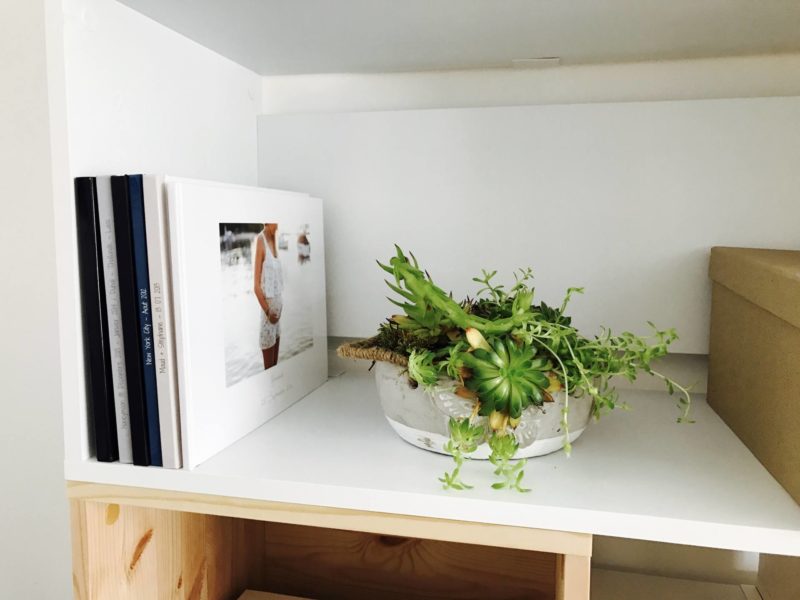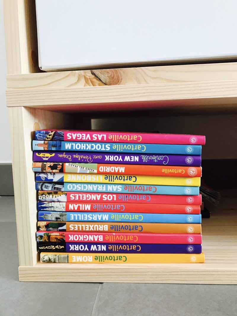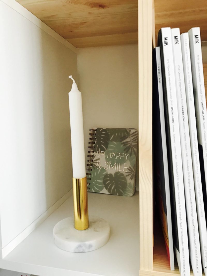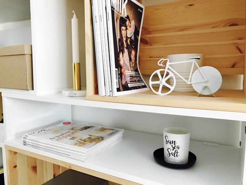 Et enfin, place à la déco ! On a acheté beaucoup de choses depuis environ un an, tout était stocké dans des boites en attendant : vases, bougies, plantes, cadres. On a aussi plein de petites choses personnelles : livres photos, guides de voyages, bouquins, magazines. Ça donne un rendu plus personnel de voir un petit vélo, un livre grossesse, le bouquin d’une blogueuse ou un souvenir de voyage !