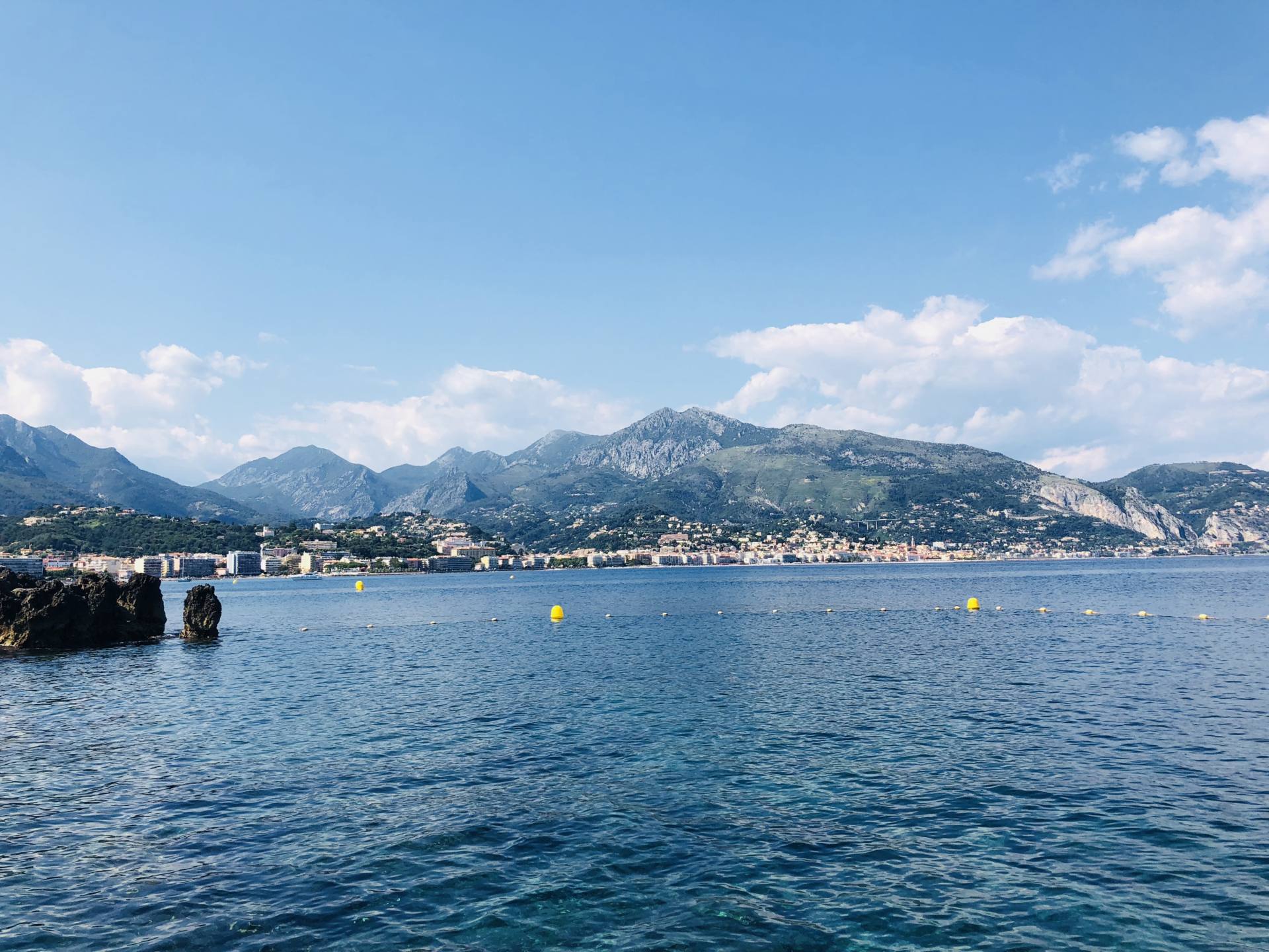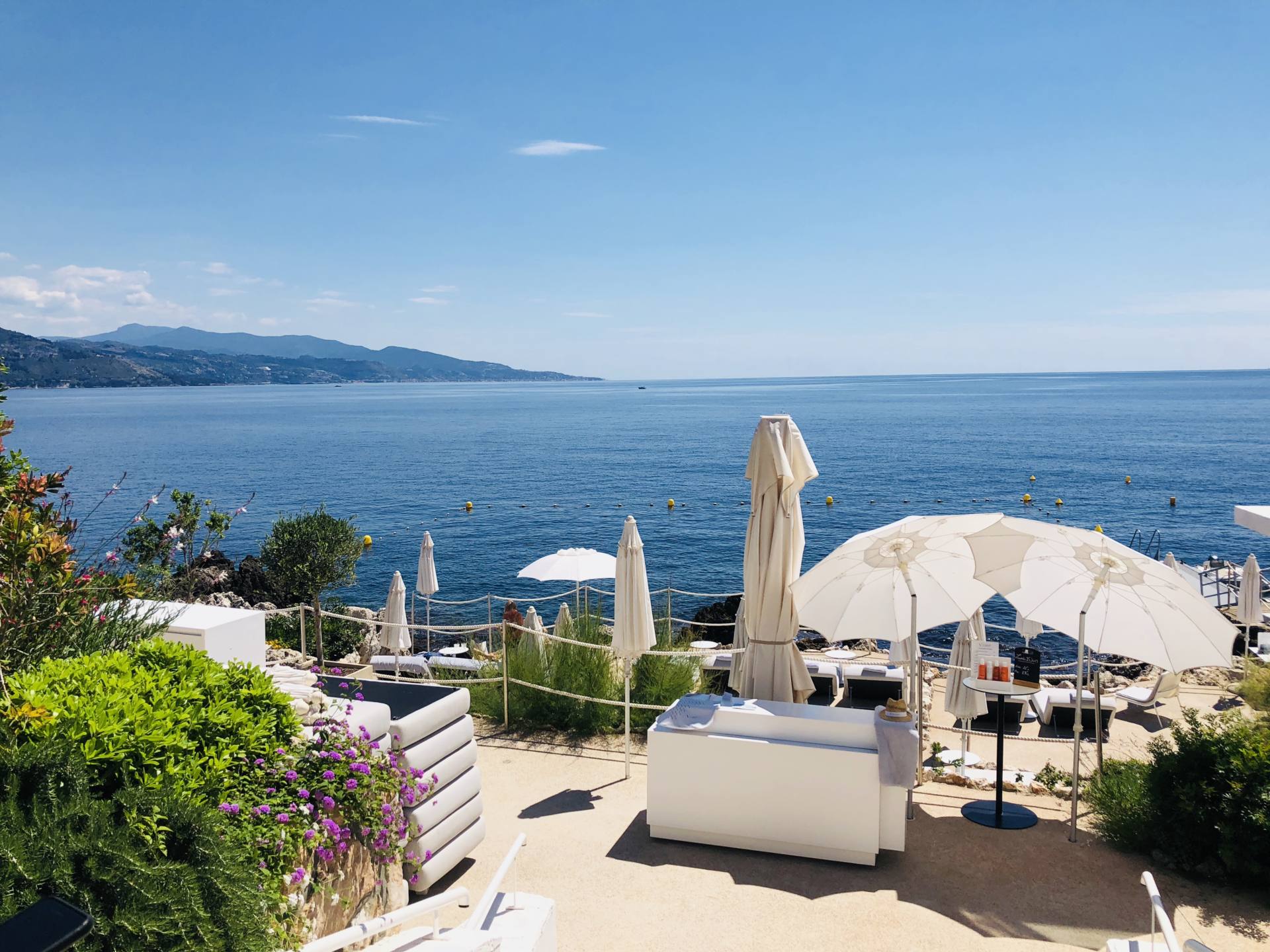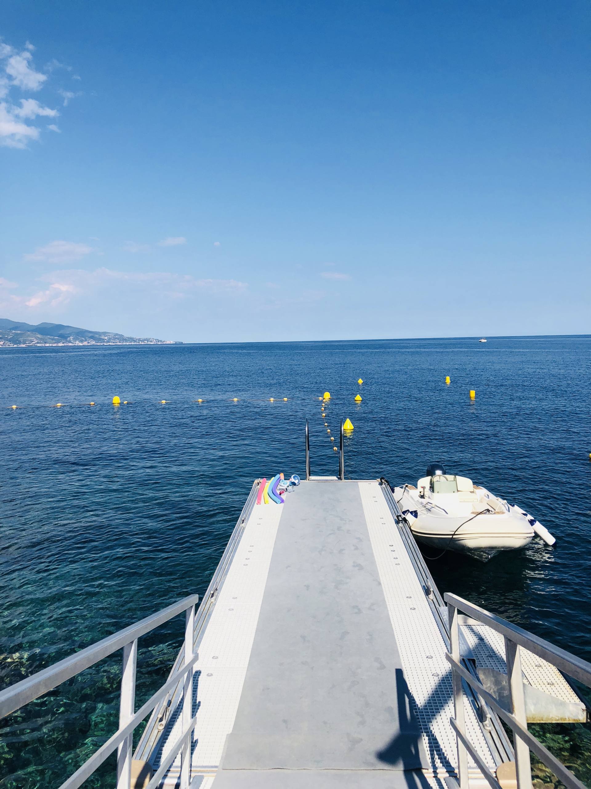 A peine arrivés, on est scotché. Nous qui avions envie de tranquilité, c’est l’idéal. C’est une plage 5 étoiles d’une beauté … c’est superbe ! Beaucoup de blanc, de la verdure, des fleurs, une splendide vue à 180 degrés sur la mer, avec Menton non loin et l’Italie juste après. Une plage à flanc de rochers où l’on accède à l’eau directement via un ponton puis un escalier qui descend dans une eau turquoise.