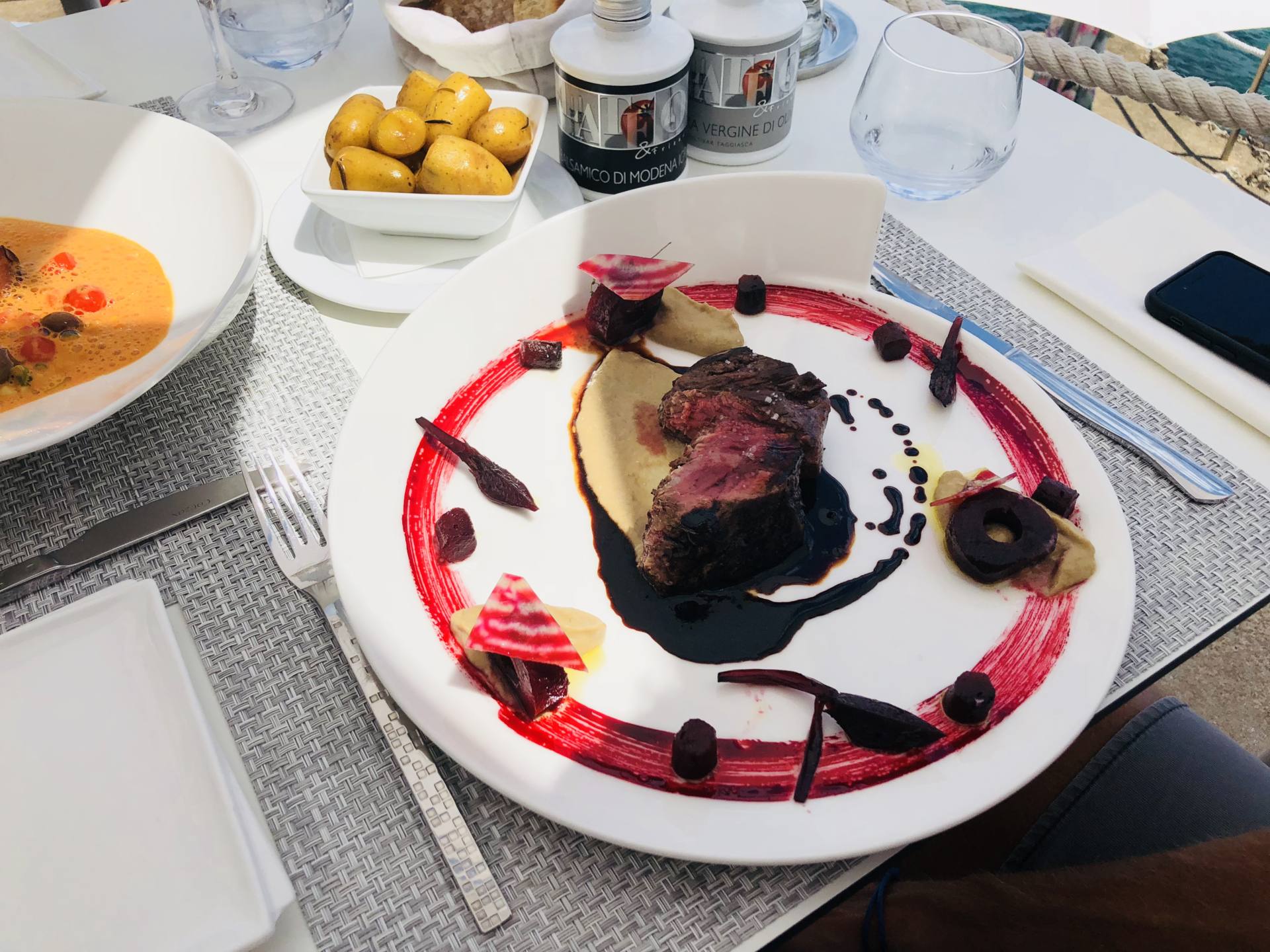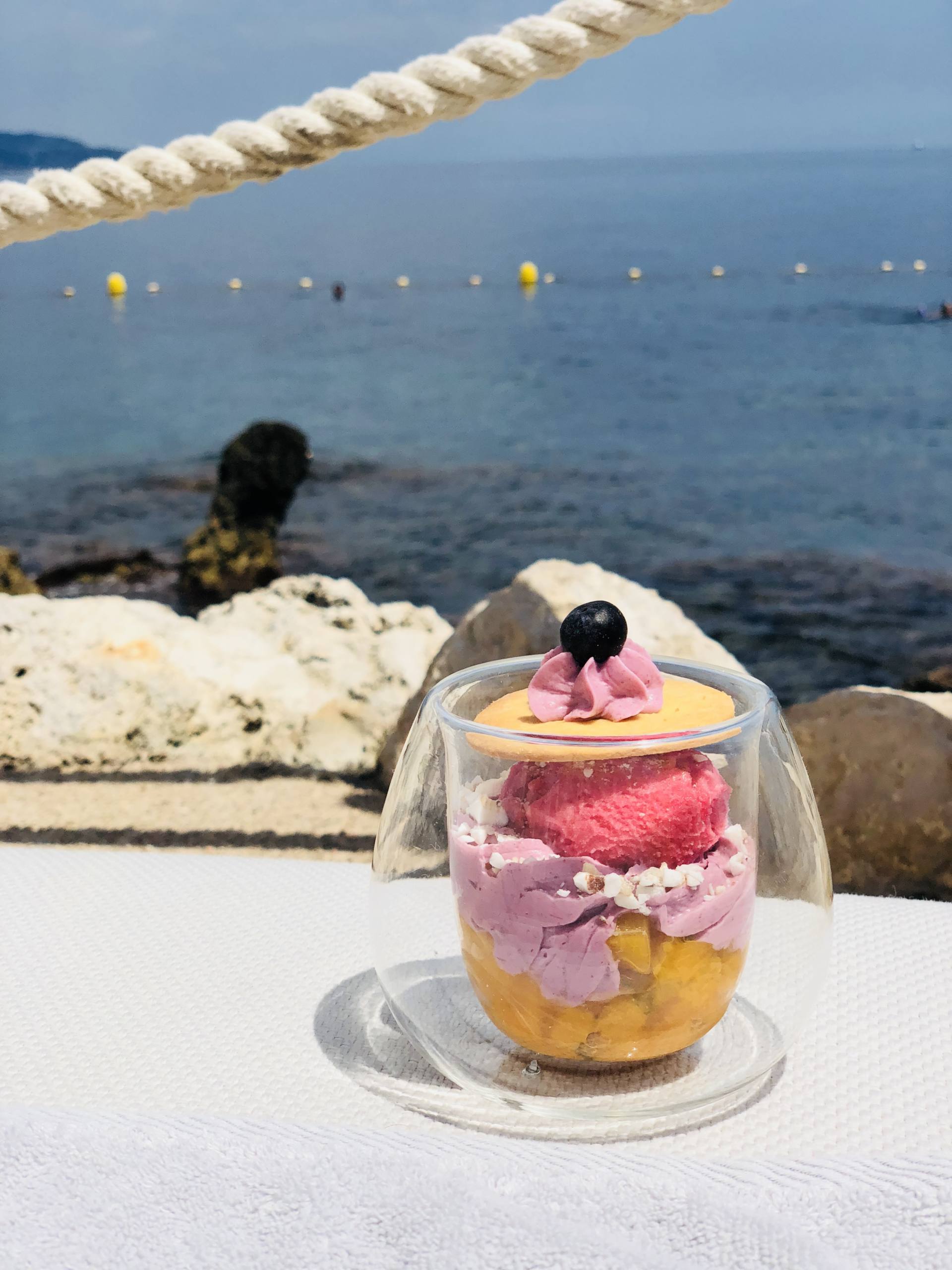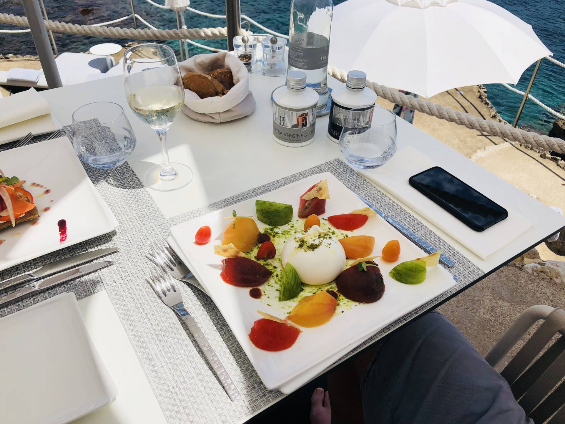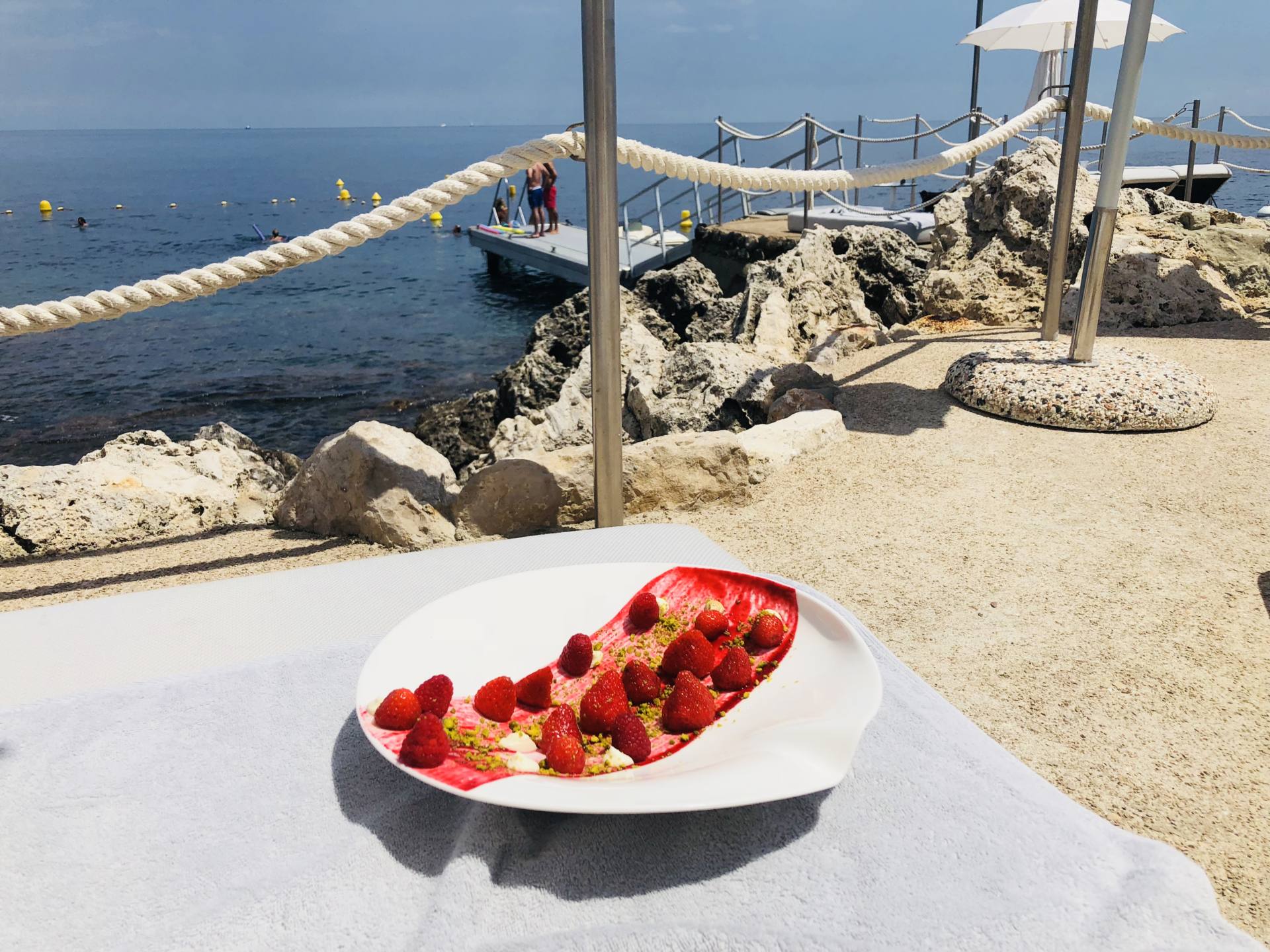 On a commencé par boire un coup tranquillement sur notre matelas. Quel bonheur d’avoir 2 gros matelas bien confortables, et surtout, qui ne soient pas collés qux autres ! Un vrai moment coupé du monde ! Enfin presque, je vous ai quand même partagé ça, faut pas déconner ! Mojito pour moi, bière pour Steph, le tout avec des chips de socca, de la tapenade, des olives et du hoummous ! Direction ensuite le restaurant. Je crois que là, nous avons tous les deux fait « waouuu ». Quelle vue, quel spot ! On a été émerveillés. On avait tous les deux très faim, Steph sortant d’un Iron Man, et moi ayant peu mangé depuis 2 jours ! En entrée, j’ai pris une tarte chèvre/olives et condiments niçois, un délice ! Steph a pris la burrata avec un méli-melo de tomates de toutes les couleurs. Lui qui n’aimait pas les tomates il y a peu encore, il en mange tout le temps maintenant ! Il a continué avec de la volaille. Quant à moi, j’ai pris du poulpe avec une purée de pois-chiche et un jus délicieux ! En dessert, il a pris les fraises et framboises avec de la pistache. J’ai pour ma part opté pour de la pêche avec un sablé, une verrine en plusieurs couches. On a pu prendre les desserts sur les matelas, le bonheur !