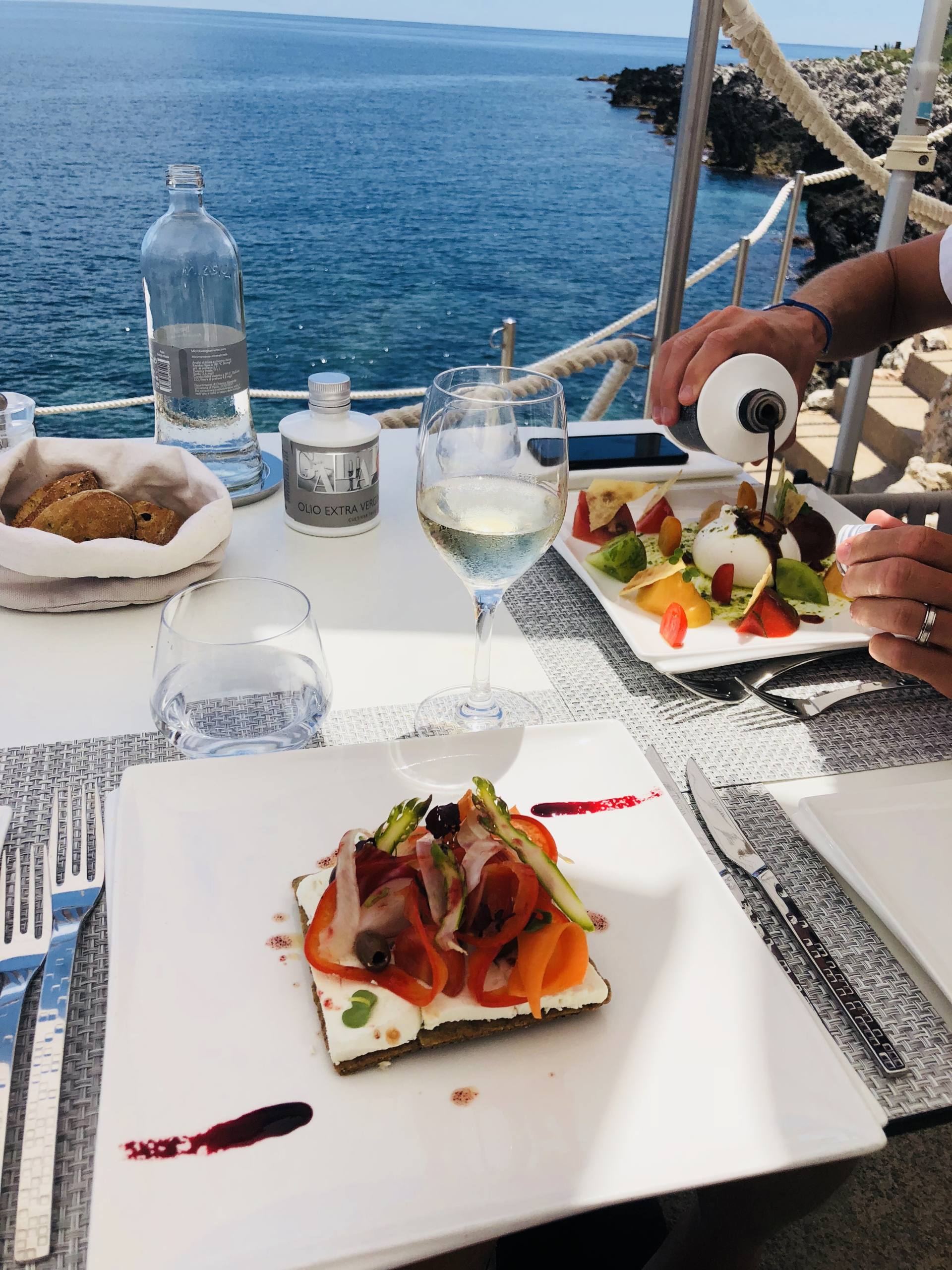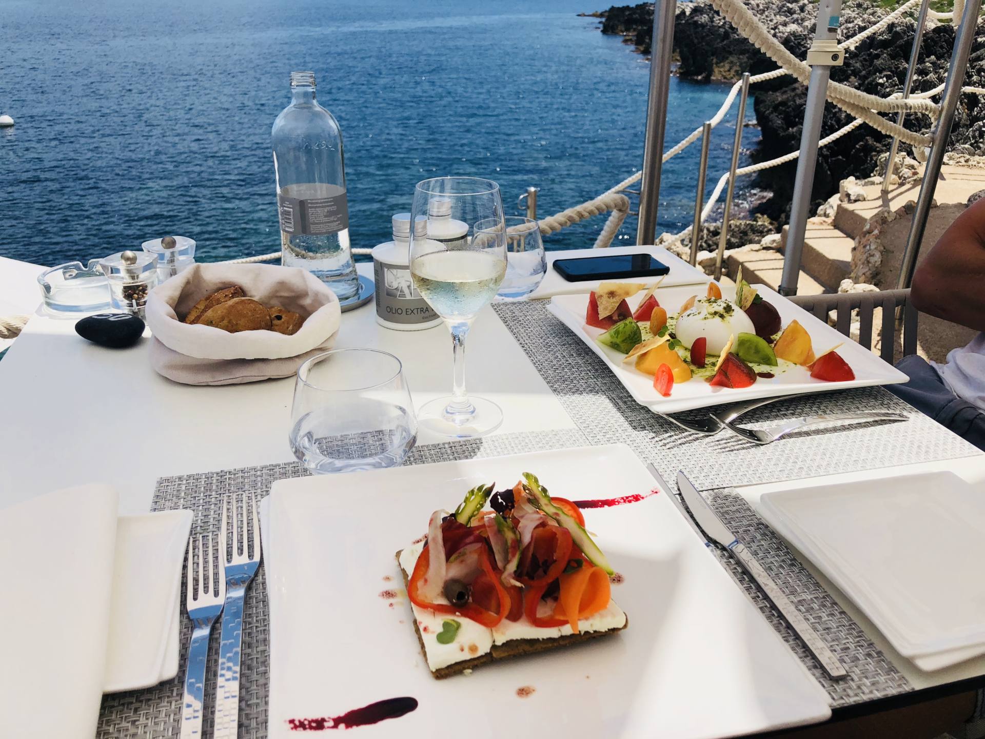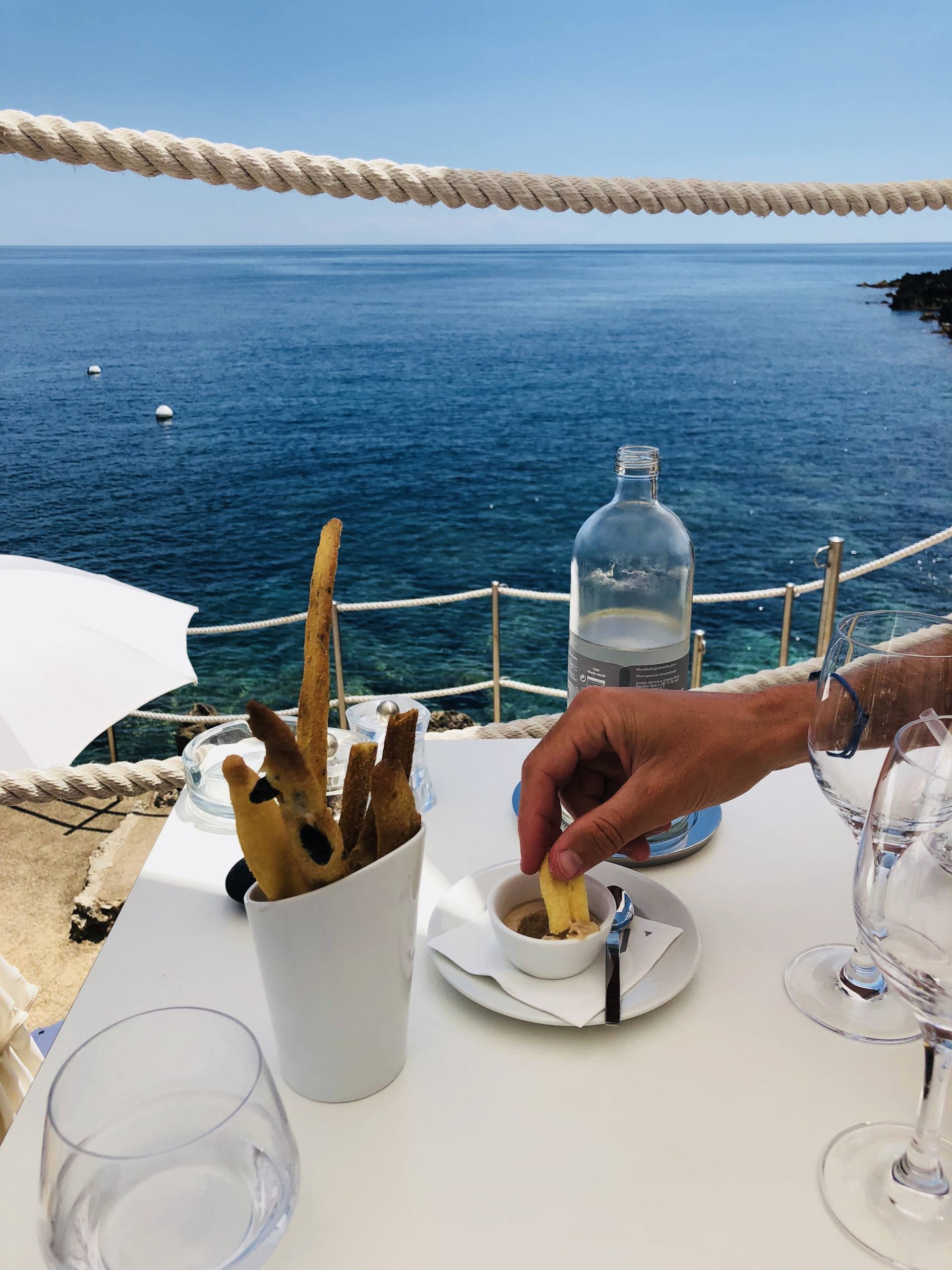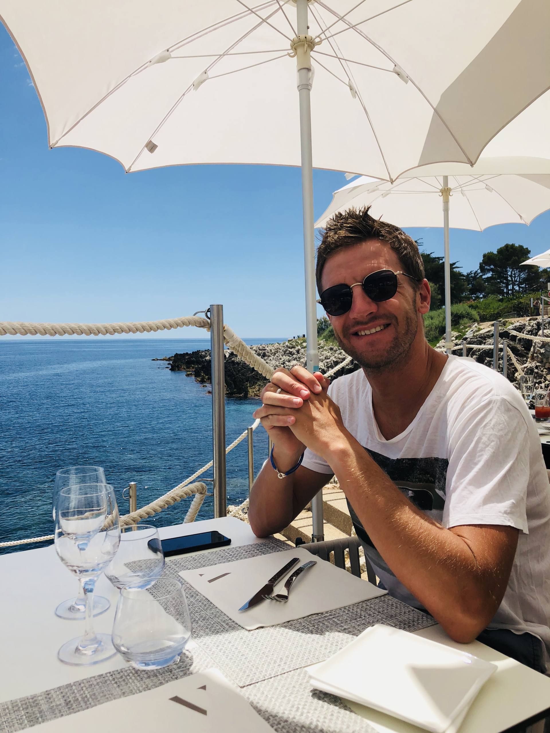 On a commencé par boire un coup tranquillement sur notre matelas. Quel bonheur d’avoir 2 gros matelas bien confortables, et surtout, qui ne soient pas collés qux autres ! Un vrai moment coupé du monde ! Enfin presque, je vous ai quand même partagé ça, faut pas déconner ! Mojito pour moi, bière pour Steph, le tout avec des chips de socca, de la tapenade, des olives et du hoummous ! Direction ensuite le restaurant. Je crois que là, nous avons tous les deux fait « waouuu ». Quelle vue, quel spot ! On a été émerveillés. On avait tous les deux très faim, Steph sortant d’un Iron Man, et moi ayant peu mangé depuis 2 jours ! En entrée, j’ai pris une tarte chèvre/olives et condiments niçois, un délice ! Steph a pris la burrata avec un méli-melo de tomates de toutes les couleurs. Lui qui n’aimait pas les tomates il y a peu encore, il en mange tout le temps maintenant ! Il a continué avec de la volaille. Quant à moi, j’ai pris du poulpe avec une purée de pois-chiche et un jus délicieux ! En dessert, il a pris les fraises et framboises avec de la pistache. J’ai pour ma part opté pour de la pêche avec un sablé, une verrine en plusieurs couches. On a pu prendre les desserts sur les matelas, le bonheur !