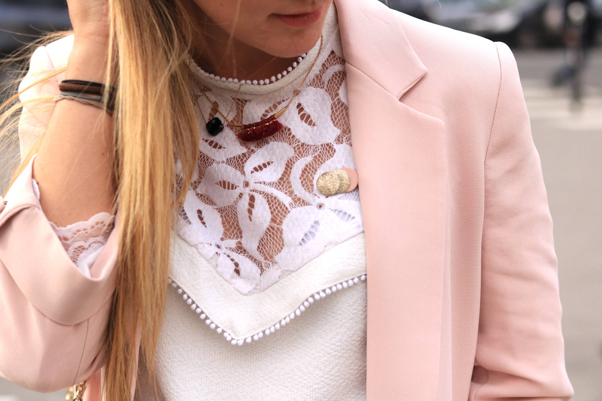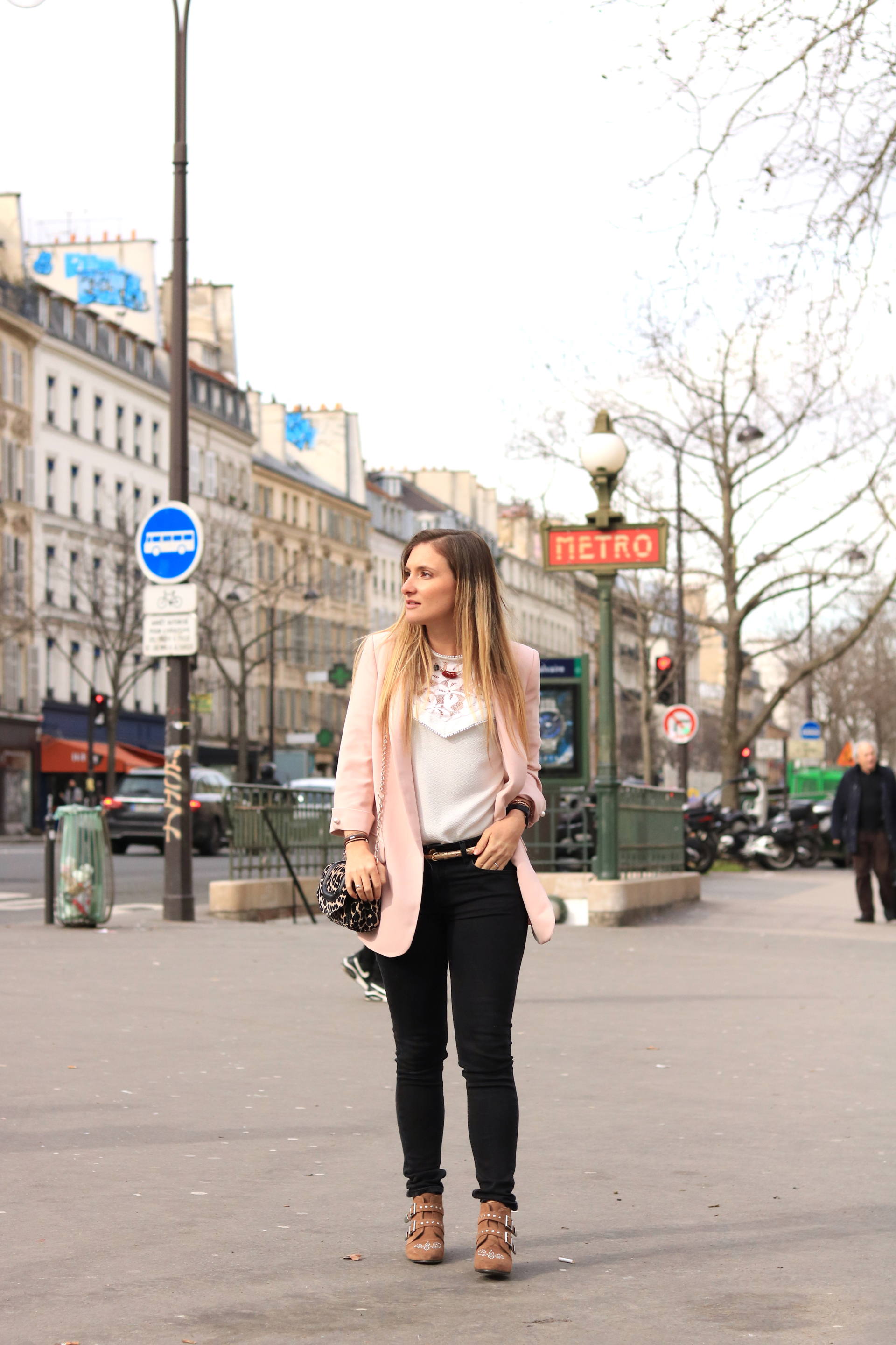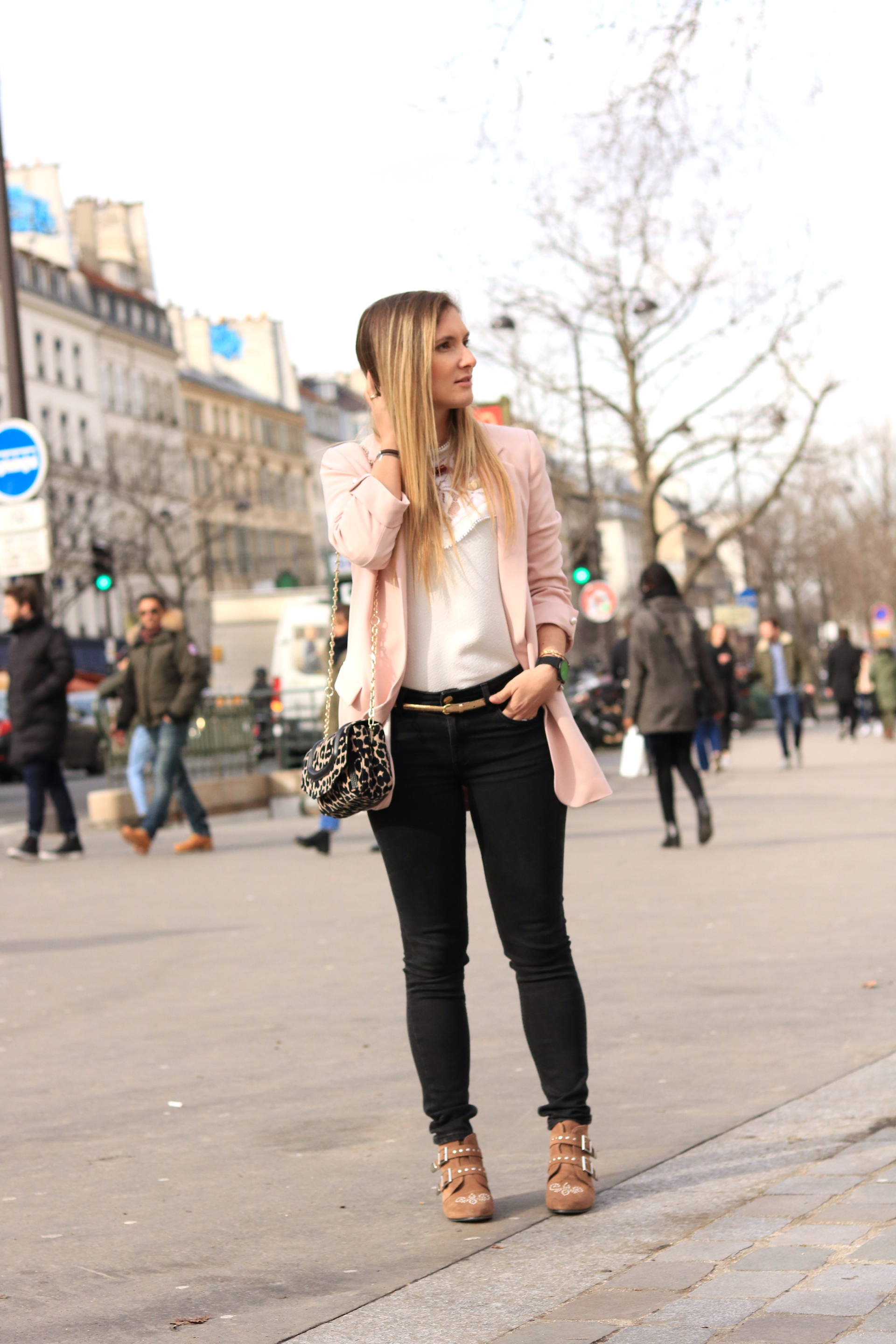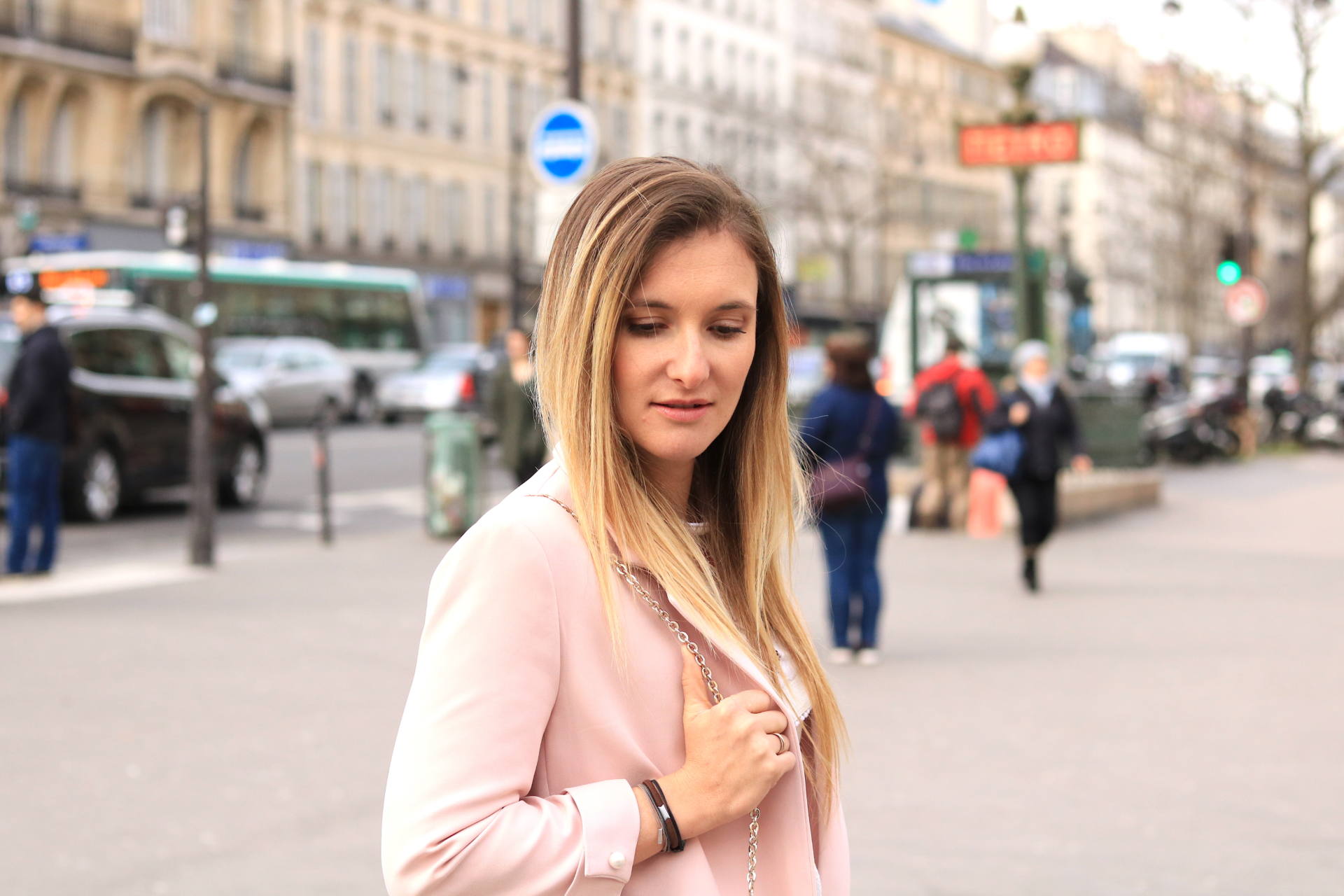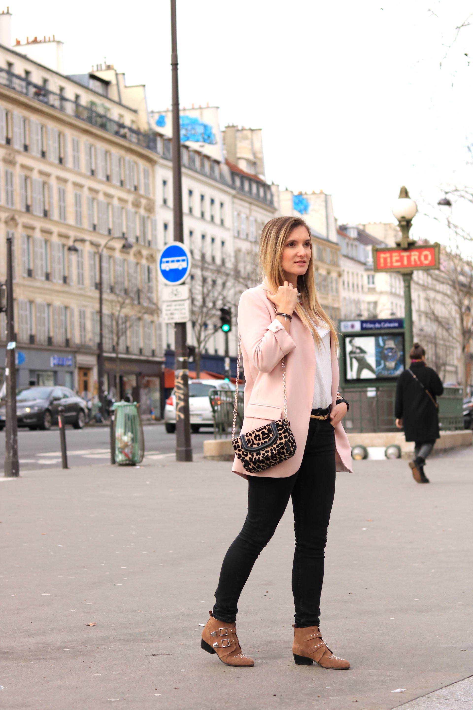 Revenons-en à ce look pris en photo par Emma que j’ai justement rencontrée chez Bobbies et avec qui j’ai déjeuné le lendemain. J’avais très envie de porter mon nouveau blazer rose poudré trouvé chez Zara. J’ai craqué pour les manches 3/4 avec des petites perles en guise de « boutons de manchette ». Je le trouvais un peu long mais je l’ai finalement gardé ! Je pense qu’il sera encore plus beau porté avec des talons mais pour Paris, j’ai opté pour mes nouvelles bottines camel hyper confortables ! J’ai bien fait car j’ai pas mal marché ce jour-là ! Côté vêtements, mon jean Sézane est de l’année dernière, tout comme ma blouse, mais je les adore ! Je ne vous présente plus mon sac. Chaque année, j’ai un favori, et cette année, c’est celui-ci. Il a la taille idéal et j’avais craqué sur ce motif graou vraiment beau ! En ce moment, il est bien soldé donc c’est le moment de craquer ! Allez, je vous laisse avec les photos, soyez indulgentes, vous savez que je ne m’aime pas vraiment en jean ! Et si ça vous dit, un petit commentaire me fait toujours très plaisir ! Et si ça vous tente, mes autres looks sont ici !
