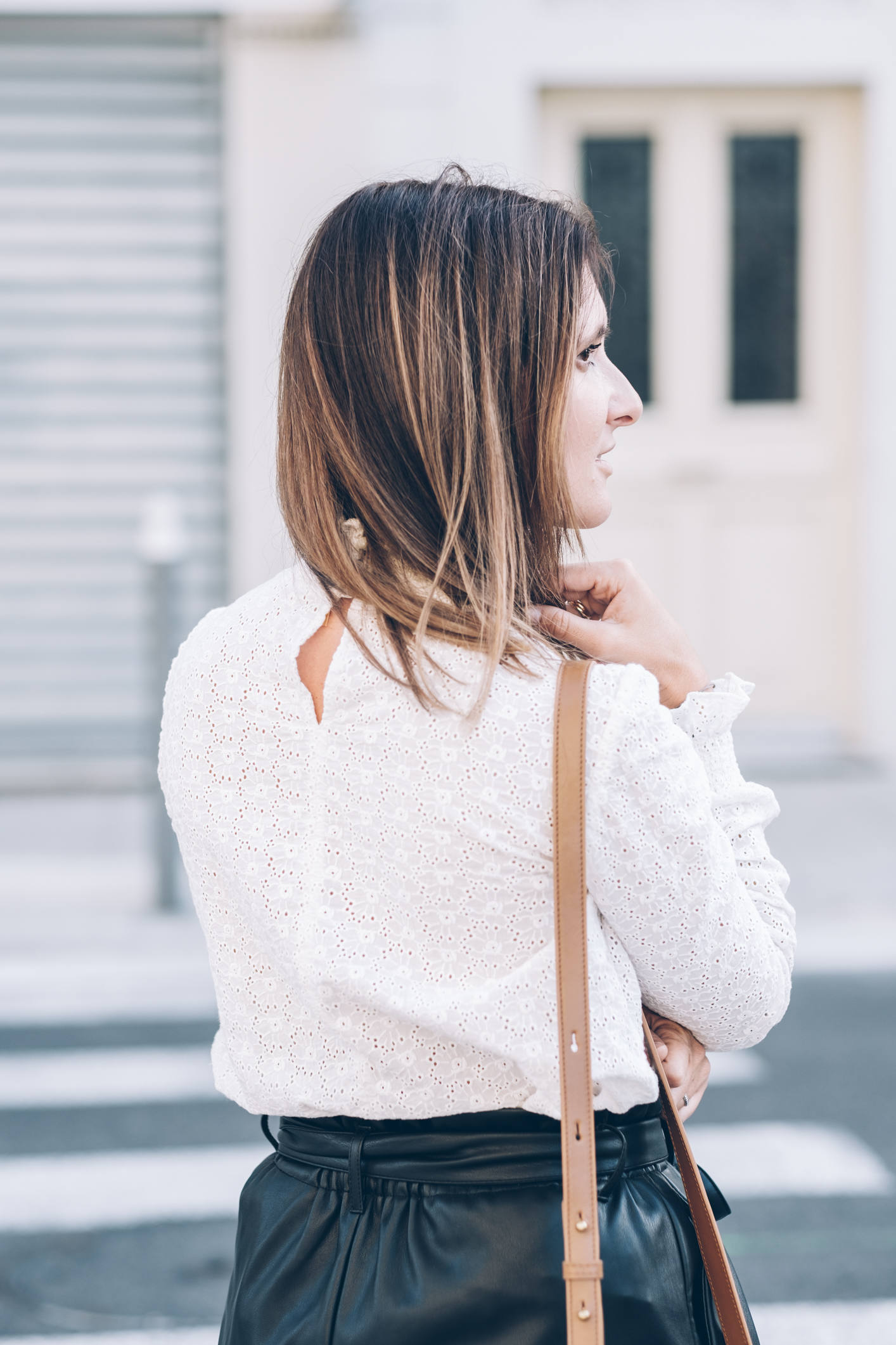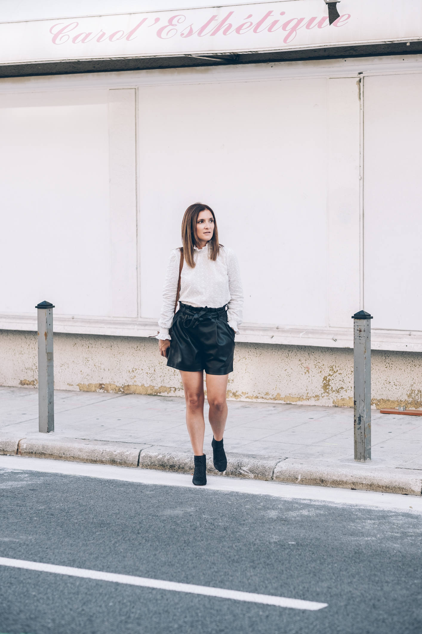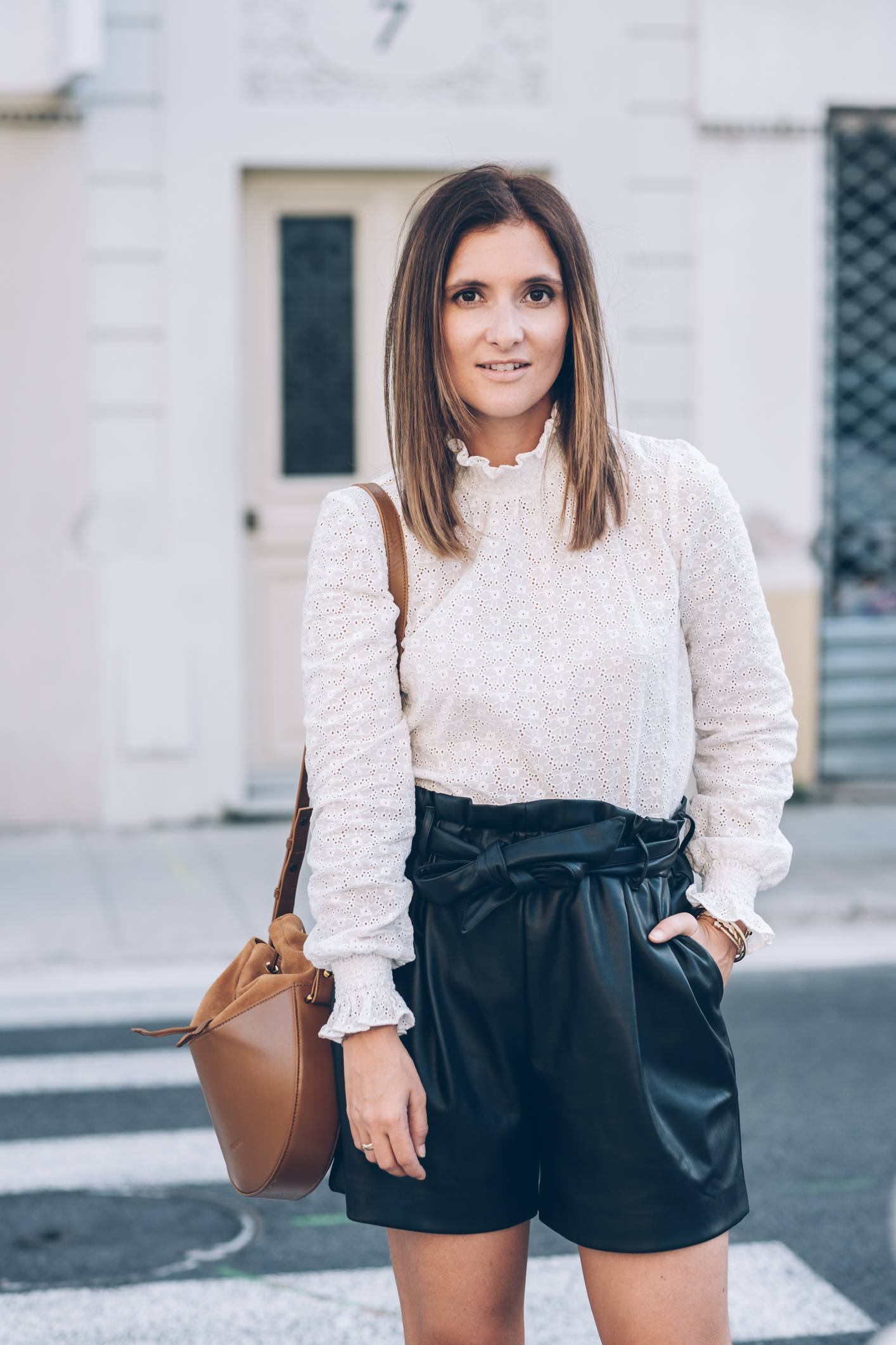 Je crois que tout est dans le titre ! Le cuir et la dentelle, c’est presque une de mes associations préférées. D’ailleurs, au printemps, je vous proposais déjà un look avec un short en cuir et de la dentelle blanche, mais c’est pas pareil, cette fois, c’est avec ma blouse pré-fé-rée de la saison ! J’ai nommé Cathy, cette superbe blouse banche qui a tout ce que j’aime : une belle dentelle, des poignets smockés et un magnifique col ! Autant vous dire qu’à peine je l’ai vue, je l’ai mise dans mon panier. C’est ce qu’on appelle un gros coup de coeur ! J’ai dû attendre pour la porter car l’été durait un peu trop et mine de rien, elle tient vraiment chaud parce qu’elle est épaisse, avec un col bien haut, et à manches longues ! Mais la fraîcheur est arrivée donc j’en profite. Quand je vous ai préparé les photos de ce look, on était encore à 25 degrés. En une semaine, pendant que j’étais à Marrakech, on en a perdu 10, j’ai remis des collants et j’ai beaucoup moins le smile ! Je rigole bien sûr, tout ça pour vous dire que ce look est largement adaptable avec des collants et un manteau plus épais. Je porte souvent cette tenue et j’adore. Le short, je n’en reparle pas, vous le connaissez, un modèle de chez Zara dont j’aime beaucoup trop la coupe. Par contre, les chaussures, vous ne les avez jamais vues ! Elles sont aussi de chez Sézane, comme la blouse, c’est aussi un énorme coup de coeur et malgré la hauteur, elles sont confortables (je dois dire que je ne m’y attendais pas) ! Vu qu’elles sont tressées, ce que j’aime par dessus tout en maroquinerie et chaussures, ce n’est pas compatible avec un jour de pluie par exemple. Par contre, on peut tout à fait les porter avec des collants pas trop opaques, et le rendu est tout aussi beau. Là, je portais des mini-chaussettes basses couleur chair, c’est parfait ! Si vous me suivez depuis l’époque où je partageais mes looks quotidiens devant le miroir, vous le savez, les looks en noir et blanc, c’est bien ce que je préfère et j’y reviens très souvent.