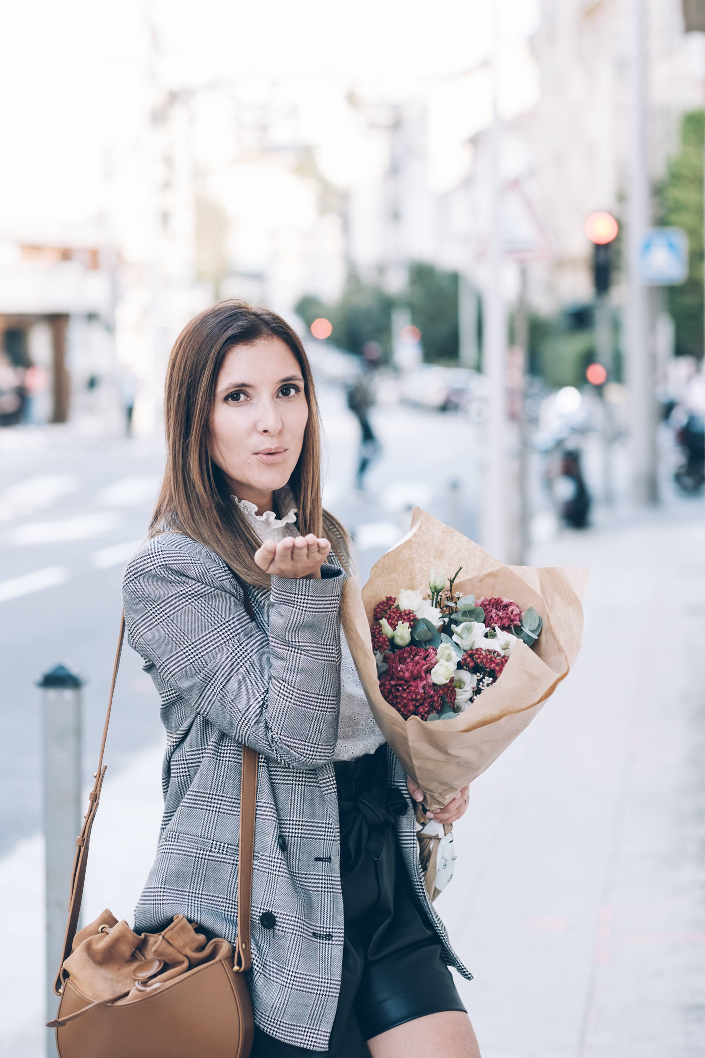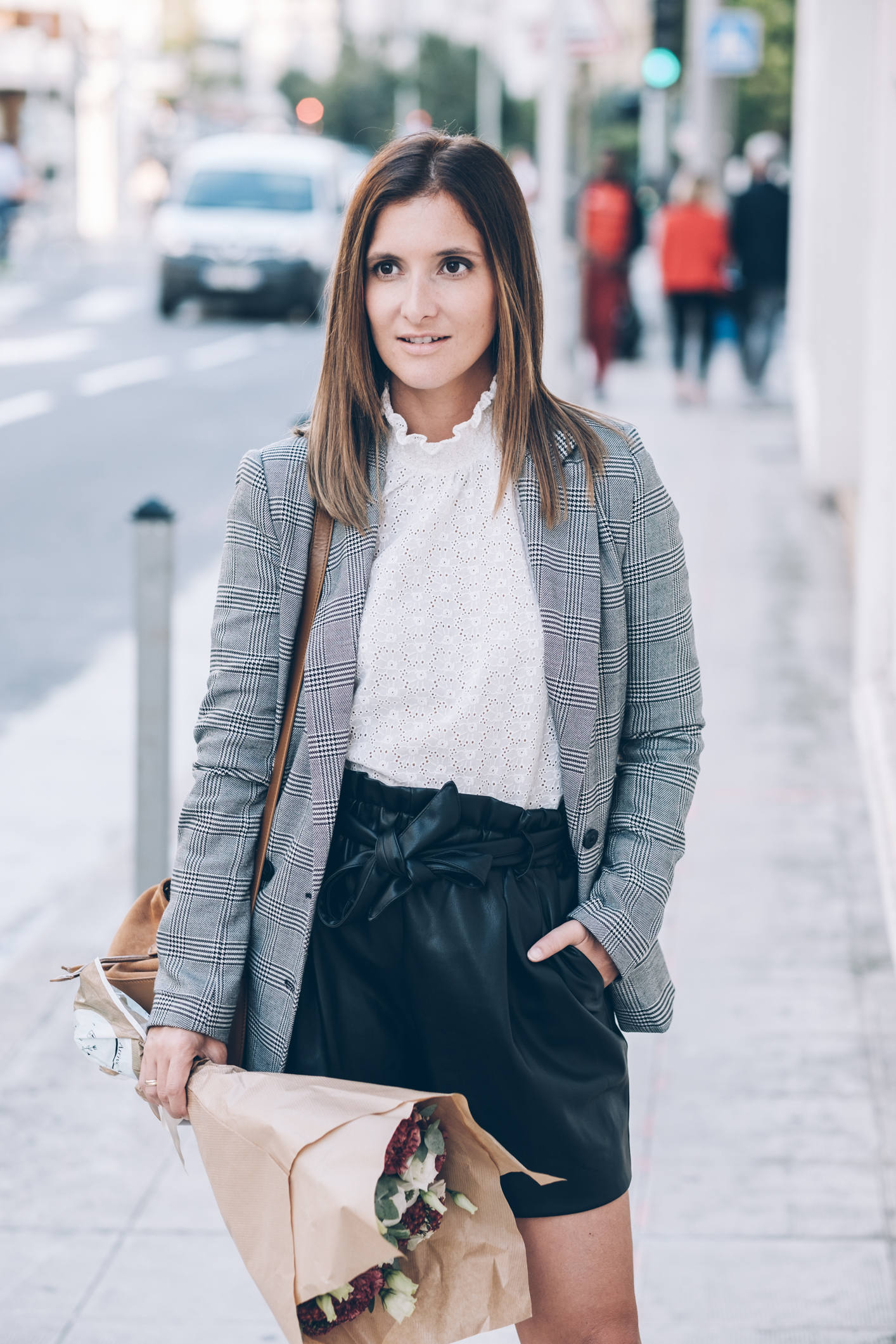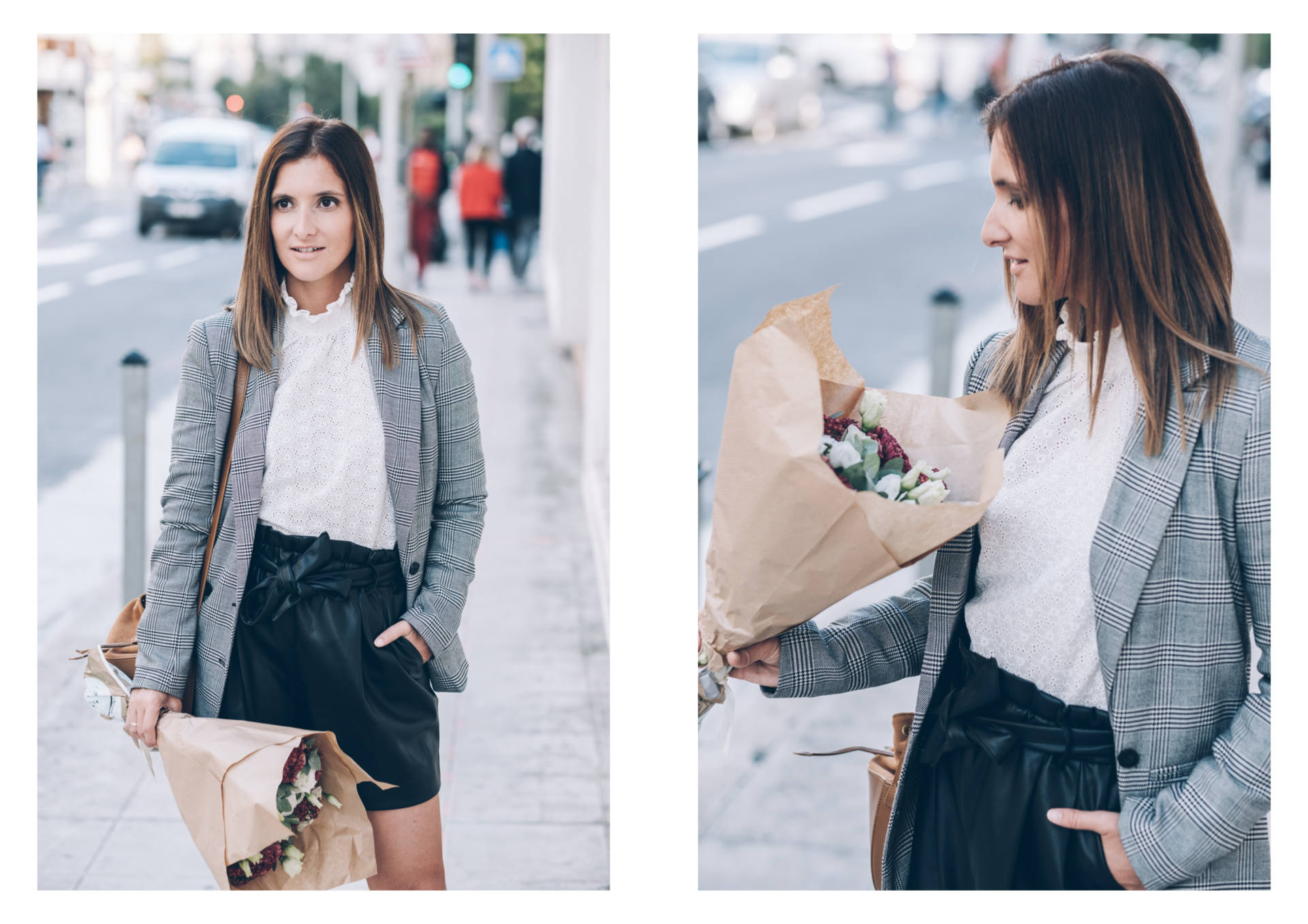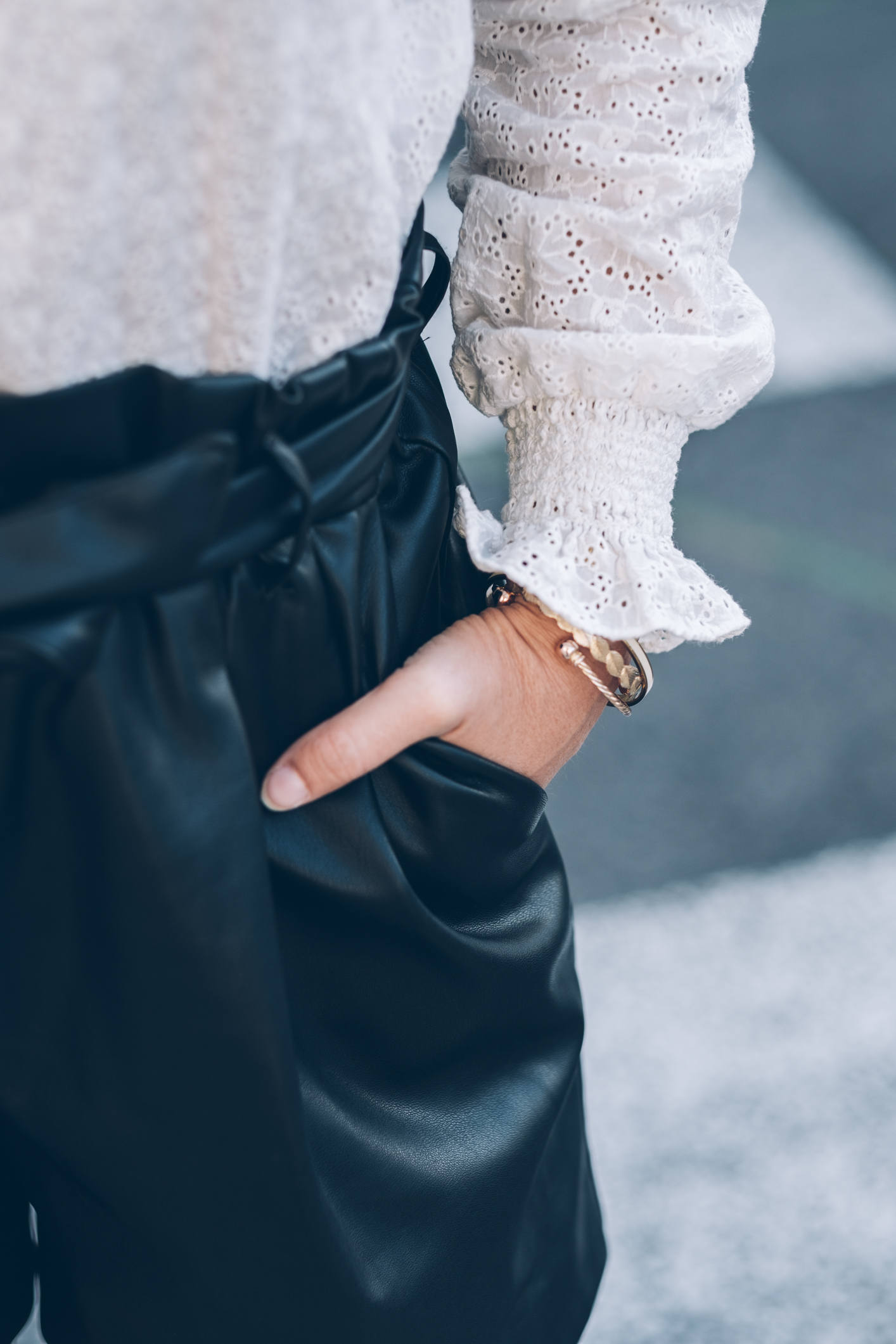 Je crois que tout est dans le titre ! Le cuir et la dentelle, c’est presque une de mes associations préférées. D’ailleurs, au printemps, je vous proposais déjà un look avec un short en cuir et de la dentelle blanche, mais c’est pas pareil, cette fois, c’est avec ma blouse pré-fé-rée de la saison ! J’ai nommé Cathy, cette superbe blouse banche qui a tout ce que j’aime : une belle dentelle, des poignets smockés et un magnifique col ! Autant vous dire qu’à peine je l’ai vue, je l’ai mise dans mon panier. C’est ce qu’on appelle un gros coup de coeur ! J’ai dû attendre pour la porter car l’été durait un peu trop et mine de rien, elle tient vraiment chaud parce qu’elle est épaisse, avec un col bien haut, et à manches longues ! Mais la fraîcheur est arrivée donc j’en profite. Quand je vous ai préparé les photos de ce look, on était encore à 25 degrés. En une semaine, pendant que j’étais à Marrakech, on en a perdu 10, j’ai remis des collants et j’ai beaucoup moins le smile ! Je rigole bien sûr, tout ça pour vous dire que ce look est largement adaptable avec des collants et un manteau plus épais. Je porte souvent cette tenue et j’adore. Le short, je n’en reparle pas, vous le connaissez, un modèle de chez Zara dont j’aime beaucoup trop la coupe. Par contre, les chaussures, vous ne les avez jamais vues ! Elles sont aussi de chez Sézane, comme la blouse, c’est aussi un énorme coup de coeur et malgré la hauteur, elles sont confortables (je dois dire que je ne m’y attendais pas) ! Vu qu’elles sont tressées, ce que j’aime par dessus tout en maroquinerie et chaussures, ce n’est pas compatible avec un jour de pluie par exemple. Par contre, on peut tout à fait les porter avec des collants pas trop opaques, et le rendu est tout aussi beau. Là, je portais des mini-chaussettes basses couleur chair, c’est parfait ! Si vous me suivez depuis l’époque où je partageais mes looks quotidiens devant le miroir, vous le savez, les looks en noir et blanc, c’est bien ce que je préfère et j’y reviens très souvent.
