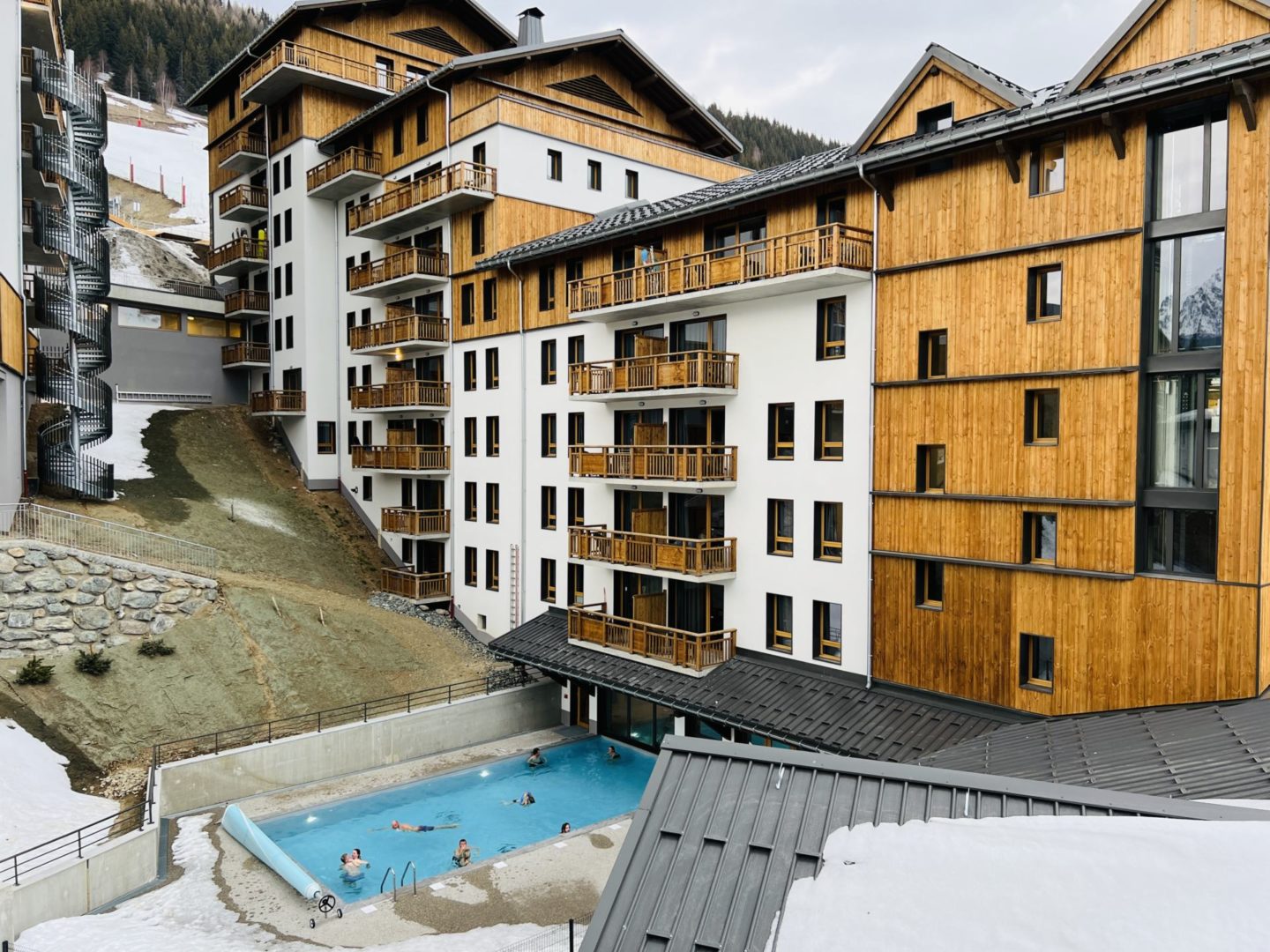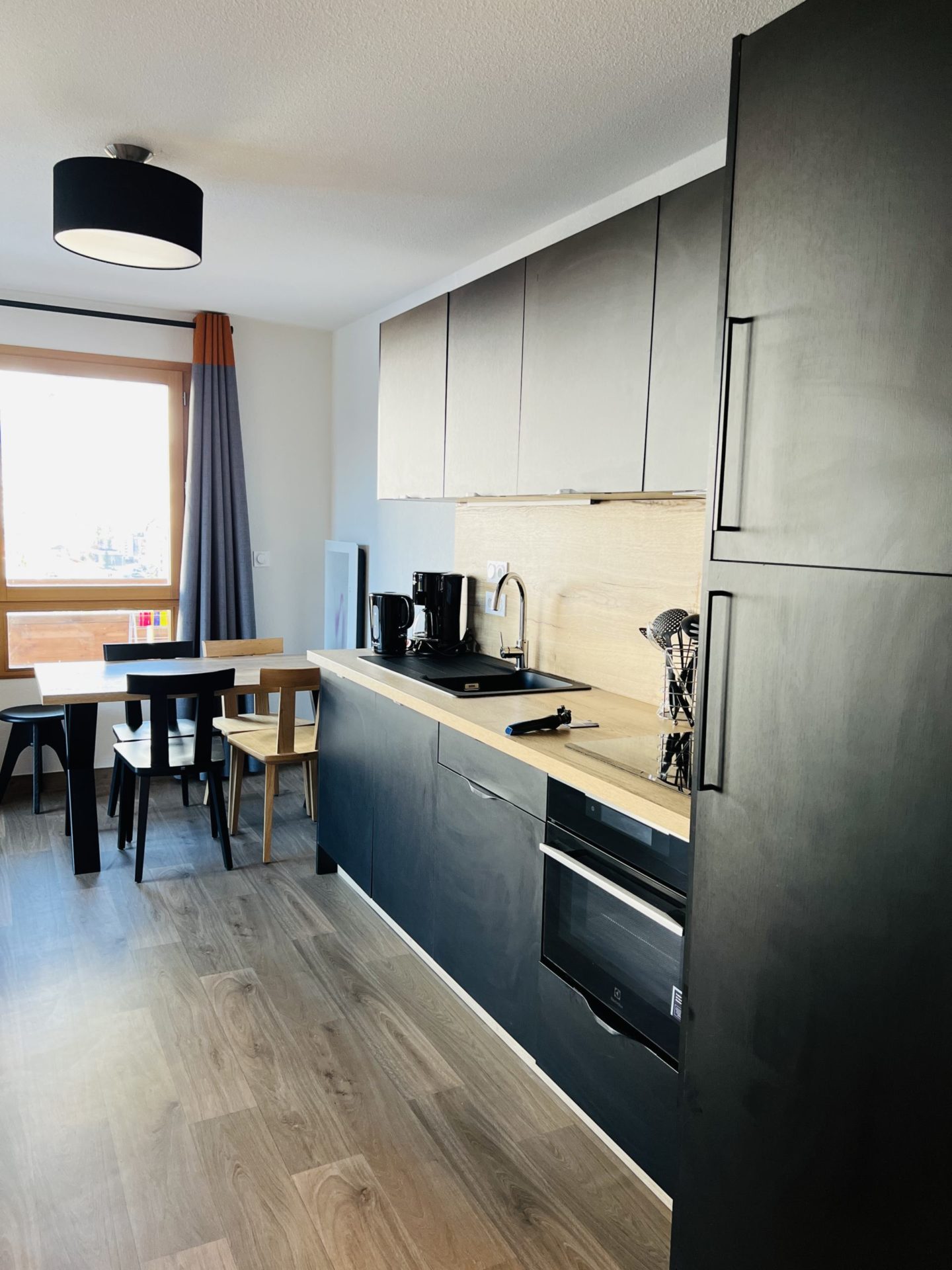 Cette fois, nous avons logé au MMV Les Clarines, une résidence qui a ouvert en décembre 2021 donc qui est toute récente ! On avait un appartement Confort pour 6 personnes avec un salon/salle à manger/cuisine incluant un canapé convertible, puis un coin nuit avec deux chambres doubles et deux salles de bains, ainsi qu’un super magnifique balcon nous offrant une belle vue sur la station et le domaine. C’est vraiment l’idéal. La cuisine est aussi bien équipée que chez nous : plaques vitro-céramiques, lave-vaisselle, grand frigo, beaucoup de vaisselle, des plats, un appareil à fondue … Il y a aussi un kit entretien complet à l’arrivée avec du liquide vaisselle, du nettoyant pour les surfaces, une éponge, des pastilles pour le lave-vaisselle. C’est appréciable de ne pas avoir à aller acheter de gros pots qu’il faut ensuite ramener chez soi !