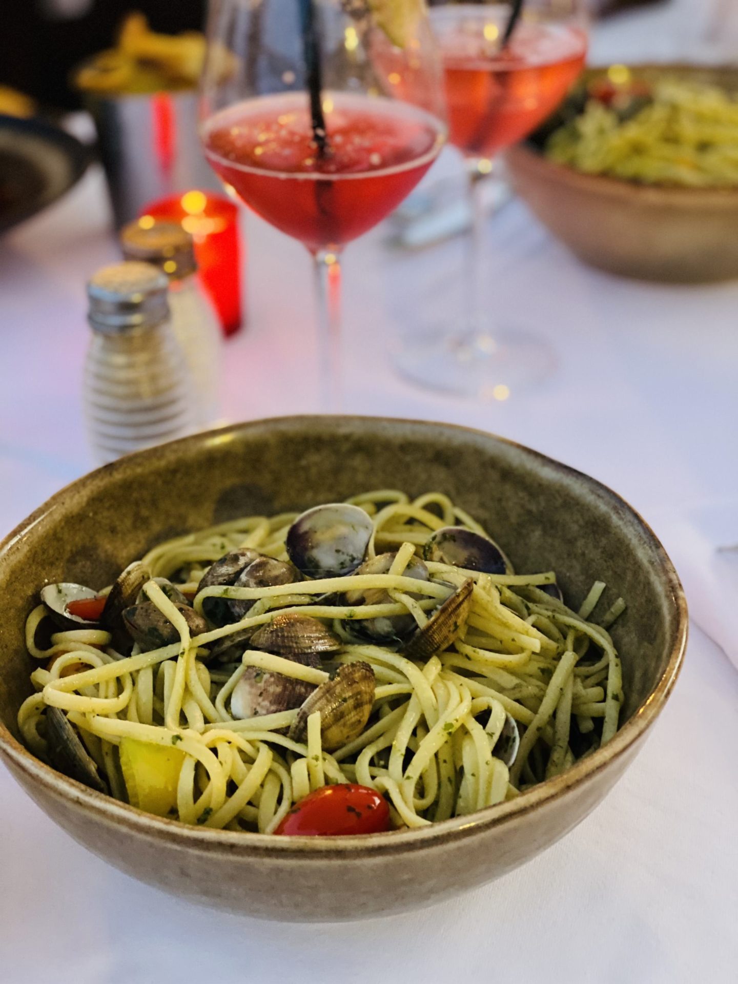 Ouverte l’an dernier (2020), j’avais pas encore eu l’occasion de la tester La Baïeta, mais c’est chose faite, et quelle bonne surprise ! J’y suis allée avec 2 copines et on a passé une bonne soirée ! Des cocktails originaux et délicieux, à l’instar du mien : chambre, purée de fraise et citron, et des plats gourmands. On a testé les croquettes de poulet et la pissaladière pour accompagner nos apéritifs, et on s’est régalés. Côté plat, l’une à pris le poulpe. Hormis des frites surgelées, c’était apparemment très bon. Quand à mes pâtes alla vongole, il y avait la juste quantité et le goût était là. Je n’avais plus trop faim pour un dessert mais j’ai partagé un cookie avec ma copine. Pas fou mais tout de même bon. En voyant les desserts des tables voisines et leurs réactions, ça m’a donné envie d’en tester d’autres ! Au niveau de l’ambiance, on était sur une soirée saxo, et perso, j’ai adoré ! Bonne ambiance, bonne musique, le genre d’endroits que j’aime bien pour les soirées d’été ! Pas l’idéal pour un dîner romantique/calme ou famille, mais entre amis, avec des copines ou en couple, c’est top ! Côté budget, pour 3 cocktails, 2 entrées, 3 plats et 2 desserts, 150€ ! PS : J’avais remarqué que les notes sont pas top sur les sites d’avis, mais perso, pas de mauvaise expérience !