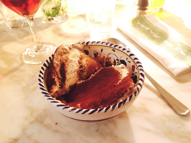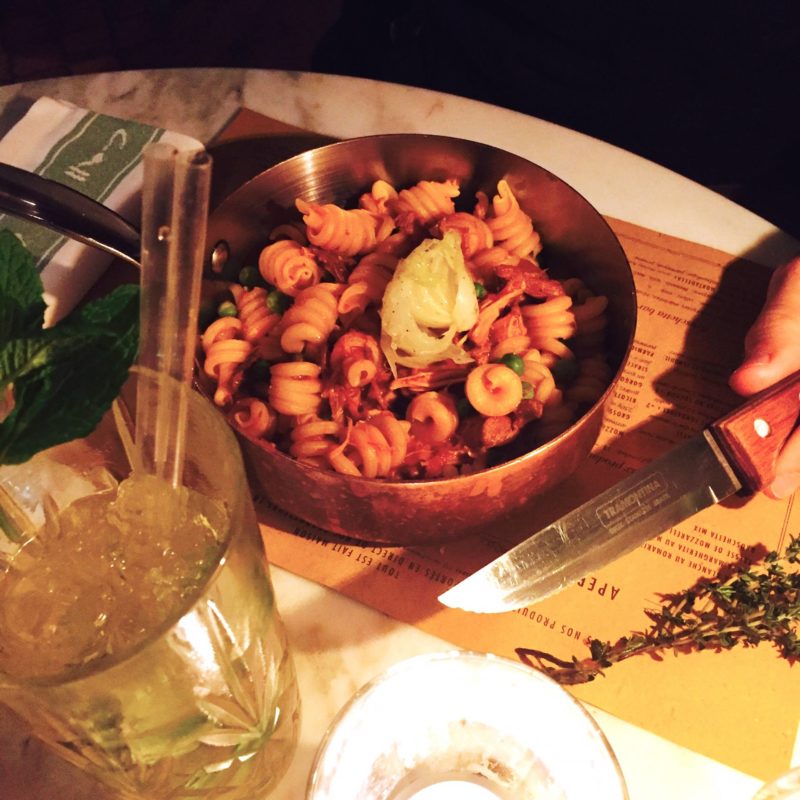 En entrant dans le restaurant, l’odeur qui se dégageait était dingue. Ca sentait les plats mijotés, la pizza, toutes ces odeurs que j’adore. Après les odeurs, je vois la décoration qui est vraiment très moderne. C’est cosy, à mi-chemin entre le concept-store, le bistrot et la maison de ville. C’est à dire qu’on s’y sent bien, comme chez soi et que c’est surtout très bon. Parlons peu, parlons food ! J’ai commencé avec un cocktail à base de lambrusco qui était très bon, très frais. Avec mon chéri, on a tous les deux opté pour le même plat : une bolognaise de lapin de 9h, petits pois et oignons nouveaux. C’est simple, c’est le meilleur plat de pâtes qu’on ait mangé ! Le goût était parfait, l’assaisonnement impeccable, les cuissons étaient comme on les aime. C’était vraiment exactement ce dont on avait envie, en mieux ! Côté dessert, Steph a choisi le choco-love, un dessert avec du chocolat, de la chantilly, du cookie, et il a adoré ! Pour ma part, j’ai évidemment pris le tiramisu ! Il est proposé en version classique ou aussi en version tiramisu banane façon bannofie pie ! J’ai pris le classique et il était vraiment excellent ! J’aime ce dessert depuis peu et c’est un des meilleurs que j’ai mangé, si ce n’est le meilleur. Avant de partir, on a vu une pizza sortir du restaurant et elle avait l’air trop bonne, avec la pâte exactement comme j’adore ! De quoi me donner envie de revenir chez East Mamma !