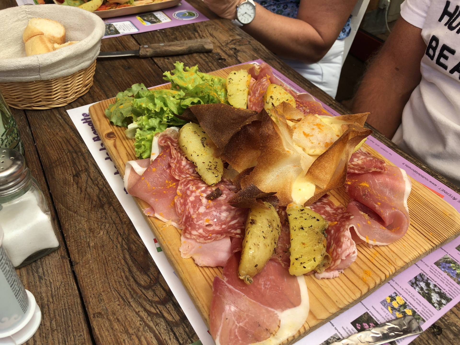 • La cave : C’est un restaurant avec une jolie vue sur le village. Il faut demander à être sur la terrasse panoramique couverte. C’est super bon, pas cher du tout et bien copieux !   On vous recommande la daube, et les amateurs ont adoré la tartiflette (oui, en été !). Les pizzas sont fines et excellenges. Compter 2€ pour un verre de vin, 3€ pour un kir, 9-10€ pour une pizza, 13-15€ pour un plat ! Le seul hic, on a attendu jusqu’à 1h pour être servi et on ne l’a pas été tous en même temps. Certains avaient fini quand les derniers ont été servis. Pas idéal !
