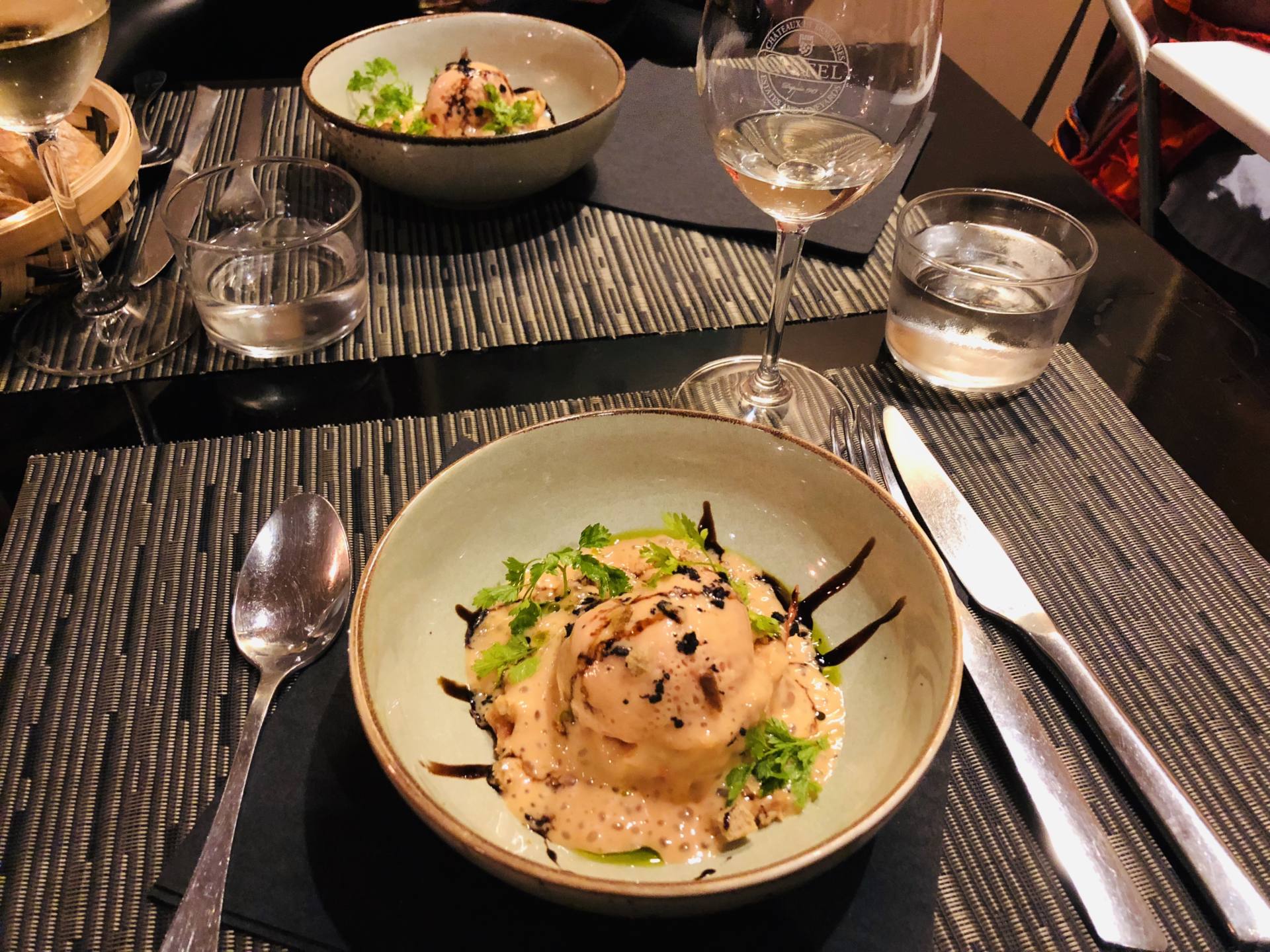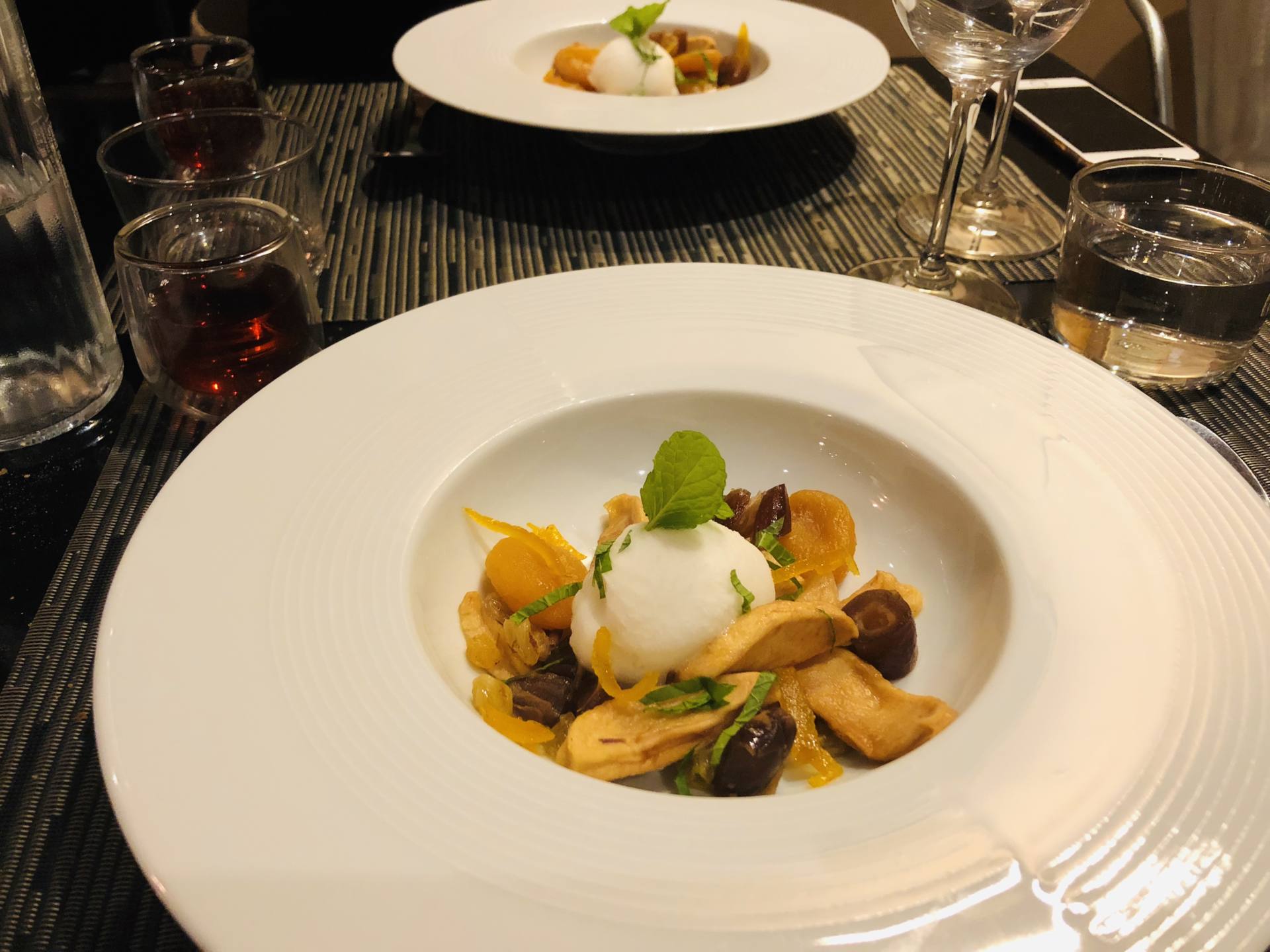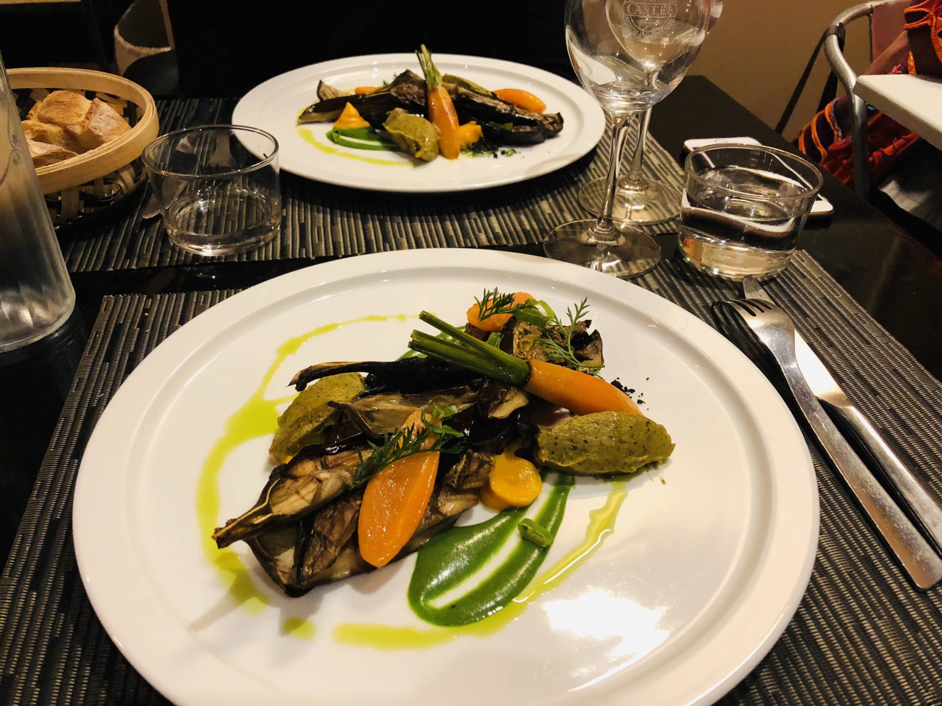 Je suis allée manger dans ce restaurant le vendredi soir en arrivant, avec ma copine. J’ai découvert une adresse canon avec une décoration comme j’aime et une cuisine apparente. On a toutes les deux opté pour le menu vegan à 24€ qui incluait ce jour-là une soupe de tomate avec de la tomate glacée, des légumes de saison sautés ainsi qu’un dessert d’inspiration marocaine. On s’est vraiment régalés, de très beaux dressages dans les assiettes, des ingrédients de qualité, des recettes bien travaillées. Exactement le type de restaurant que j’adore. Pour le menu classique, il faut compter 32€. Le soir, l’ambiance tamisée donne une ambiance hyper agréable !