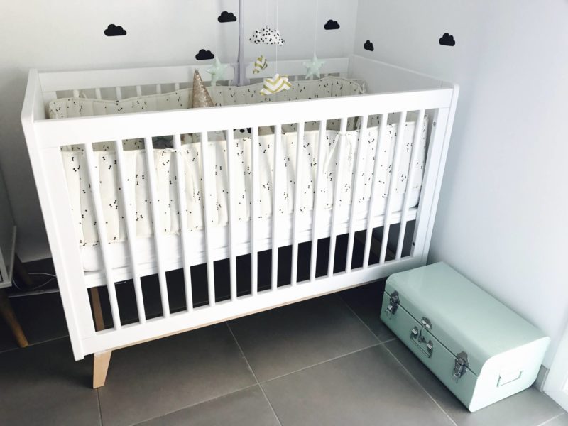 On a évidemment choisi un lit. Je dis évidemment mais ce n’est pas si évident puisqu’aujourd’hui, beaucoup de parents optent pour la méthode Montessori ou d’autres méthodes qui préconisent un sommeil au sol, sur un matelas, sans lit à barreaux, du moins de ce que j’ai compris ! Nous, on a opté pour un lit ! On a hésité avec plusieurs modèles et on a finalement choisi le lit SWEET de chez Maisons du Monde. Il a des pieds compas en bois qui reste dans l’esprit de la décoration de l’appartement et la structure est blanche. Il est assez classique, dans un design type scandinave, comme j’adore. Il a deux options de couchage : à mi-hauteur pour le début, tout en bas quand elle saura se redresser ! Il n’est pas évolutif et c’est un choix. On sait que nos goûts évoluent et en grandissant, on aura sûrement envie de faire évoluer sa chambre ! On a beaucoup cherché un bon matelas car il y en a à tous les prix et de toutes sortes. On voulait qu’elle soit bien, qu’il soit assez durable pour ne pas avoir à le changer, qu’il soit suffisamment dur pour ne pas s’affaisser et pas trop non plus. On a finalement acheté le matelas Bambou Soft de Candide qui est ferme mais très confortable pour elle ! On a pris les drap-housses Kiabi. Ils sont à 5€ et franchement très bien. Prenez-en deux, c’est plus pratique quand on lave le premier !