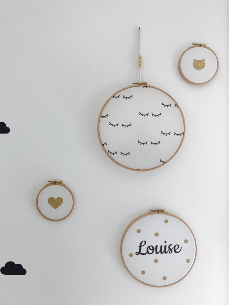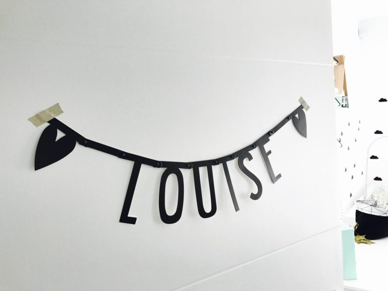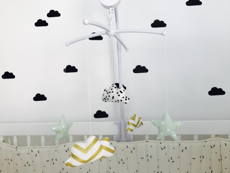 Au-dessus de son lit, on a mis un mobile personnalisé ! J’avais beaucoup aimé ceux de chez Made By Cycy découverts sur Instagram donc on en a fait faire un aux couleurs de la chambre avec du noir, du blanc et du mint. Il fait de la musique. On a un autre mobile musical qui est dans son lit et que j’adore. Il vient de chez Pompon Pétillant et il est trop beau avec des couleurs pastel et des sequins doré rose ! On aimait bien le mettre sur la table à langer pour que Louise ait l’esprit occupé pendant qu’on la changeait !