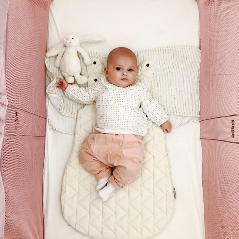 A l’intérieur de son lit, on a quelques doudous. On aime bien son petit lapin Jellycat et elle aussi. Il est tout doux, elle peut chopper ses petites oreilles fines et longues et ça l’apaise. On a aussi quelques grosses peluches. Pour l’instant, enfin jusqu’à maintenant, elle bougeait peu donc on les mettait au fond du lit.