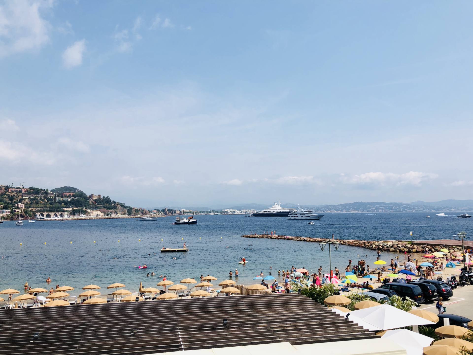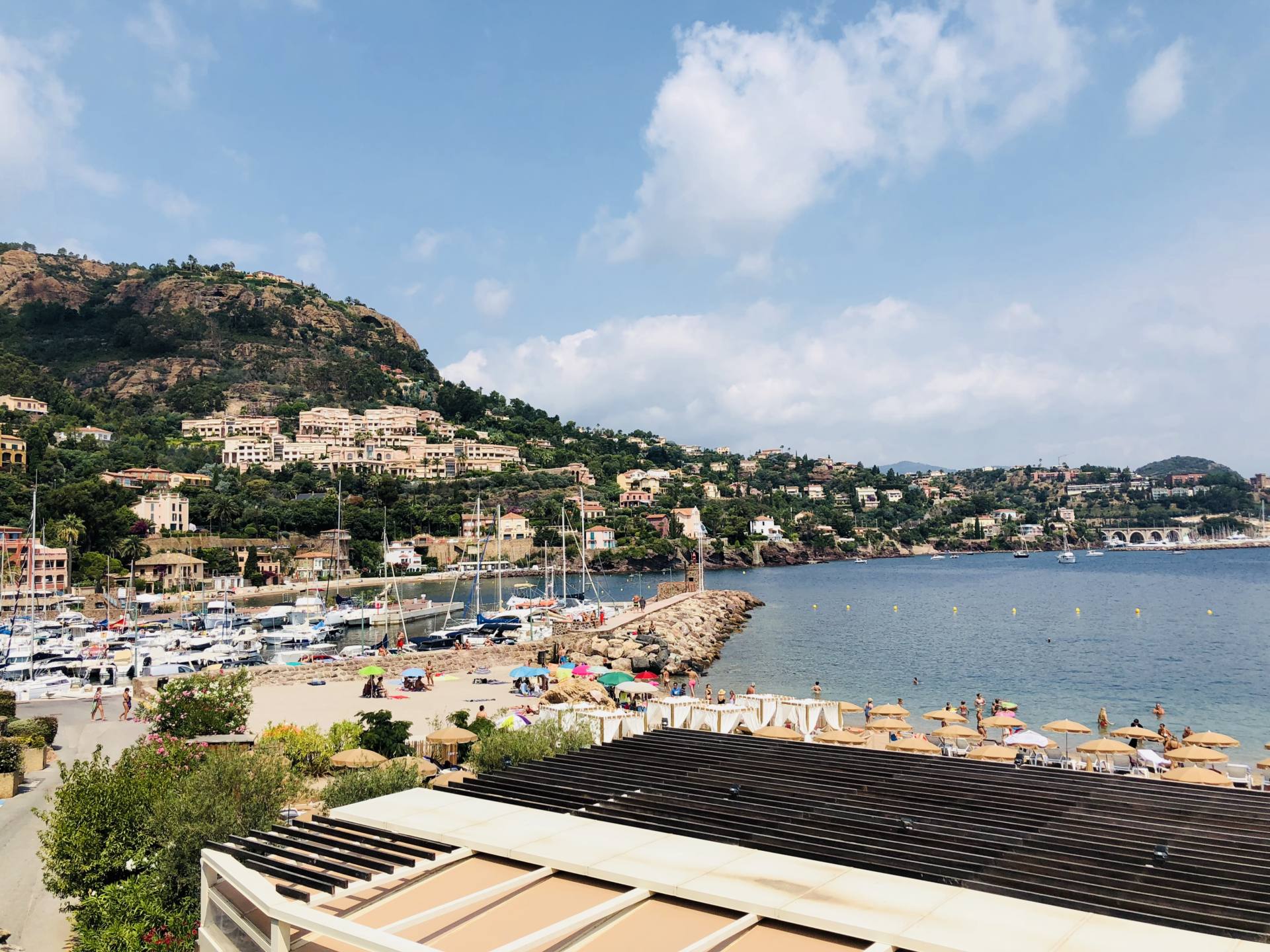Je ne vous parle pas de l’endroit qui est très sympa puis la plage est en fait une petite anse où il n’y a pas de jet ski, pas d’activités natutiques, juste des baigneurs, et au loin, les yachts ! La vue est aussi superbe puisque des deux côtés, on aperçoit les roches rouges de l’Esterel et le vallonnement qui va avec ! Il y a aussi le château de Théoule derrière, et le château de Mandelieu, devant, au loin ! C’est beaucoup plus naturel que la partie de Côte d’Azur où je vis. C’est moins littoralisé donc on se sent encore plus en vacances ! Si vous passez vos vacances près de chez moi, je vous conseille quand même d’aller faire un tour du côté de l’Esterel ! J’avais fait deux articles sur un tour de vélo que j’avais fait sur la fameuse Corniche d’Or et sur une randonnée dans l’Esterel, ça vous donnera une idée des panoramas qu’on y retrouve. C’est superbe !