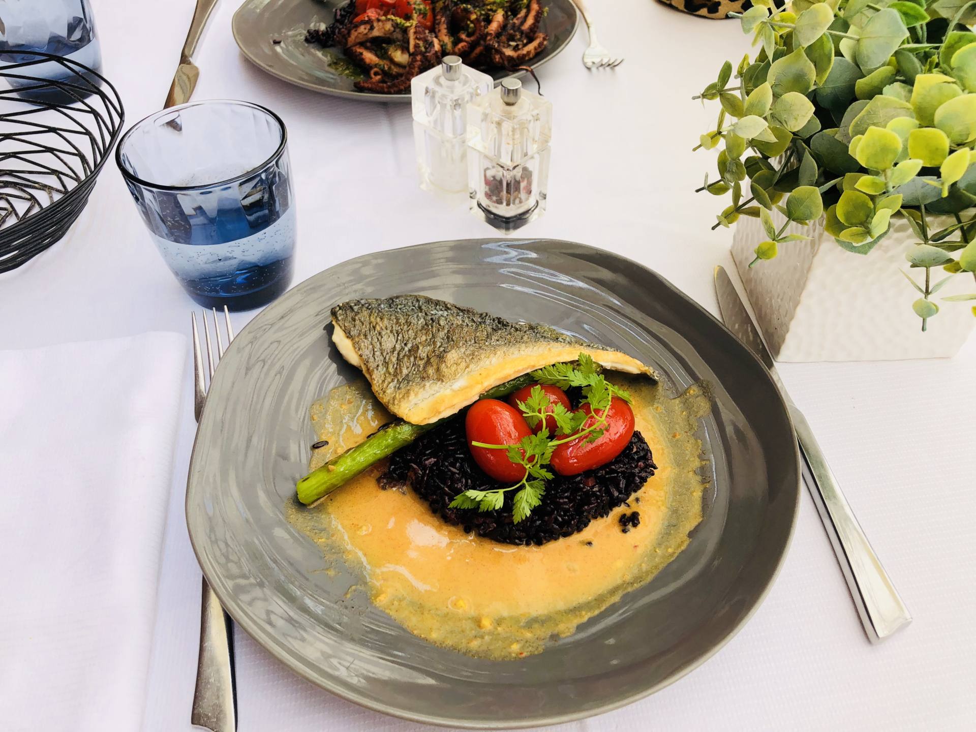Côté lunch, on a goûté un cocktail à base de limoncello, prosecco, jus d’ananas et vanille. Un délicieux mélange mais attention, avec le soleil, ça assome un peu ! Pour le déjeuner, j’ai trouvé sur la carte l’entrée que je préfère avec l’association betterave-chèvre-huile de noisettes. Ça va très bien ensemble et j’adore ça depuis que j’ai découvert cette entrée dans un restaurant de Nice dont je vous ai parlé dans un des tous premiers articles du blog, c’est par ici ! D’ailleurs, je refais souvent des recettes à base de betteraves chez moi, comme celle-ci par exemple ! On avait pas prévu de prendre une entrée donc du coup, on a partagé ! Par la suite, tout me donnait envie, la carte correspond vraiment à ce que j’aime avec beaucoup de poissons. Ma copine a pris le poulpe grillé à la plancha, et moi, le filet de dorade avec un jus de custacés. Dé-li-cieux ! C’était servi avec du riz noir (franchement, je devrais en faire parfois !), des tomates rôties et des asperges. Très très bon. On a pas pris de dessert, on avait plus faim, puis avec les beds à la journée sont incluses une bouteille d’eau et une grande salade de fruits à partager. Ça nous suffisait largement ! Franchement,on se régale au Magellan, ce sont de bons produits.