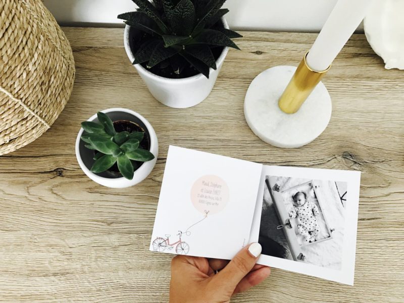 On a opté pour le format triptyque du modèle bicyclette. En tant que parents bien gagas, on s’est dit que c’était plus cool car il y a plus de photos, ce qui fait toujours plaisir aux personnes que l’on a pas encore vues ou qui n’ont pas internet pour pouvoir leur en envoyer régulièrement. Soyons clairs, c’est aussi à nous que ça faisait plaisir ! C’est aussi un peu plus original que ceux qu’on a l’habitude de voir donc on a craqué ! Et franchement, on est vraiment hyper content. Le papier est épais, les couleurs sont douces et l’illustration est vraiment canon. Les photos ressortent super bien et le rendu final est comme on se l’imaginait. On a choisi des photos de ses premières semaines et ça nous a fait bizarre de la revoir si petite.