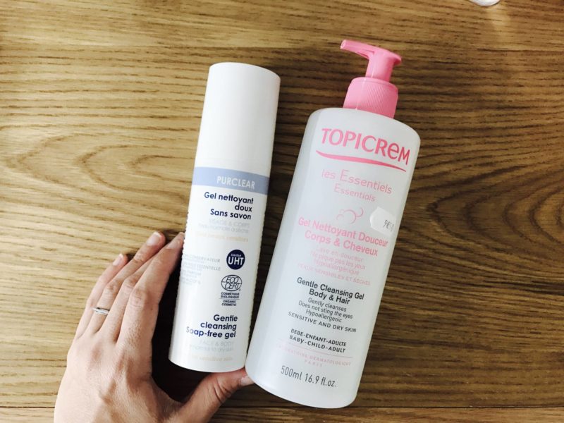 Ma peau n’a pas spécialement changé mais j’avais besoin de soins cocooning, agréables, légers et doux. Je me suis tournée vers des marques et des produits que je ne connaissais pas forcément et que je n’avais pas l’habitude d’acheter ou de tester. Finalement, ça fait du bien de sortir de ce qu’on a l’habitude d’utiliser. Pour le corps, j’alterne entre deux gels douche adaptés pour les peaux sensibles : le gel nettoyant douceur de Topicrem et le gel nettoyant doux de Dermatherm. J’ai découvert le premier dans une GlossyBox en petit format. Je l’avais pris pour la maternité et je l’ai adoré donc je l’ai racheté en grand format. Je teste le 2ème en alternance avec Topicrem et il est extrêmement doux, ce qui est très agréable en cette période post-accouchement.