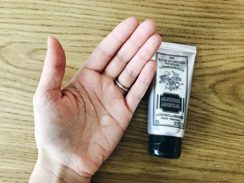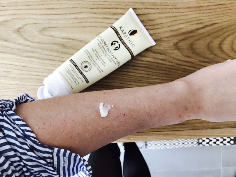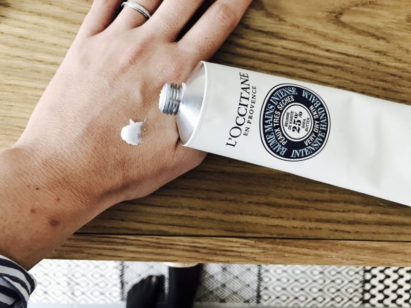 Pour hydrater ma peau, j’utilise en ce moment un beurre de karité de la marque Karethic. Après avoir utilisé des huiles pendant la grossesse, je suis contente de pouvoir utiliser aussi des baumes. J’aime beaucoup cette marque que j’avais découverte dans ma box Nuoo et que je retrouve maintenant sur le site EF Bio Cosmétiques. La texture est assez ferme en sortant du tube mais c’est finalement très fondant, j’aime beaucoup. Pour les mains, je suis toujours fidèle à L’Occitane depuis des années. En ce moment, j’utilise le nouveau baume mains intense avec 25% de karité et il est dingue ! Pour l’hiver, c’est vraiment l’idéal ! Je ne vais pas skier cette année mais c’est typiquement le genre de crème qui pouvait me manquer. J’ai aussi un gel nettoyant petit format du Couvent des Minimes à mettre dans mon sac à mains. C’est mon nouveau rituel depuis que Louise est née. J’ai pris l’habitude d’en mettre avant de la toucher ou de manipuler ses petites affaires.