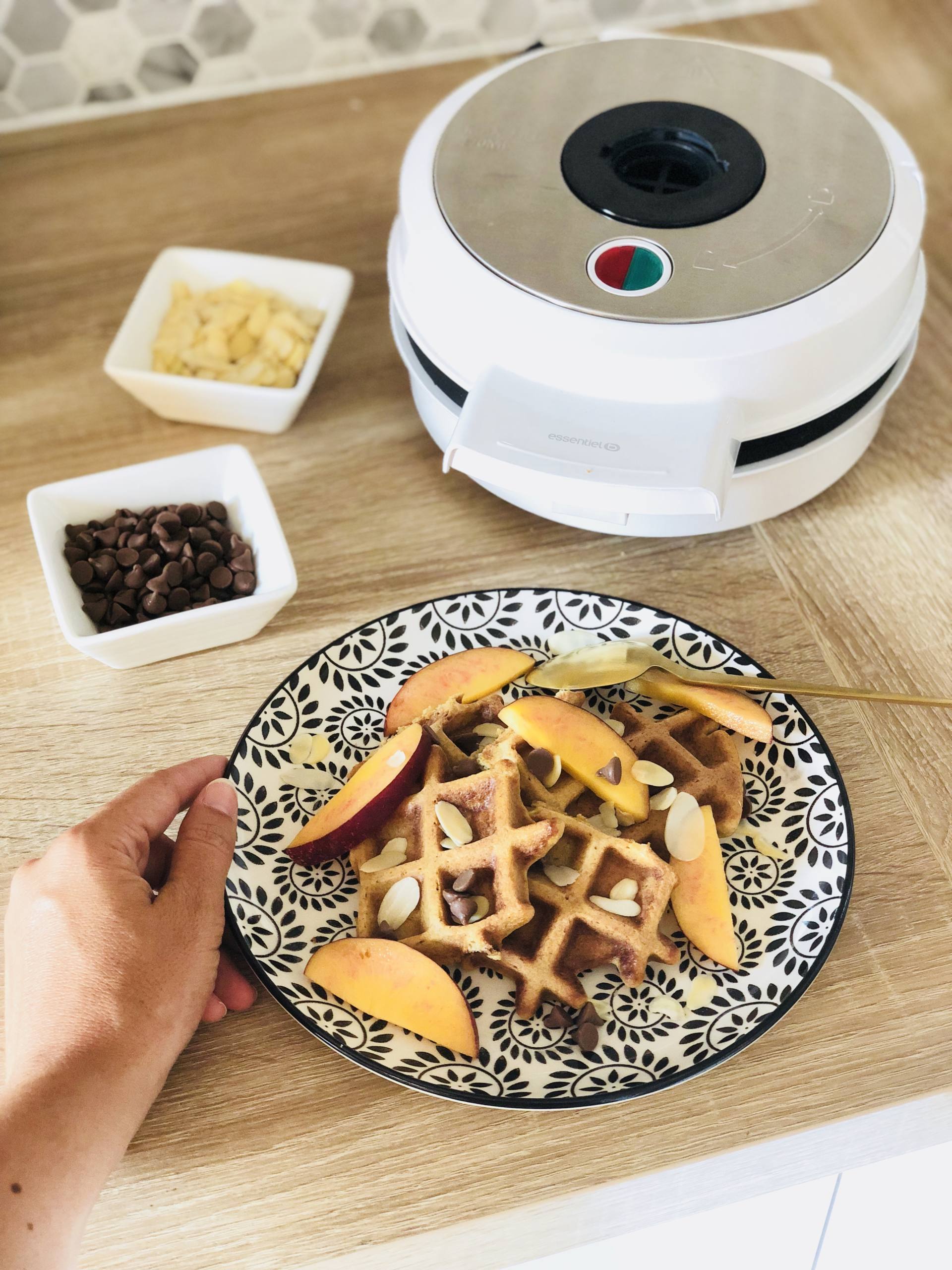 La semaine dernière, j’ai fait des gaufres et vous l’avez vu dans mon premier Summer vlog que je vous mets ici. Un matin, comme ça, j’ai eu envie de gaufre. J’ai un nouveau gaufrier depuis six mois vu que le précédent nous a lâché ! Pour celles qui m’ont demandé, c’est un de chez Boulanger, celui-ci. Celui-ci fait une forme de gaufre ronde et j’ai eu envie de tenter une recette de gaufre healthy. On est d’accord, healthy ne veut pas dire diététique ! Healthy veut littéralement dire sain. Ce que je recherchais, c’était une recette équilibrée qui puisse s’adapter à un petit-déjeuner, une recette gourmande avec des ingrédients de qualité, sans sucre blanc.