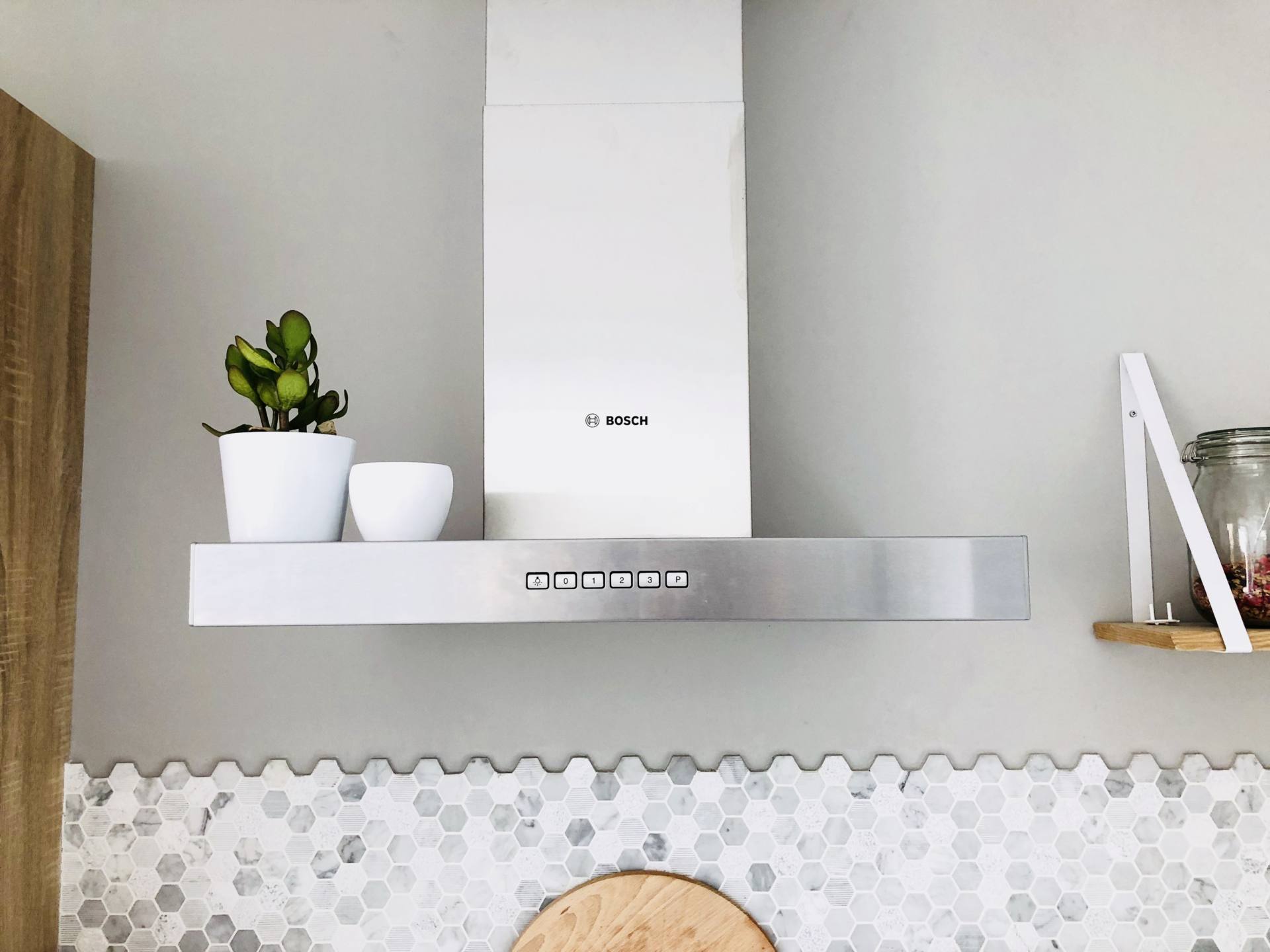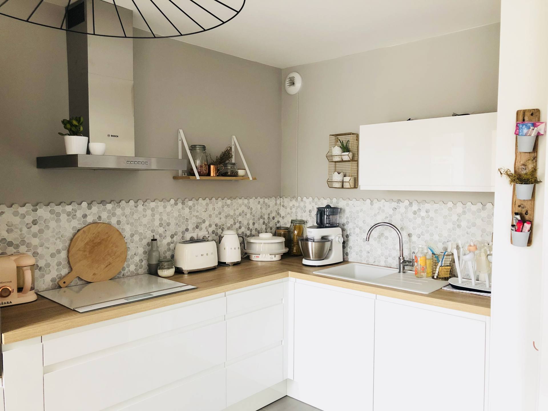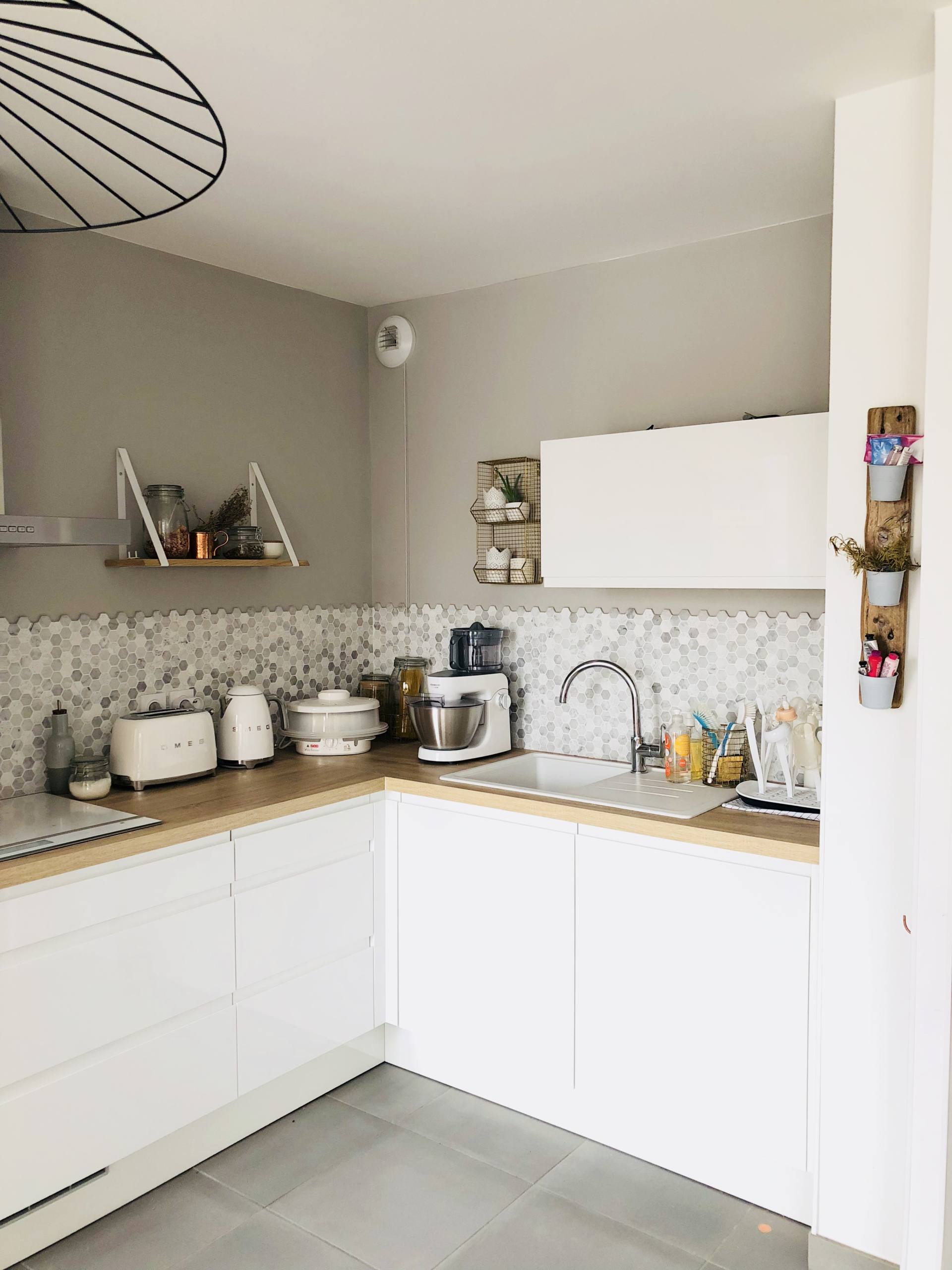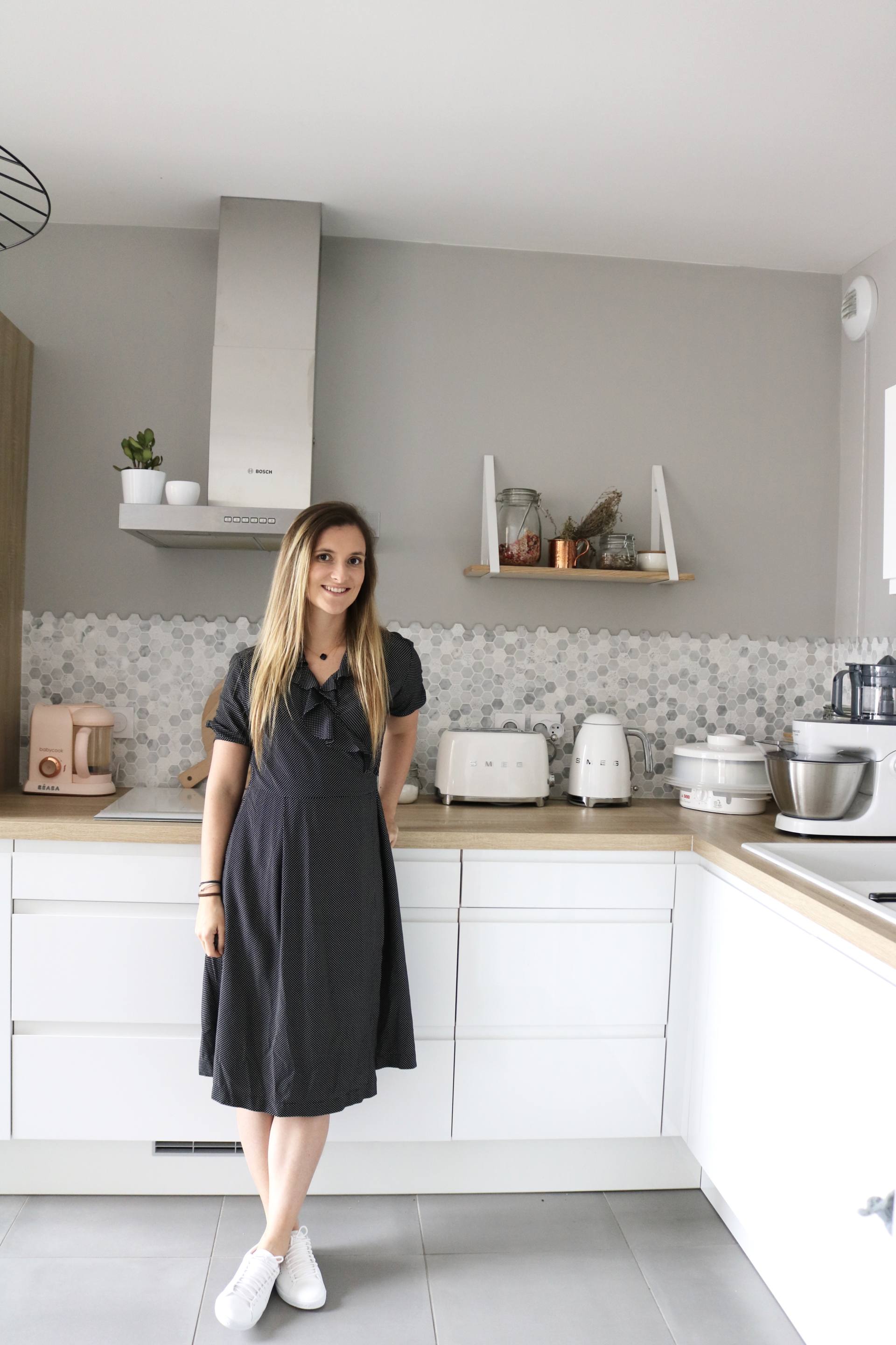 Venons-en au plus intéressant, la décoration de cette pièce. Nous voulions absolument peindre un mur avec du gris. Plus foncé qu’un gris perle, plus froid qu’un gris moyen, qui ne tire surtout pas vers le taupe, une teinte que je déteste. C’est pas évident de choisir une teinte et en allant dans les grandes surfaces, j’avais un problème, les éclairages. Toutes les teintes me semblaient pas correspondre au rendu que je pourrais avoir chez moi. Et on ne peut pas essayer. Du coup, je suis allée à Nice, chez Little Shop of Colors. C’est un atelier près du port où on retrouver un catalogue de teintes immenses. Il y a de tout : des peintures pour les murs, des peintures pour retaper des objets, des peintures classiques ou métallisées. J’étais sûre de trouver mon bonheur. La première fois, je suis repartie avec le catalogue pour en parler avec Stéphane. On avait plusieurs teintes qui nous plaisaient, mais difficile de se projeter sur un carré de 3cm par 2cm. J’y suis retournée, et là, j’ai été ravie car on m’a donné des mini-pots des teintes qui me plaisaient. En rentrant, on a acheté des morceaux de planches assez grands qu’on a peint. Une couche puis une deuxième. Comme si c’était un vrai mur. On a pu se rendre compte du rendu et justement, notre teinte préférée n’a pas du tout été celle qu’on imaginait. Comme quoi, parfois, avoir ce genre de service vaut le coup pour ne pas se planter. Surtout que c’est gratuit ! En guise de crédence, j’avais repéré sur Pinterest des mini-tommettes grises et blanches. Comme toujours, c’est un calvaire pour retrouver ce qu’on a vu dans un magasin. J’ai fait tous les e-shops de France, et même d’Italie pour en trouver. En vain. Et un jour, miracle, mon père est à Castorama et il m’envoie une photo accompagnée d’un “Tiens Maud, c’est pas ça que tu cherches ?”. Castorama … je n’y avais même pas pensé ! Et voilà que mon père me trouve mes mini-tommettes à 11€ la plaque ! Bref, j’étais trop heureuse. Stéphane, je crois qu’il pensait que je ne les trouverais jamais et en était content car c’est une galère sans nom à poser. Il a ceci dit trouver ça canon lui aussi donc on a choisi cela. C’est un copain à lui qui travaille dans le BTP qui nous les a posés. Ca a pris quasiment 2 jours mais il a fait ça à la perfection. On ne voit même pas les délimitations. J’en suis fan de ma crédence. Pour celles qui me demandent souvent, au niveau de l’entretien, c’est juste un coup d’éponge. Mais c’est assez rare car je ne cuisine pas de gras, ça n’éclabousse pas. Et souvent, je n’utilise pas les feux les plus proches du mur. Justement, sur les murs, on a mis une planche en bois avec des montants blancs pour y disposer des pots avec des ingrédients qu’on utilise au quotidien (muesli, herbes aromatiques, graines et fruits secs). De l’autre côté, on a mis cette étagère dorée mais c’est une erreur car cela ne nous permet pas d’y disposer des choses utiles qui permettent le rangement. On va donc sûrement changer cela pour mettre des étagères qui permettront de ranger d’autres pots, ceux qui sont actuellement dans une panière dorée sur le plan de travail. A côté de la plaque, j’ai ce dont je me sers très souvent, un peau de gros sel et l’huile d’olive dans une bouteille que j’ai achetée chez Bolia à Copenhague ! Sur la hotte, pour l’habiller un peu, on a opté pour une plante grasse. Dernier détail, dans le recoin en direction du salon, on a installé un crochet ramené de Stockholm pour pendre les torchons. Au-dessus, j’avais vu cette composition sur Pinterest donc j’ai voulu la même. Mon père nous a trouvé un morceau de bois flotté, l’a retravaillé et a mis des petits gobelets en métal qu’il a peint. Ca permet de ranger des petites choses comme mes crèmes pour les mains, des mouchoirs ou autres. Avec le recul, on aurait pu mettre plusieurs étagères d’anglais pour y ranger des pots. Quant au luminaire, il vient de chez Leroy Merlin et vous pouvez le retrouver ici.