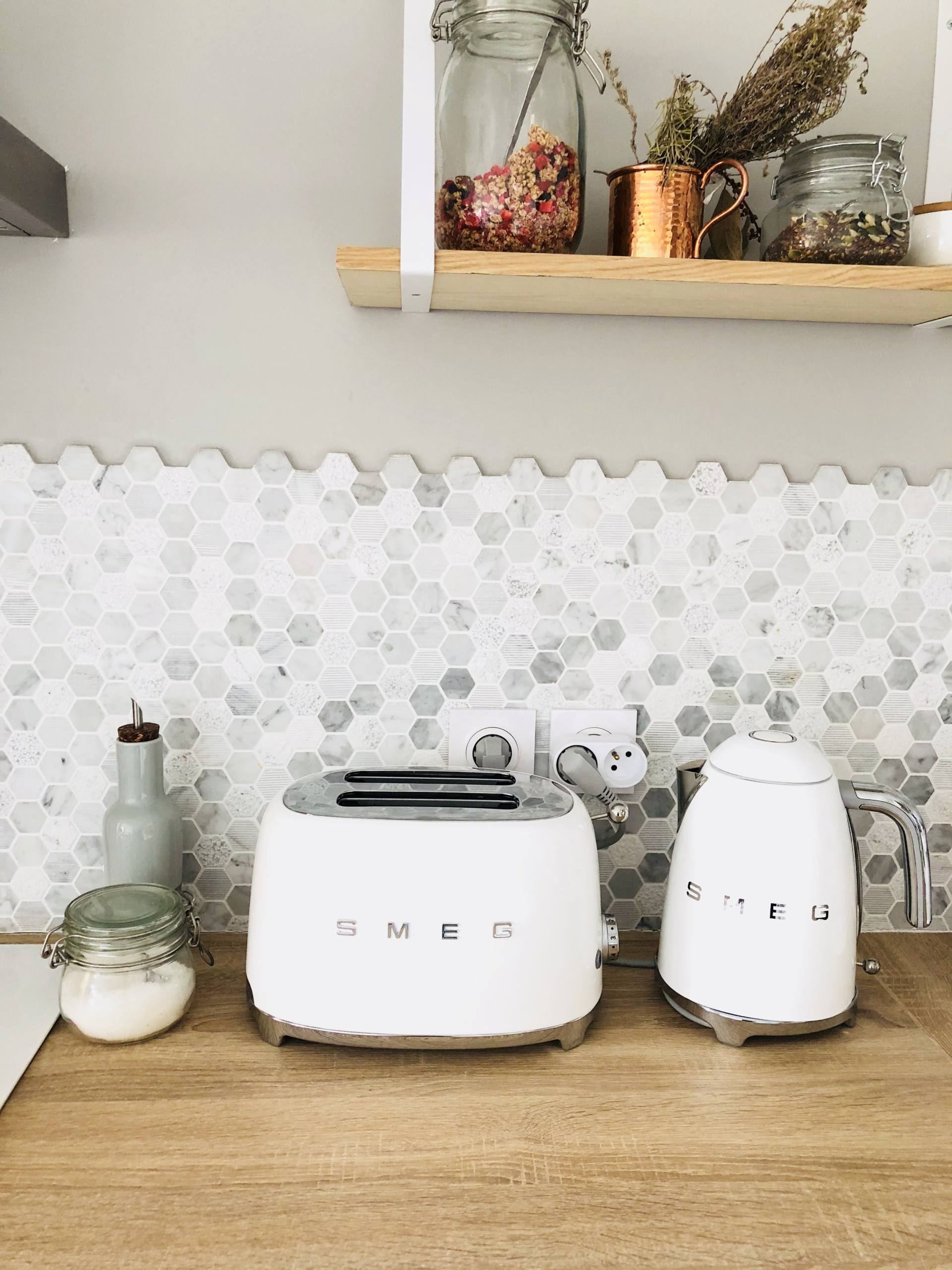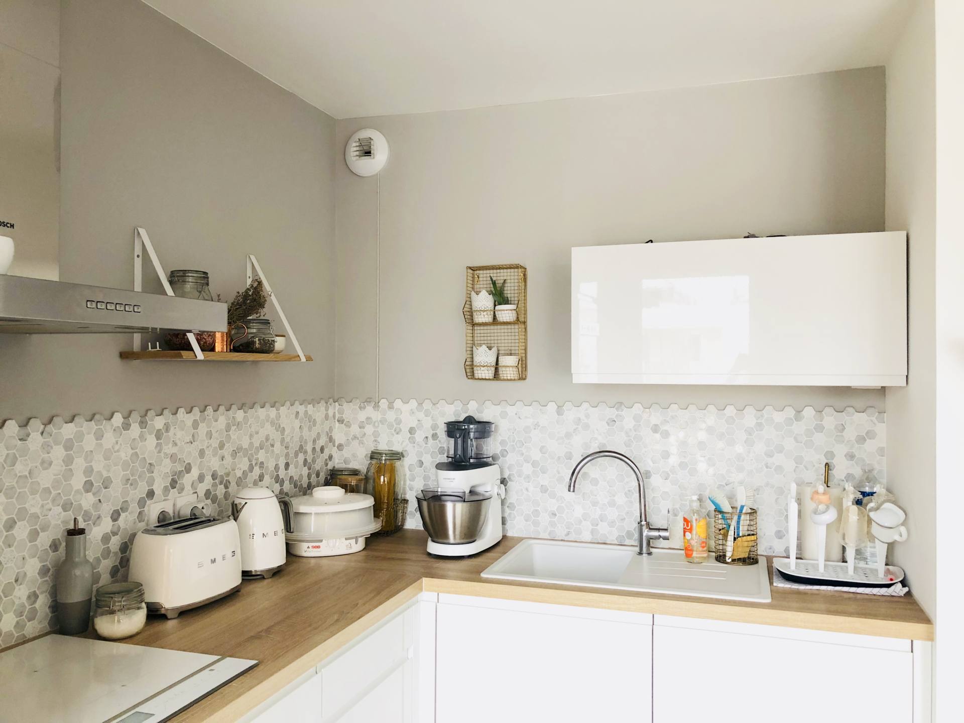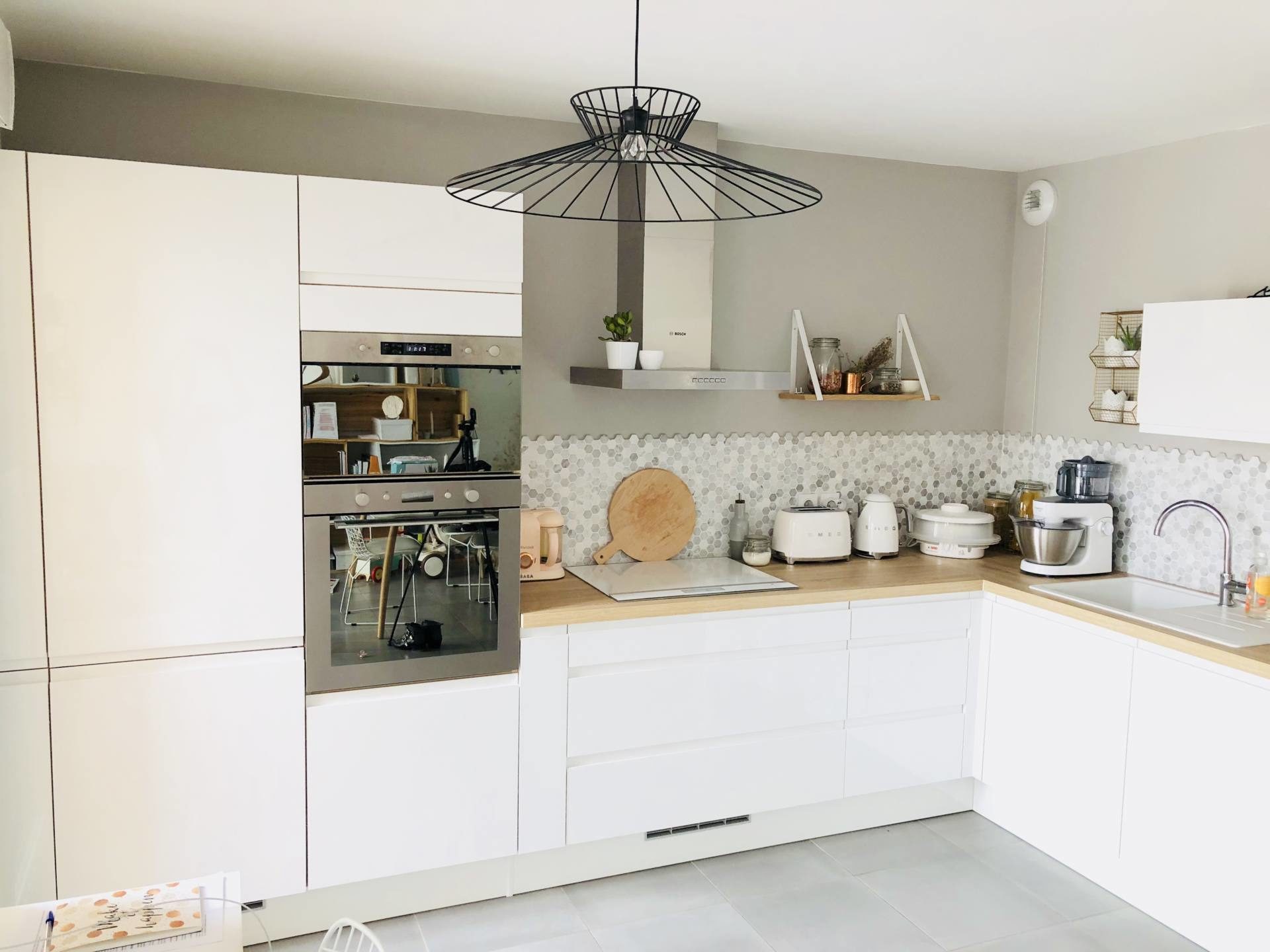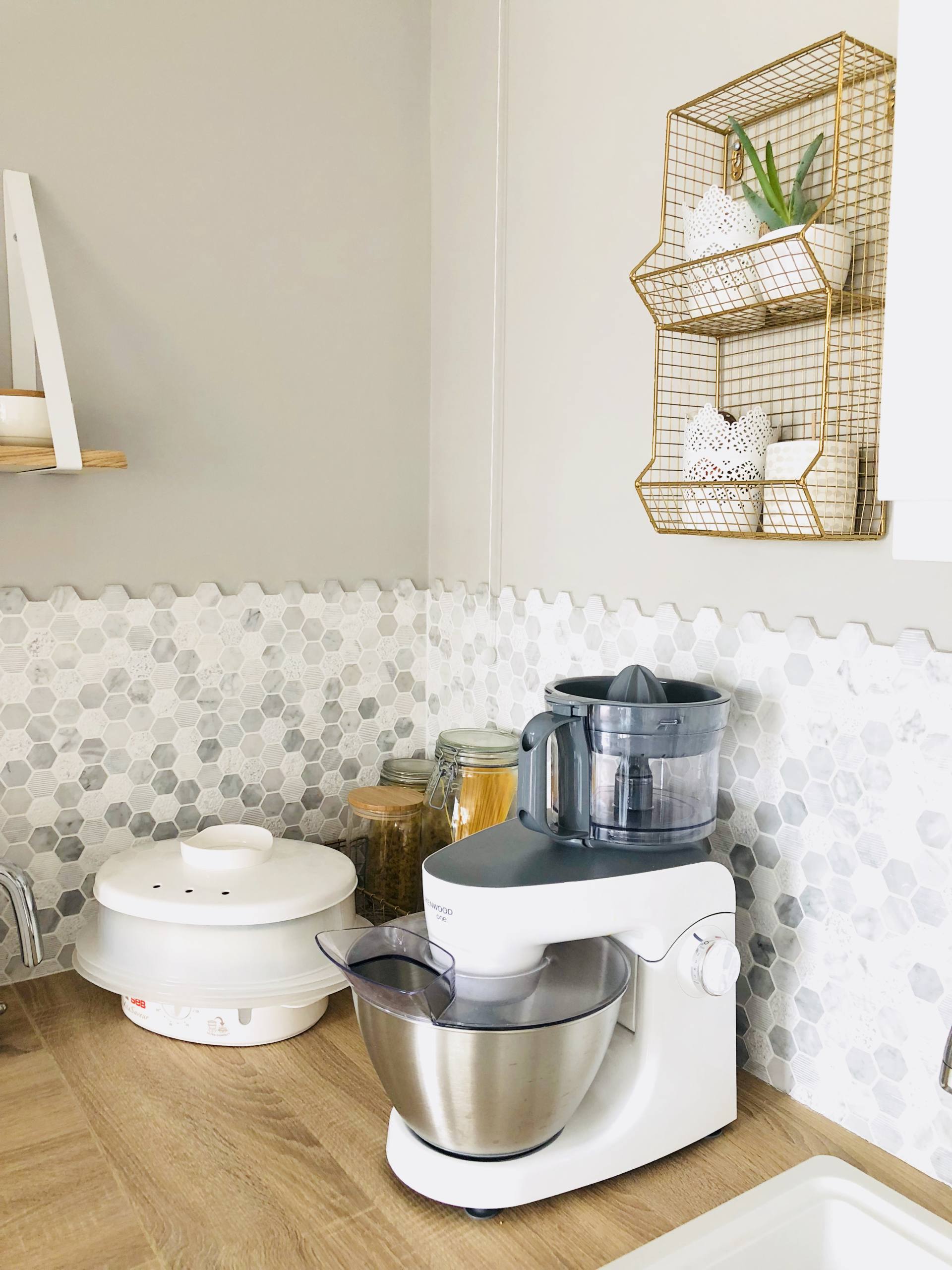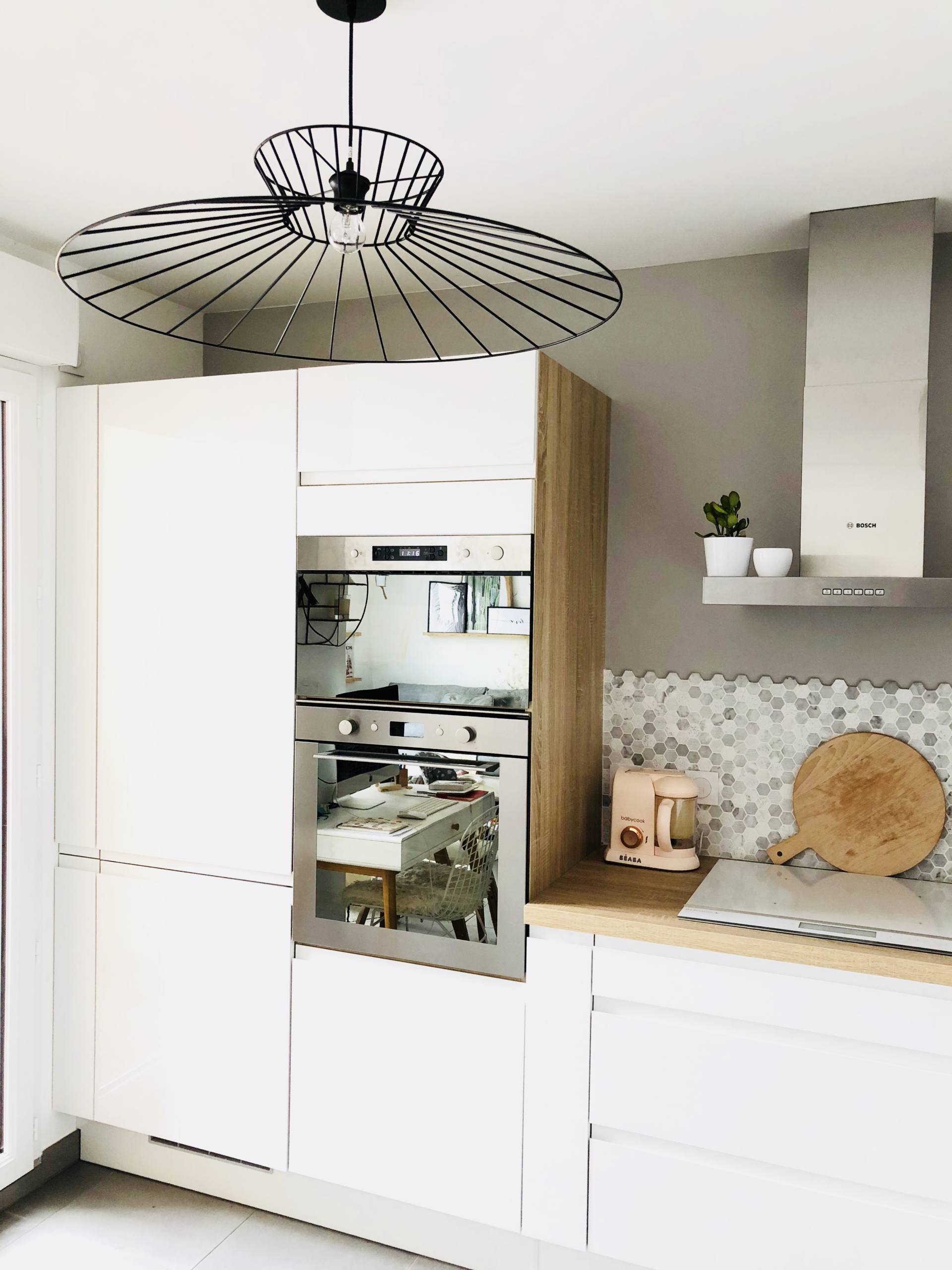 Le rendu est superbe! J’aime beaucoup tes compositions de petits pots/ étagère/ paniers métalliques sur le plan. Ma cuisine aussi est ouverte sur elle salon et pareil, pas d’ilot ni de plan pour garder le volume et je ne regrette pas. On cherche une maison plus grande et je rêve déjà de ma future cuisine, une nouvelle page blanche à aménager c’est top. Je rêve d’un frigo smeg et de la bouillore. Effectivement volumineuse je ne m’en rendais pas compte.