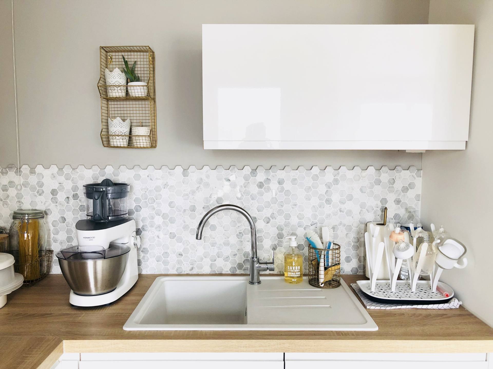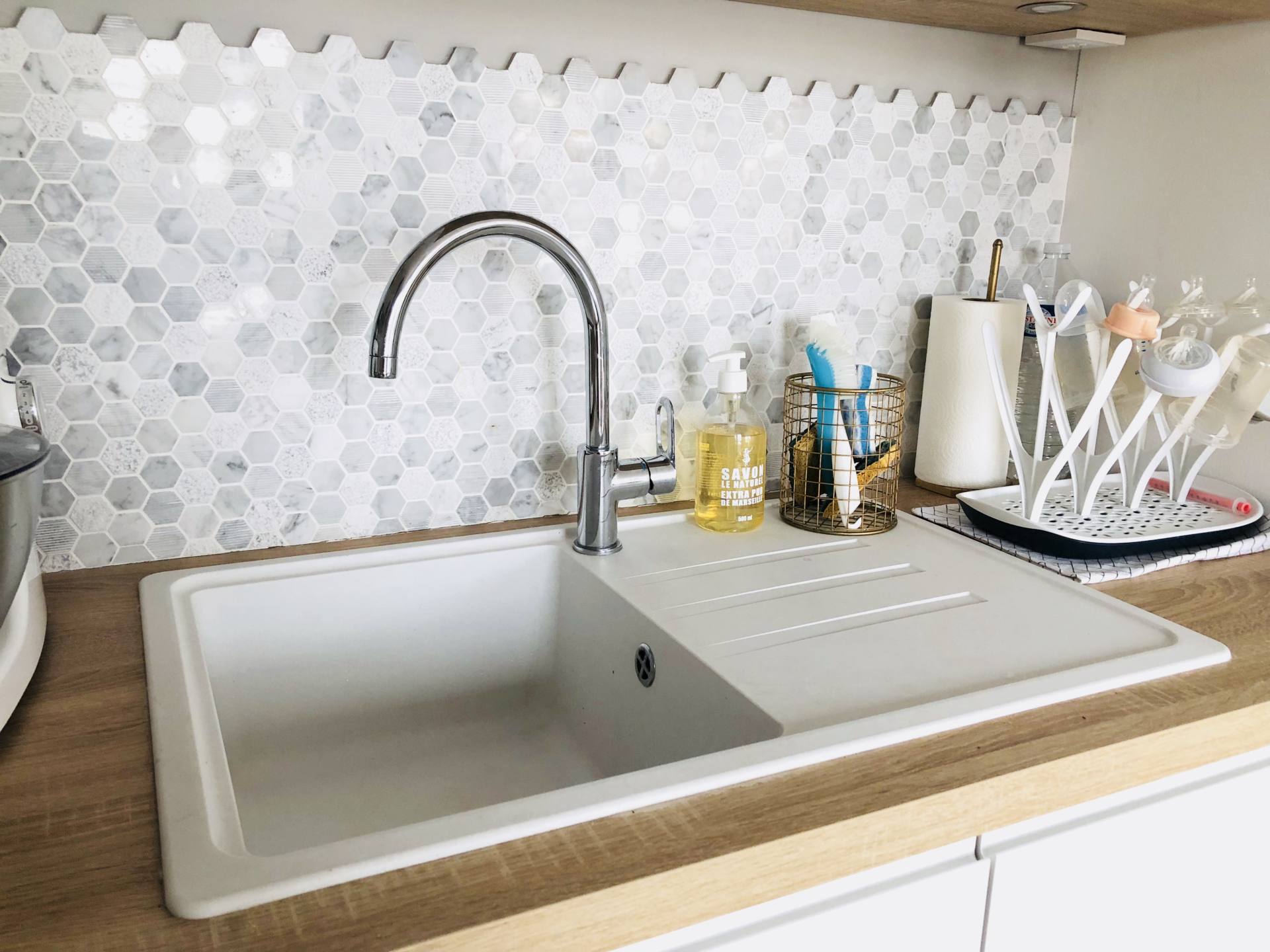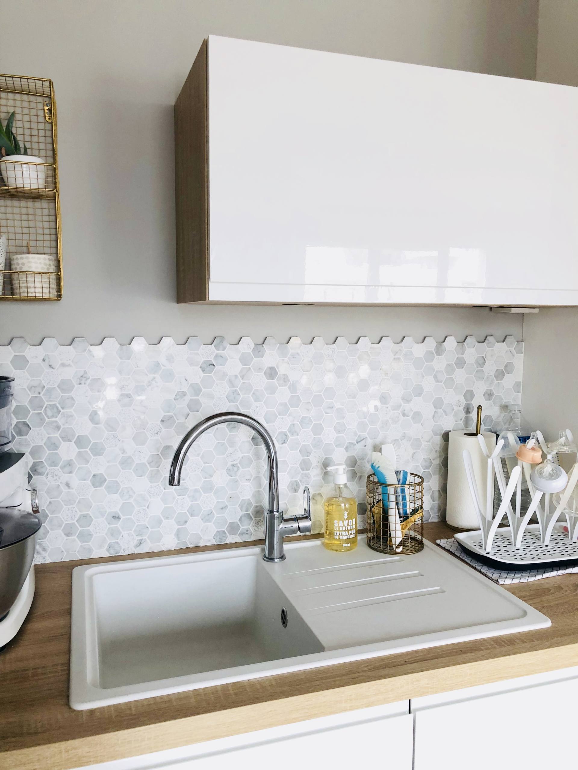Bonjour Maud, très jolie cuisine, raffinée et décorée avec goût j’adore !!!! Pour ton évier je te recommande l’éponge magique de Mr Propre je l’utilise également pour mon évier et j’enlève tout type de tâches, j’utilise celle qui est parfumée ça ajoute un ptit truc en plus