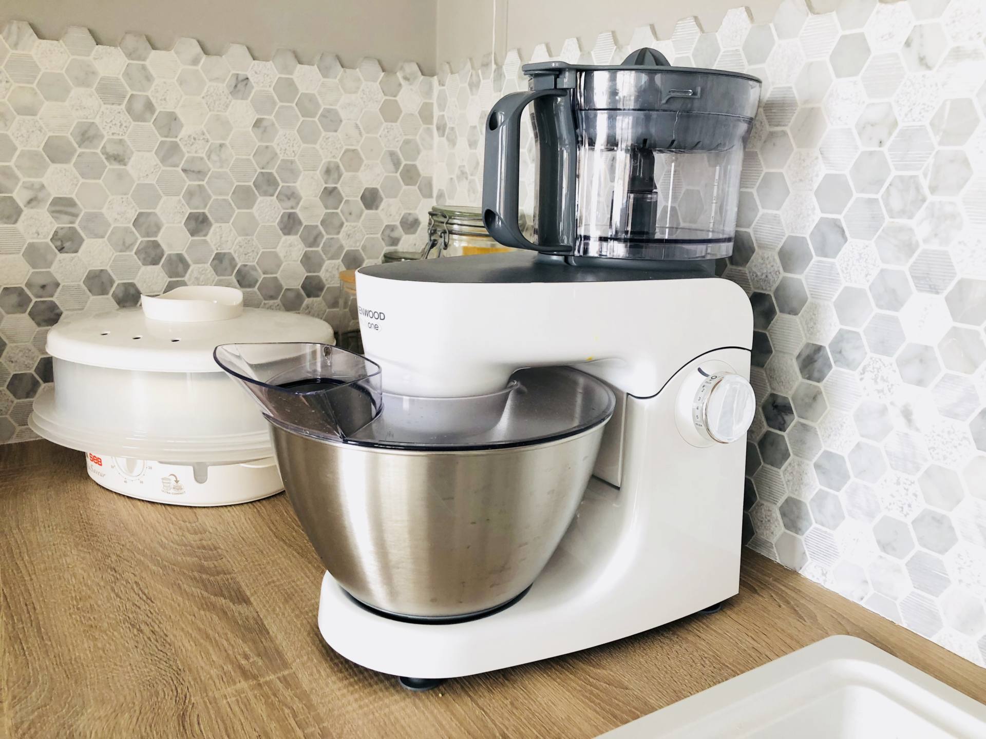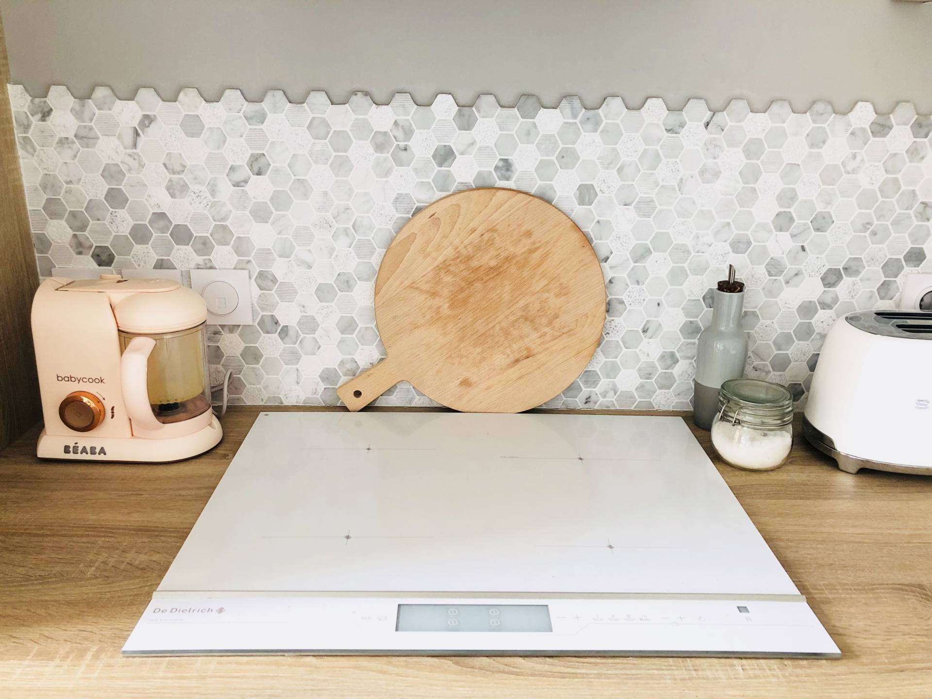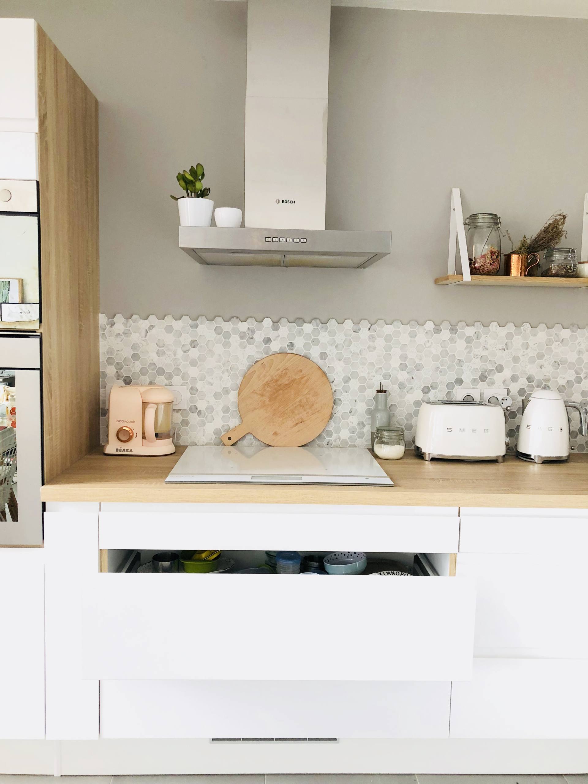 C’est tout ce qui prend de la place sur le plan de travail mais dont on a tout le temps besoin. On a le robot de Louise, celui qu’on utilise le plus. Il s’agit du Baby Cook. On l’a choisit rose poudré pour mettre une petite touche girly. Il est trop beau et il a bien sa place sur le côté. A la base, c’était la place de la bouilloire donc de l’autre côté, c’est un peu envahit. Depuis peu, on a le toaster et la bouilloire Smeg. Ce sont deux pièces très belles dont je rêvais mais c’est assez volumineux, je ne pensais pas ! Néanmoins, aucun regret, ils sont superbes sur mon plan de travail. On a récemment changé notre cuit-vapeur Seb. Il avait 5 ans et on s’en sert chaque semaine. C’est un de nos indispensables. On a trouvé celui-ci chez Leclerc près de chez nous et il est top. Les bacs sont grands et il est beau en blanc. Par contre, une fois complètement replié, il reste plus volumineux que notre précédent et c’est dommage. Depuis peu aussi, on a changé notre robot multifonctions Kenwood. Le précédent avait aussi 5 ans et le bol a cassé, tout comme le hachoir, le presse-agrumes et le blender. En gros, on ne pouvait plus faire grand chose ! J’ai choisi le même dans la nouvelle version. Bonne surprise, il est plus compact et plus mignon, parfait ! C’est effectivement un peu encombrant tout cela mais c’est important de tout avoir à portée de mains, sinon, on ne les utilise pas !