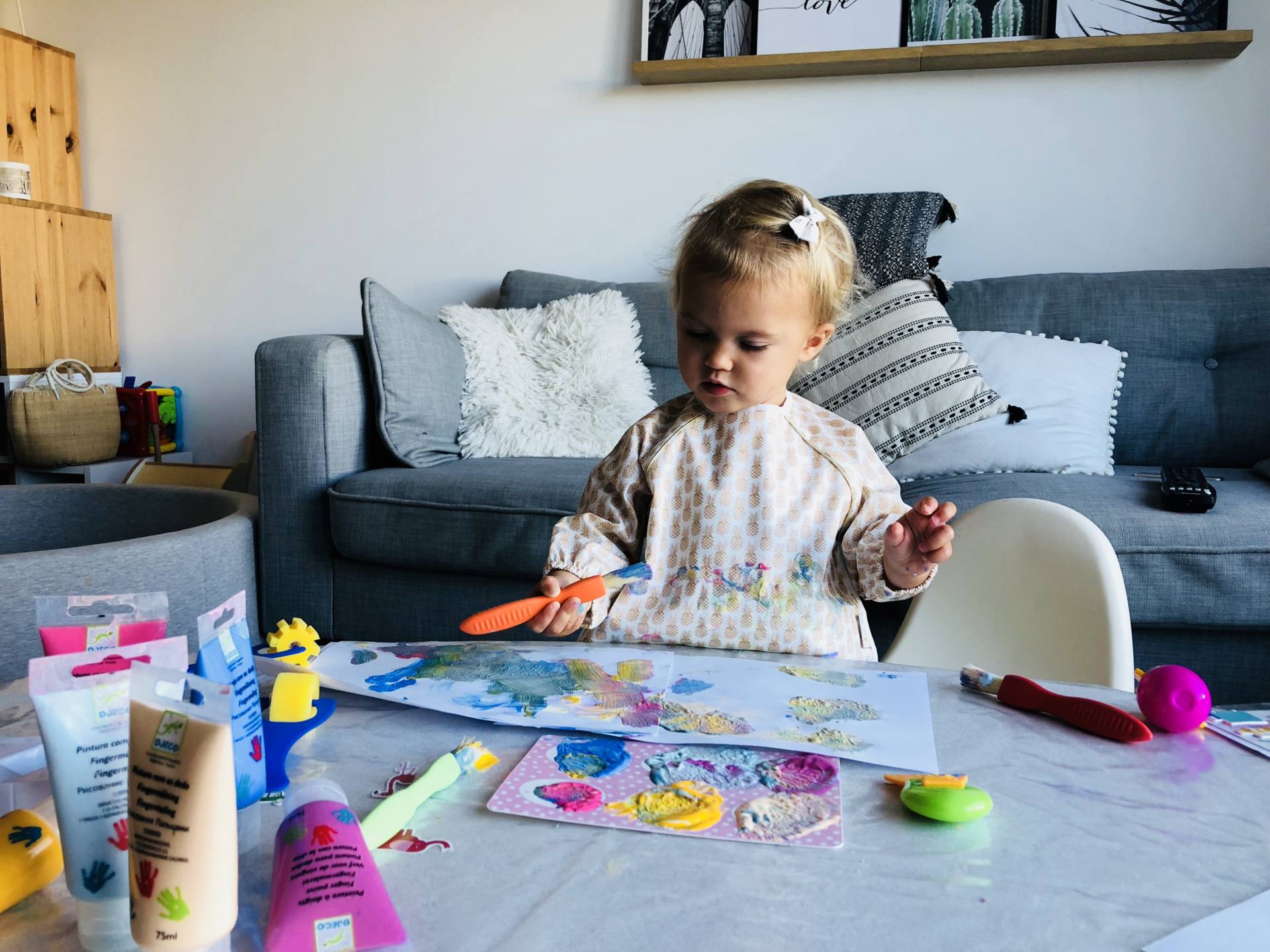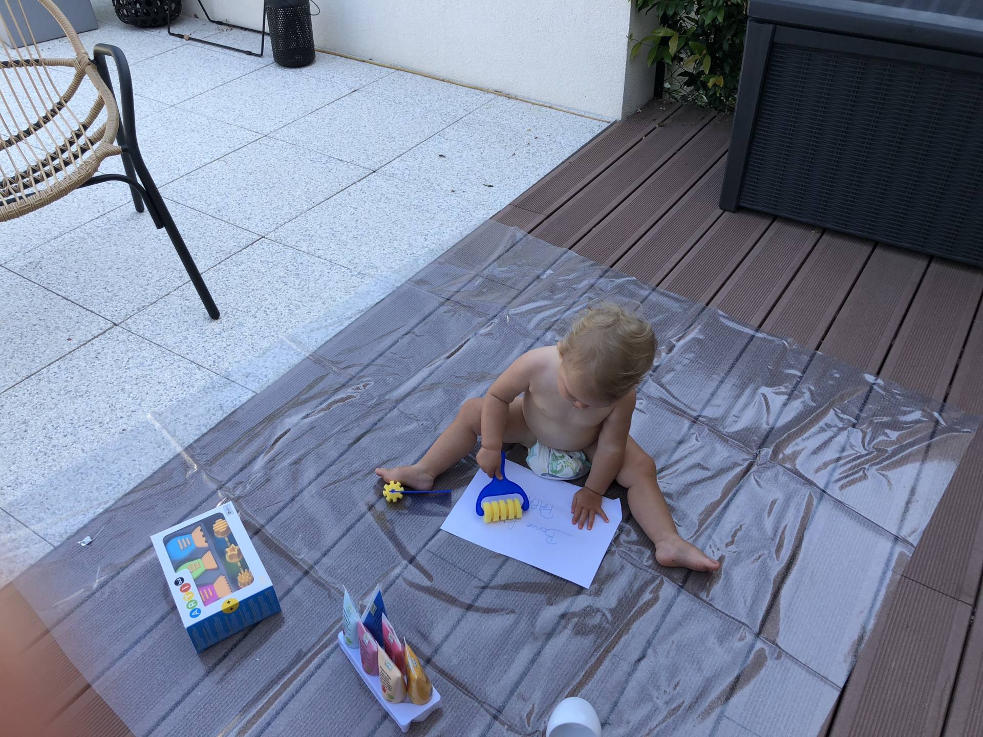 Évidemment, la peinture est aussi de la partie ! On en fait depuis ses 8-9 mois environ. On avait commencer par faire soit de la peinture propre en intérieur (mettre de la peinture dans des pochettes transparentes pour l’étaler sans se salir), soit de la peinture aux doigts avec des accessoires en extérieur ! Dans ces cas-là, je la mettais en couche sur une toile cirée achetée exprès ! Elle fait 2m50 x 2m et c’est l’idéal ! On le fait encore d’ailleurs ! Pensez à avoir un gant, un bol d’eau, voire même la baignoire à proximité pour la rincer ensuite car une fois qu’elle en a de partout, pas facile pour se déplacer ! Plus récemment, on est passé au vrai atelier peinture, avec des pinceaux, des rouleaux, des tubes de peinture, des feuilles. Par contre, je recouvre la table du salon de toile cirée aussi ! Si ça vous intéresse, voici ce que j’ai choisi : la peinture pour 2 ans de chez Djeco en couleurs pastel (les tubes sont énormes, il y en a pour longtemps !), des pinceaux ergonomiques, des rouleaux et des accessoires pour faire des tracés/dessins.