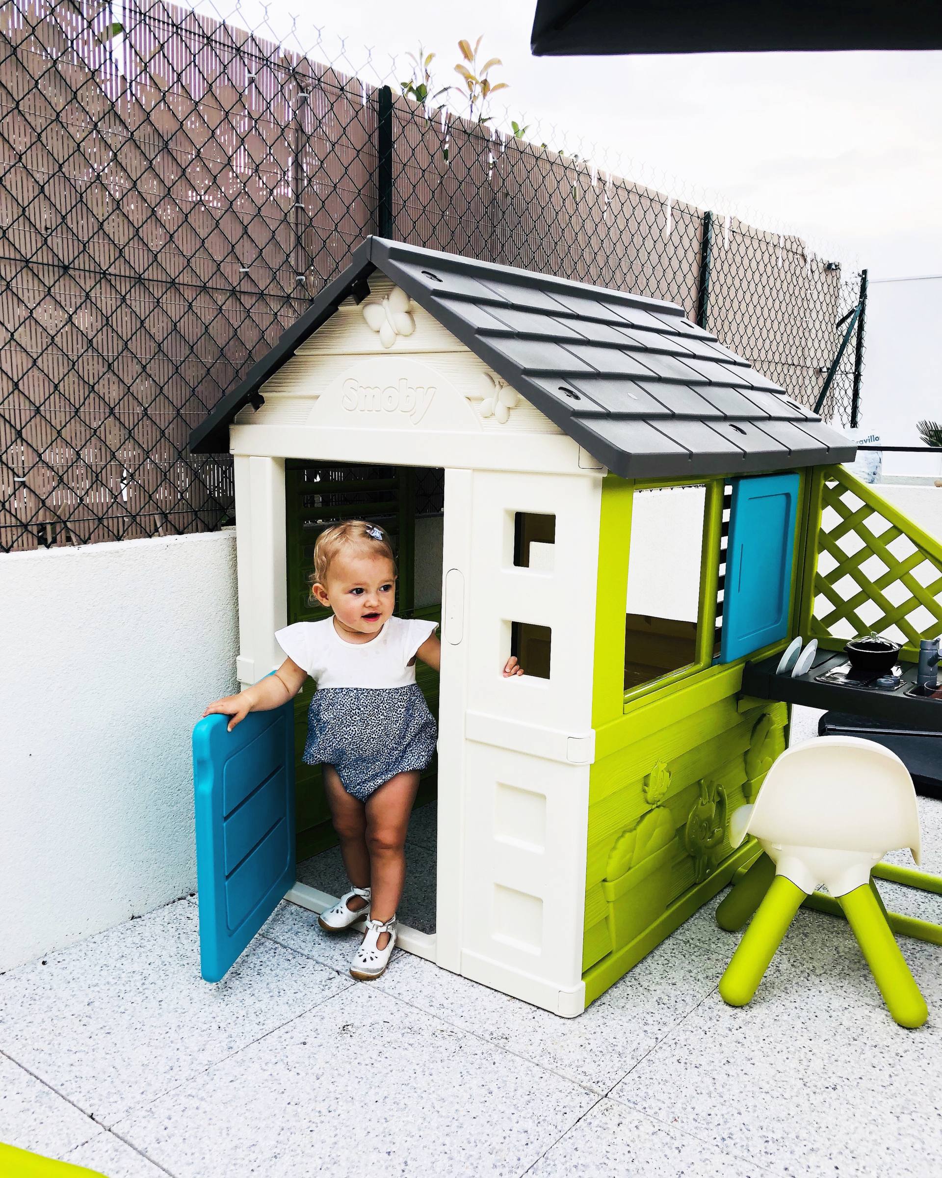 On a la chance d’avoir une grande terrasse donc on lui a réservé un endroit pour elle et notamment pour lui mettre une petite maison avec une cuisine d’été ! Autant vous dire qu’elle adore, elle était en folie quand on lui a installé. Elle rentre, elle sort, elle fait la cuisine, elle sonne à la sonnette, elle fait coucou par la fenêtre, elle est fan !! On a le modèle Pretty de chez Smoby, c’est la plus compacte et c’est suffisant, ce qui lui plait, c’est de rentrer et sortir !! Il y a pas mal de modèles mais si vous avez un espace restreint, sachez que ça ne prend pas beaucoup de places ! Une bonne idée de cadeau de Noël ou d’anniversaire !