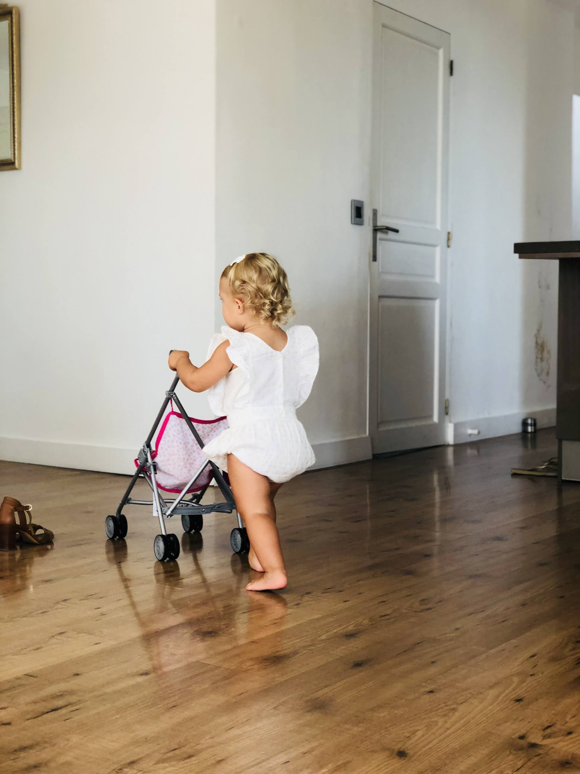 Depuis 10 jours à peine, Louise a une poussette ! On avait un landau en bois qu’elle utilisait assez peu. Mais récemment, chez des amis, elle a vu une poussette. Ca a été la ré-vé-la-tion ! Depuis qu’elle a la sienne, elle ne la quitte plus, elle pleure si on ne l’emmène pas avec nous, elle la demande à peine rentrés à la maison, bref, le grand amour ! On a le modèle liberty de chez Minikane mais on a aussi chez les mamies un modèle chez Oxybul à moins de 10€ ! Vert Baudet aussi en fait à 12€ qui sont mignonnes : ici et ici ! Par contre, elle n’est pas très poupons/poupées, elle les envoie valser ! Ca viendra sûrement !