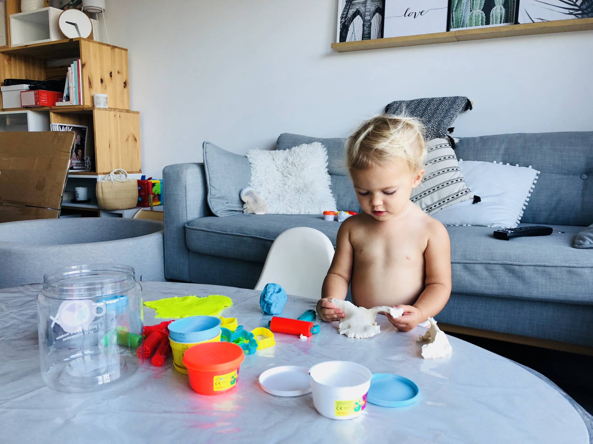 Alors, dans le salon (parce que sa chambre est à l’étage), elle a un gros panier de jouets (que je renouvèle en variant avec ceux de sa chambre où elle est le matin surtout) + une petite bibliothèque avec ses livres + ses “gros jouets type son petit camion et sa poussette. Pour la peinture et la pâte à modeler, les stylos, c’est dans le placard et elle sait où c’est donc en général, elle m’appelle et me dit “Nener” pour dessiner et “Beler beler” pour la pâte à modeler donc je lui sors !