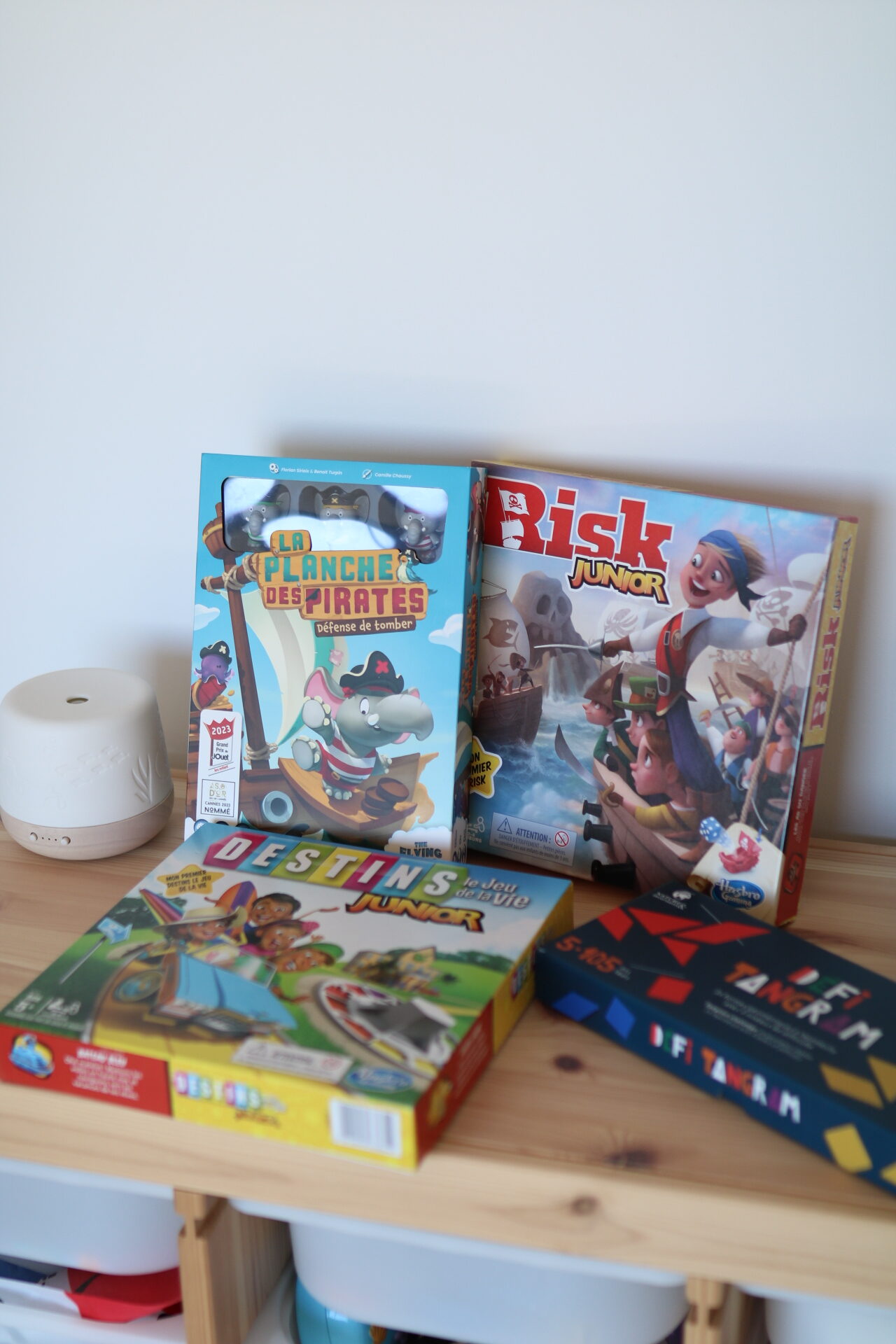 – Risk Junior (Jules aime bien les jeux de plateaux et je trouvais celui-ci sympa, le principe d’être en quête d’un trésor. Il est bien mais vraiment très simple donc il peut même convenir dès 4 ans)