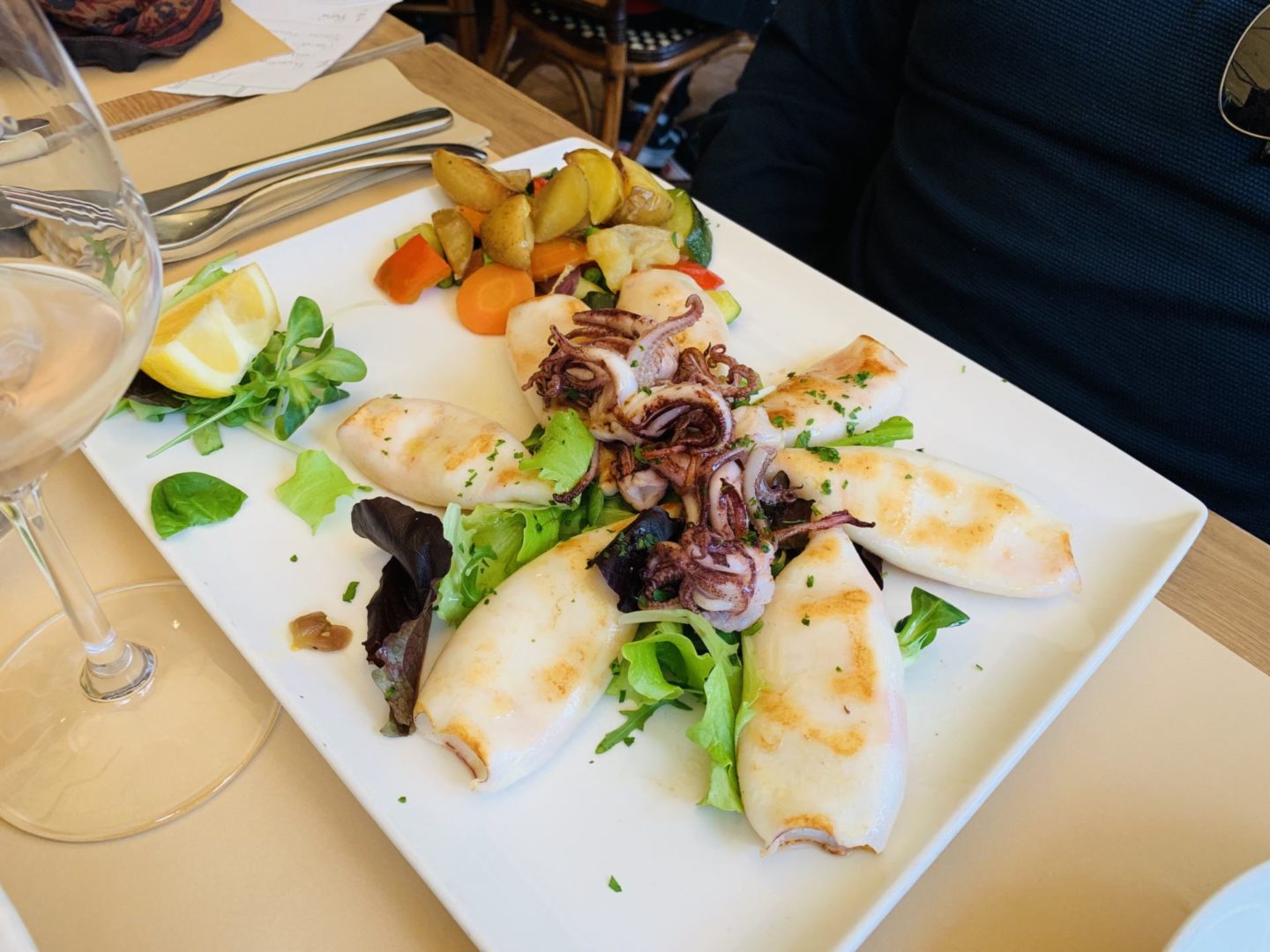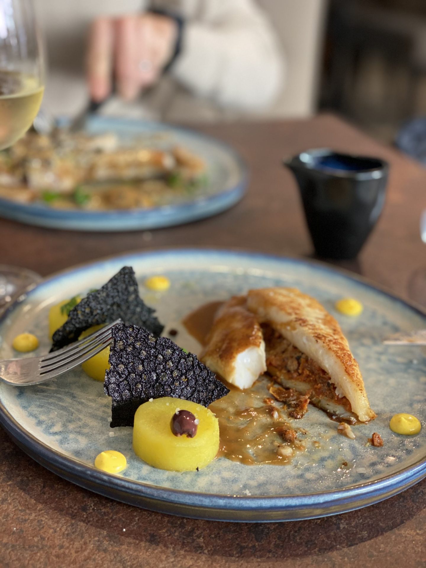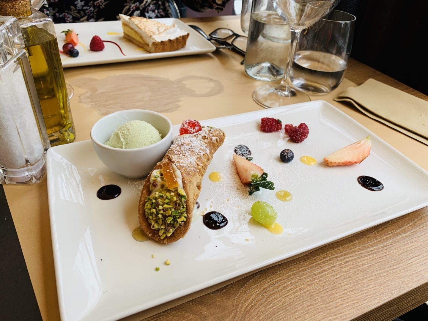 Après cette balade au milieu des agrumes, on s’est dit qu’on déjeunerait à Menton. Petit check sur Tripadvisor, petit message posté sur instagram, et une adresse est vite ressortie : la Trattoria (les premières photos ci-dessous)! Sur le boulevard, pas loin de la voiture, c’était idéal. Et on a eu de la chance, que 20 minutes d’attente. Parce qu’apparemment, c’est une excellente adresse ! Et on confirme ! Pâtes alla norma, calamars grillés, ravioli au pistou, loup grillé, tiramisu, gâteau ricotta/pistache, tout était parfait ! Un régal, à prix très corrects ! Attention, le tiramisu à 9€ est énorme !!! Nous, on a pris ce dessert à deux et ça suffisait ! Quand je suis retournée à Menton récemment, une amie nous a recommandé JR Bistronomie, un restaurant qui venait d’ouvrir (les photos en 2e position ci-dessous). Quelle découverte ! Une cuisine de marché, façon bistronomie, une belle qualité au niveau des ingrédients, une carte de saison, une jolie salle, un super accueil et petit plus pour les parents, un bel espace de jeux pour les enfants avec des livres, un grand tableau, quelques jouets. Tellement appréciable de pouvoir profiter plus longuement du repas sans avoir les kids qui s’impatientent vu qu’ils sont occupés. Côté assiette, on s’est plus que régalés. Du dressage au goût, tout était parfait, rien à redire. En entrée, saumon gravelax pour Stéphane, et tartine chèvre radis huile de noisette pour moi, dingue ! On a continué avec une côte de veau sauce aux champignons pour Stéphane, filet de St Pierre farci avec notamment de la tomate séchée, et pommes de terre fondantes. Pour finir, je n’avais plus de place mais Stéphane a pris le dessert tout chocolat qui était divin car très aéré donc pas trop lourd. Un sans faute jusqu’au menu enfant : filet de bar pané, frites de patate douce, elle a tout mangé !