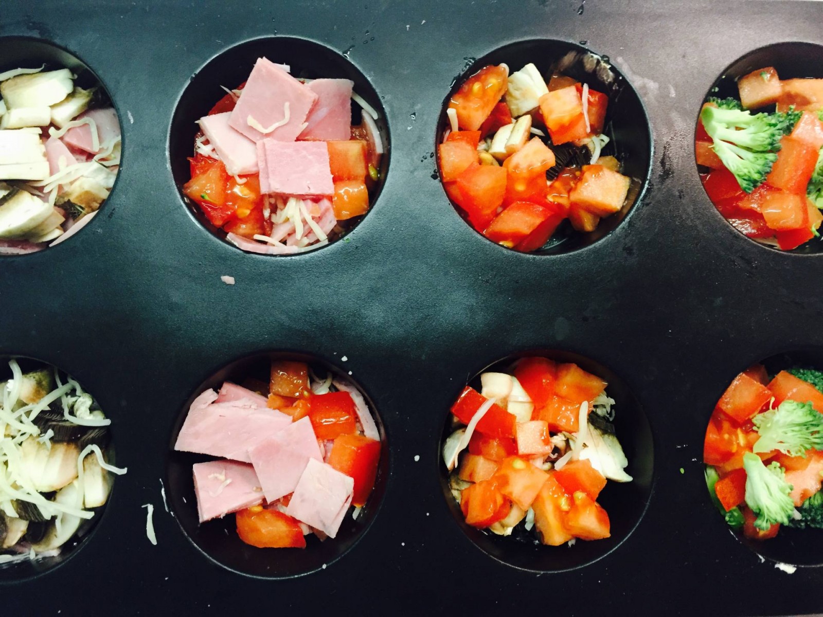 Ensuite, couper tous vos ingrédients en petits dés ou morceaux. Puis mettez les dans vos moules préalablement légèrement beurrés, jusqu’en haut. Vous pouvez mélanger les ingrédients. Pour ma part, j’ai fait les mix suivants :