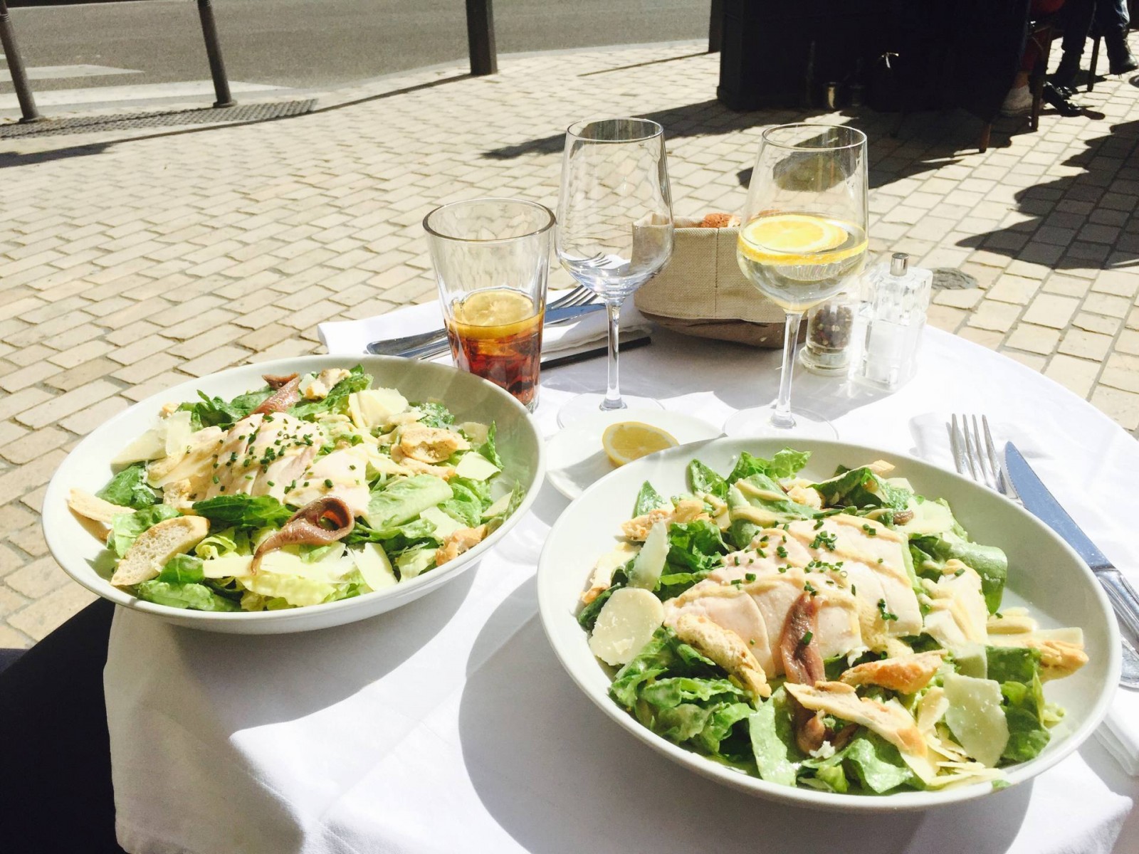 Côté emplacement, on est juste au top. Le restaurant est sur une place et exposé de telle façon à être face au soleil. Du coup, pour les premiers jours de beau temps, c’est vraiment parfait. On a pu manger au soleil et on avait même chaud ! C’est donc un vrai lunch de filles qui a pointé le bout de son nez : salade césar et Badoit ! La salade est au poulet fermier et je dois dire qu’on voit vraiment la différence. La volaille était vraiment hyper tendre. Bon, on a pas pris de dessert mais le thé gourmand avait l’air très bon ! Après un break de près de deux heures à papoter au soleil avec notre salade, l’addition reste honnête en considérant le quartier, l’emplacement et la qualité des produits dans l’assiette. 14,50€ pour ma grosse salade.